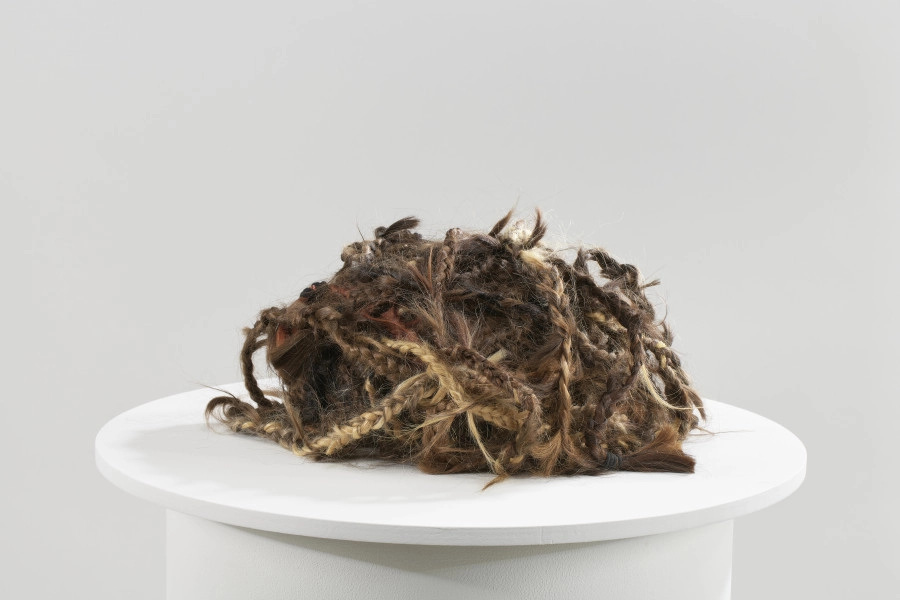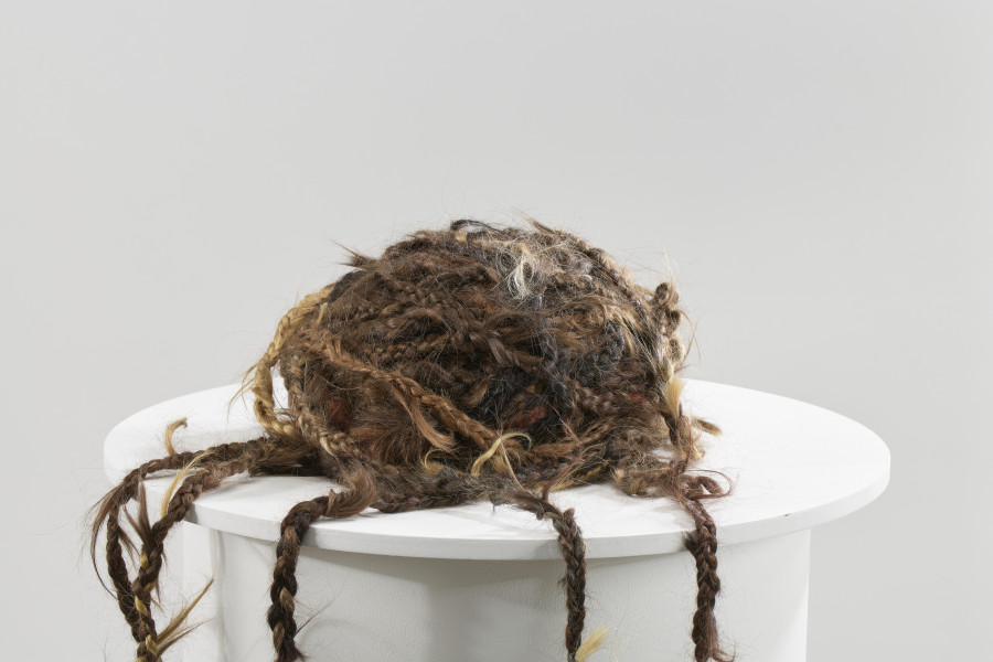 Warkocz to wariant (krótsza forma) jednego z ważniejszych dzieł w twórczości Krystyny Piotrowskiej – Warkoczyka, długiej liny wykonanej z naturalnych włosów ludzkich pozyskiwanych jako odpad z zakładu perukarskiego. Artystka zaczęła pleść Warkoczyk w 2009 r. i nieprzerwanie kontynuuje ten proces (Warkoczyk ma obecnie około 300 metrów). Warkocz jest motywem przewodnim innych jej prac – wątek włosów jest dla artystki z jednej strony symbolem życia i swobody kobiet, z drugiej – upokorzenia i dyscypliny. Włosy splecione w warkocz są wyrazem „grzeczności” dziewczynek i „ułożenia” kobiet w kontraście do rozpuszczonych, postrzeganych jako symbol intymności i seksualności. Ich brak u kobiet jest oznaką choroby, podporządkowania albo też buntu wobec konserwatywnych reguł. W czasie II wojny światowej „dobry wygląd”, czyli jasny kolor włosów, zgodnie z nazistowską ideą rasy aryjskiej mógł uratować życie. W obozach zagłady kobietom tuż przed zagnaniem do komory gazowej strzyżono głowy, by pozyskać włosy jako surowiec. W nazistowskich obozach koncentracyjnych i w sowieckich łagrach strzyżenie do skóry, uzasadniane potrzebami higieny, służyło odczłowieczaniu i odbieraniu godności więźniarkom i więźniom. Po II wojnie światowej goleniem głów kobiet, które były w osobistych związkach z Niemcami, było ich publicznym upokorzeniem. Te wątki możliwe są do odczytania w Warkoczu, który także pokazuje ambiwalencję symboliki włosów. Wywołują one skrajnie odmienne emocje: żywe włosy – troski i zachwytu, a odcięte, martwe – odrazy. Widok sterty obciętych pukli w obozach Zagłady jest jednym z najbardziej wstrząsających doświadczeń dla zwiedzających. Dlatego w Warkoczu, a także w innych pracach artystka miesza kolory włosów i ich faktury. Nie tylko Warkocz i Warkoczyk wykorzystują motyw włosów. Inne prace: wideo Jej włosy (2011), Dywan, obiekty z cyklu Poduszki, które były prezentowane na licznych wystawach indywidualnych artystki. Ta wieloznaczna i wielowątkowa, a jednocześnie niezwykle reprezentatywna dla twórczości artystki praca jest niezwykle ważna dla zbiorów sztuki najnowszej muzeum. | Małgorzata Bogdańska-Krzyżanek
