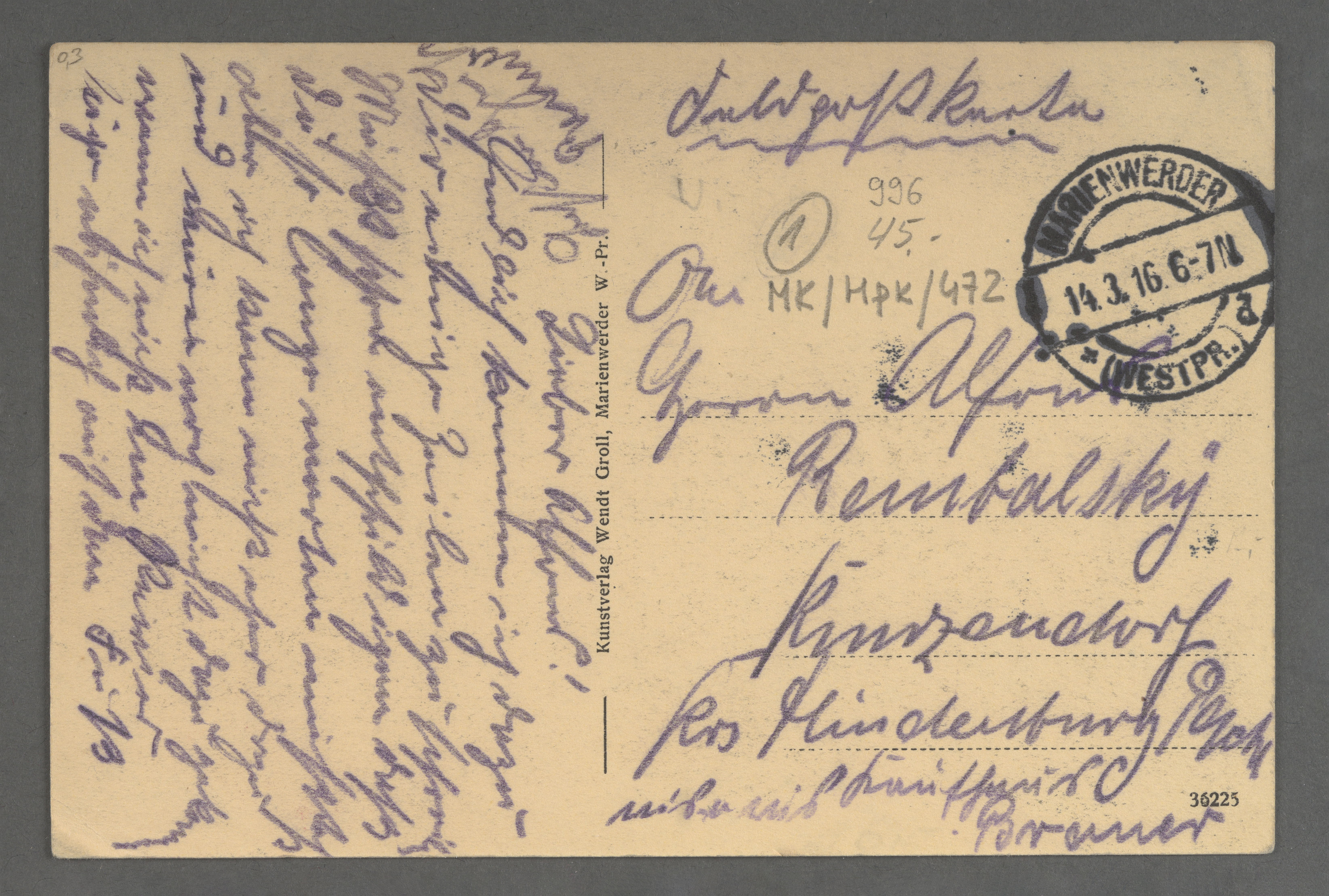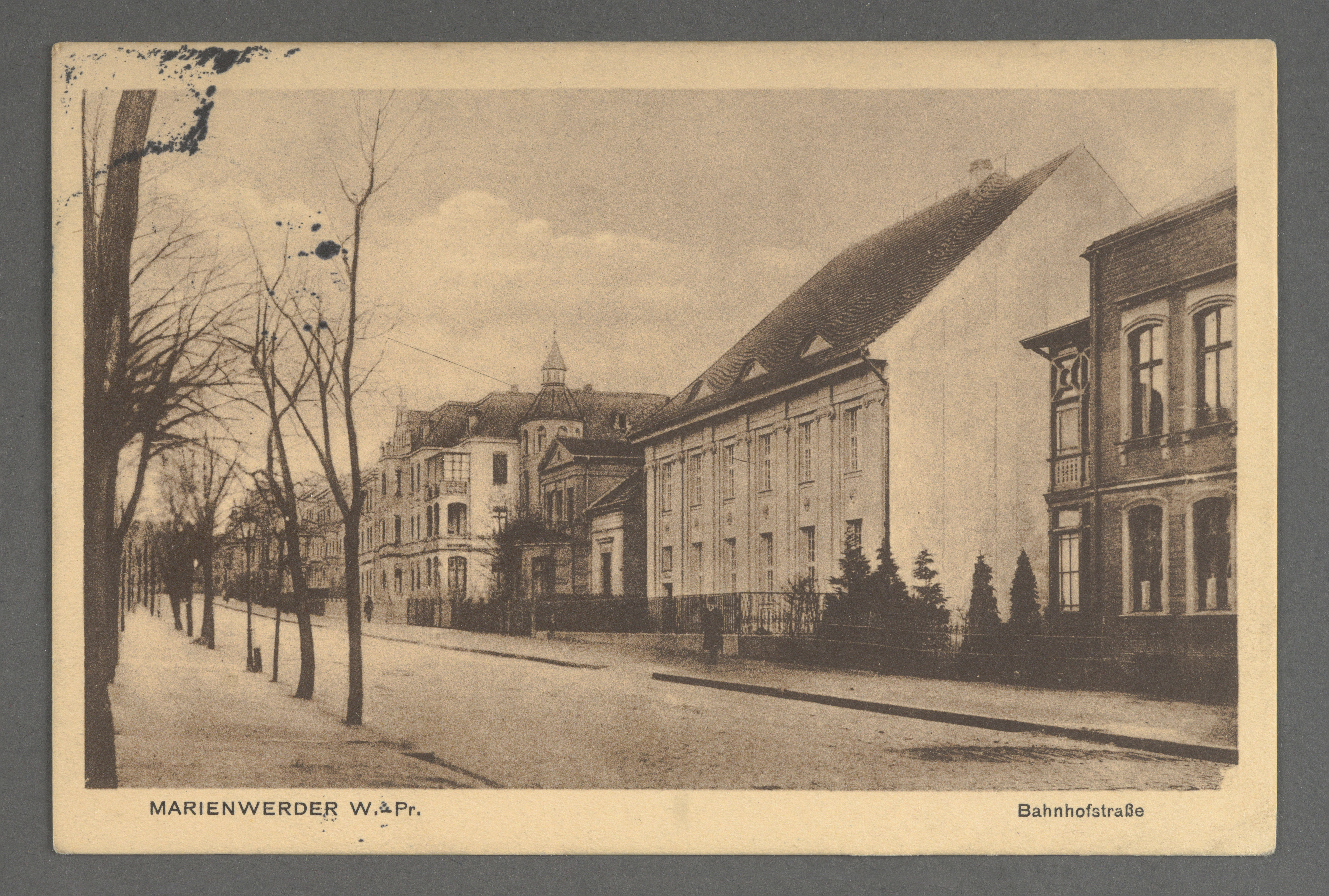 Widokówka „Marienwerder, Bahnhofstrasse” („Kwidzyn, ul. Dworcowa”) ukazuje fragment obecnej ulicy Chopina w kierunku dworca. Adresatem był Alfred Rembalsky z Kunzendorf, Kreis Hindenburg (ob. Kończyce, dzielnica miasta Zabrze). Wysłana została 14 marca 1916 roku, za pośrednictwem poczty polowej. Wydawcą pocztówki było lokalne wydawnictwo i drukarnia Kunstverlag Wendt Groll, Marienwerder, Wpr. Początki tego kilkupokoleniowego oraz wielobranżowego przedsiębiorstwa sięgają 1838 roku. Miało ono swoją główną siedzibę przy Marienburger Strasse 43 (ob. ul. Braterstwa Narodów, budynki już nie istnieją). Oprócz szerokiej działalności drukarskiej i wydawniczej firma zajmowała się także introligatorstwem, produkcją, hurtową i detaliczną sprzedażą wyrobów i artykułów papierniczych oraz sprzedażą mebli, akcesoriów biurowych, a także zabawek dziecięcych. Warto wspomnieć, że Wendt Groll był także wydawcą wielu widokówek, a także reprodukcji dzieł elbląskiego malarza wschodniopruskich krajobrazów miejskich, Paula Emila Gabla.