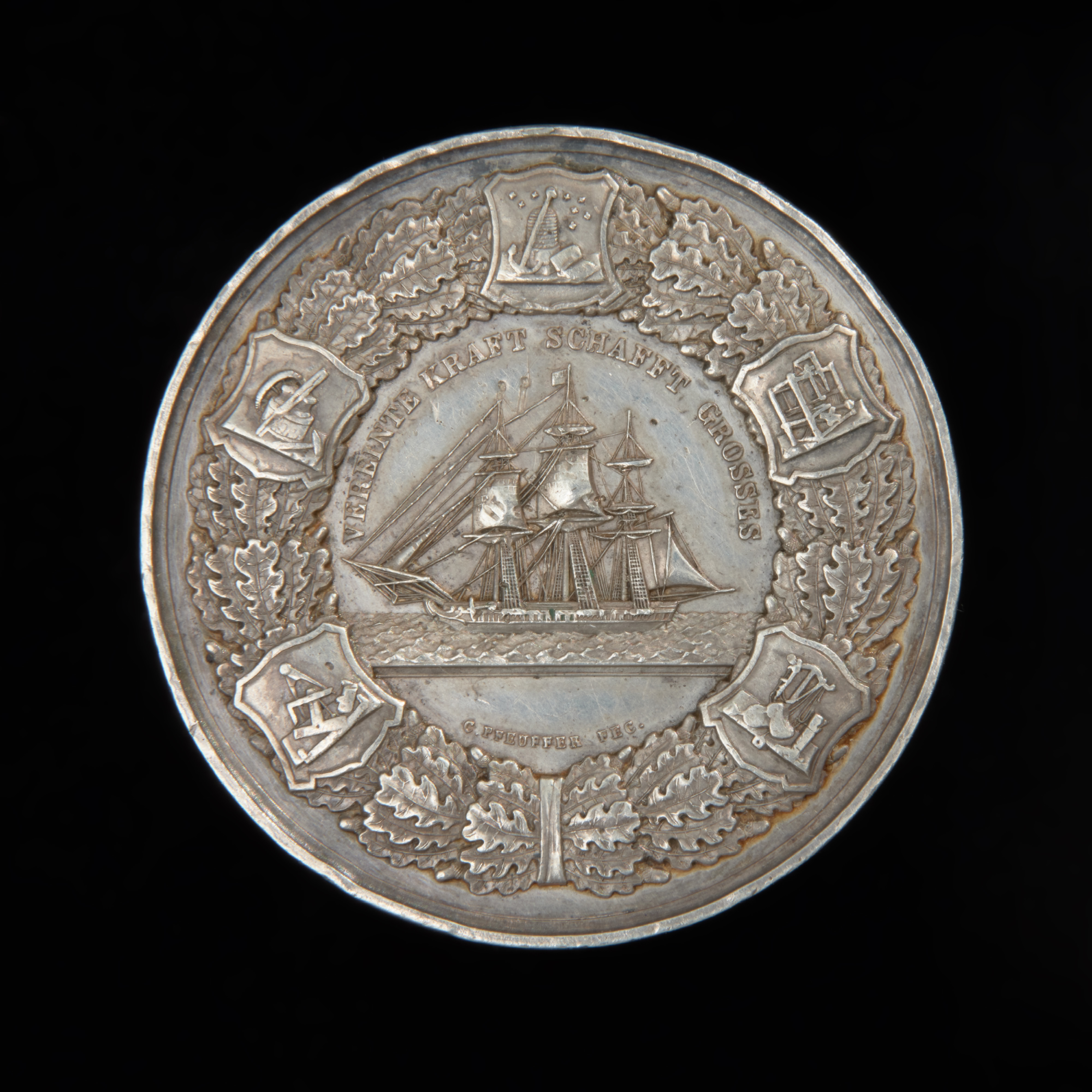 Medal jest dziełem utalentowanego, berlińskiego artysty Christopha Karla Pfeuffera (1801–1861), medaliera dworu królewskiego i głównego medaliera w mennicy królewskiej w Berlinie. Artysta początkowo był związany z firmą medalierską Gottfrieda Bernharda Loosa i medal najpewniej tam został wybity. Wskazują na to stemple, kilkukrotnie później kopiowane i sygnowane również przez Loosa. W zbiorach Muzeum Narodowego w Szczecinie identyczne kompozycje widnieją na medalu Pomorskiego Towarzystwa Ekonomicznego. Grawerowana data 1857 pozwala go wiązać z Wystawą Przemysłową, Rolniczą i Leśną, która została otwarta 18 maja w Szczecinie.