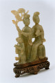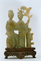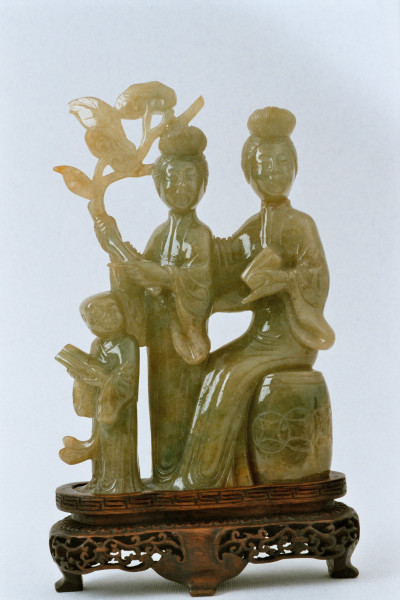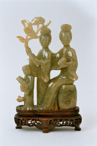 Wyroby z kamieni półszlachetnych należą obok brązów do najstarszych zabytków sztuki chińskiej. Skala barw nefrytu obejmuje od mlecznej i żółtej poprzez seledynową, zieloną, niebieskozieloną aż po ciemnozieloną. Od czasów neolitycznych był to materiał wysoko ceniony w Chinach i uważany za przeznaczony do wytwarzania przedmiotów o charakterze symbolicznym i rytualnym. Wyrabiano z niego również drobne rzeźby i ekskluzywne przedmioty użytku osobistego. Scena wyrzeźbiona w nefrycie jest kameralna – przedstawia kobiety z dzieckiem ze zwojami i ukwieconą gałęzią. Jedna z kobiet siedzi na ceramicznym taborecie ogrodowym w kształcie beczki, ozdobionym na brzuścu motywem przenikających się monet. Taborety takie używane były w Chinach nie tylko jako siedziska, lecz także stawiano na nich donice z roślinami. Stały się również popularne w Europie. Tutaj używano ich przede wszystkim jako siedziska. Stawiano je zarówno we wnętrzach, jak i ogrodach. W zbiorach Muzeum Okręgowego w Toruniu znajdują się takie dwa ogrodowe taborety z początku XIX w., które powstały już w Europie, w Anglii, ale były wzorowane na chińskich. Są to porcelanowe wyroby wytwórni Minton, malowane kobaltem podszkliwnie we wzór stylizowanych kwiatów i wygiętych gałązek, z pasami kwitnących gałązek śliwy. Na brzuścu i na siedzisku wykonano również ażur w postaci dwóch przenikających się chińskich monet.