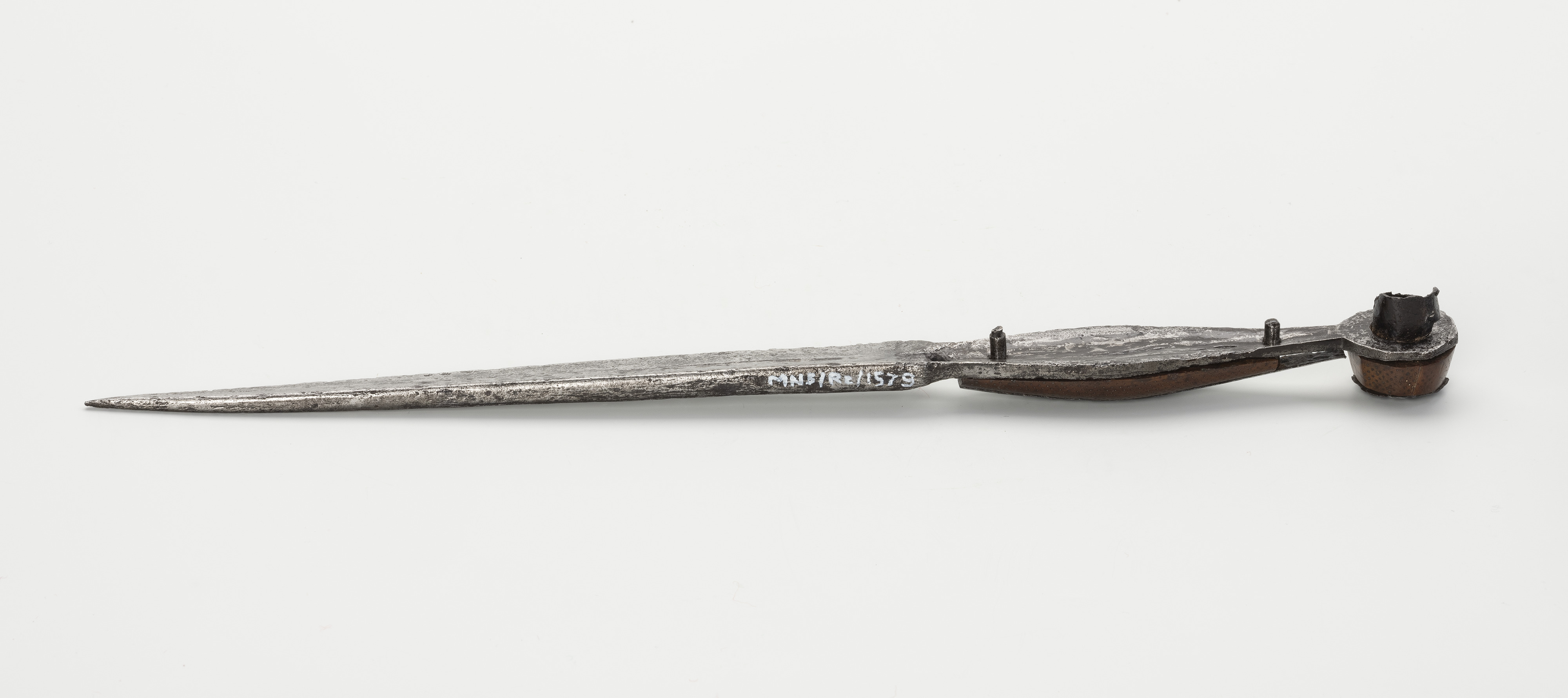 Tego typu nóż, datowany na XV wiek, znaleziono również w Beeskow na terenie Łużyc, podczas prac koparki i obecnie znajduje się w zbiorach Deutsches Historisches Museum w Berlinie. Puginał ze zbiorów Muzeum Narodowego w Szczecinie został wyłowiony w 1890 roku podczas pogłębiania Roztoki Odrzańskiej (niem. Pappenwasser) w okolicach Trzebieży. Znalezisko przekazano wraz z innymi wyłowionymi artefaktami do zbiorów szczecińskiego towarzystwa historycznego, Gesellschaft für Pommersche Geschichte und Altertumskunde (1824–1918), a następnie do utworzonego w 1927 roku muzeum krajowego – Pommersches Landesmuseum in Stettin (1927–1945).