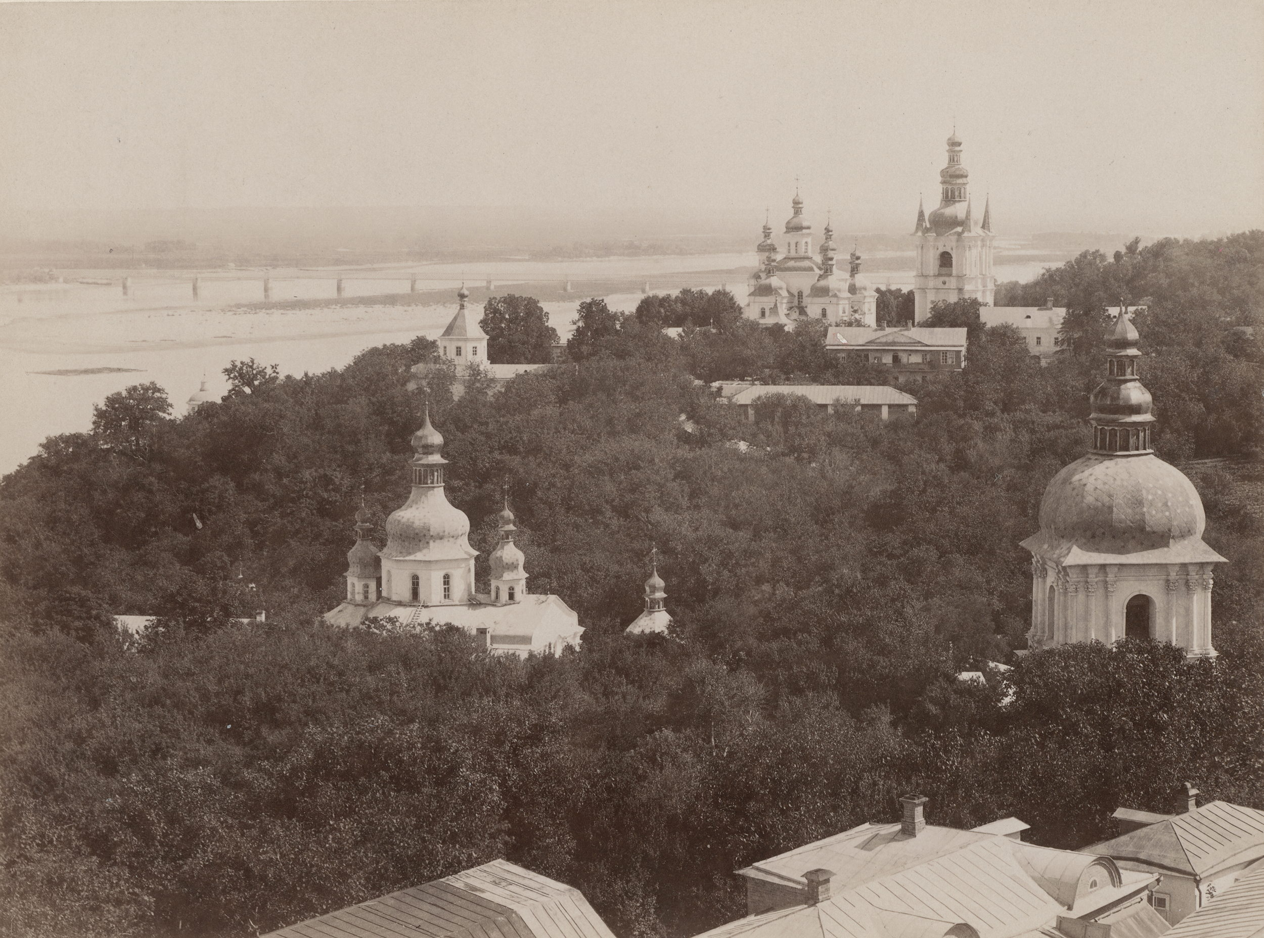 Kadr fotografii obejmuje cerkwie Wielkie Kijowsko-Peczerskiej Ławry dolnej od strony północnej z niewielkiej odległości. Sugeruje to, że zdjęcie mogło być wykonane z tarasu widokowego na terenie ławry górnej, przy nieistniejącej już cerkwi pw. śś. Piotra i Pawła, którą rozebrano w 1893 roku, aby zbudować nową cerkiew refektarzową pw. Świętych Antoniego i Teodozjusza Peczerskich. Z prawej strony kadru widoczna jest dzwonnica nadbramna, zwieńczona okazałym hełmem, należąca do kompleksu murów otaczających ławrę. Po lewej stronie na pierwszym planie ukazano cerkiew Podwyższenia Krzyża Pańskiego usytuowaną nad Bliższymi Pieczarami. W jednej z tych jaskiń życie pustelnicze wiódł święty Antoni Peczerski. W XIX wieku i na początku XX wieku cerkiew Podwyższenia Krzyża Pańskiego stanowiła miejsce pochówku metropolitów kijowskich, zmarłych podczas sprawowania urzędu. W głębi za budowlą ukazuje się cerkiew Poczęcia św. Anny z lat 1809–1811 na Dalekich Jaskiniach, z charakterystycznym dachem wieży w kształcie niskiego ostrosłupa. Znajduje się w niej wejście do pieczar św. Teodozjusza.