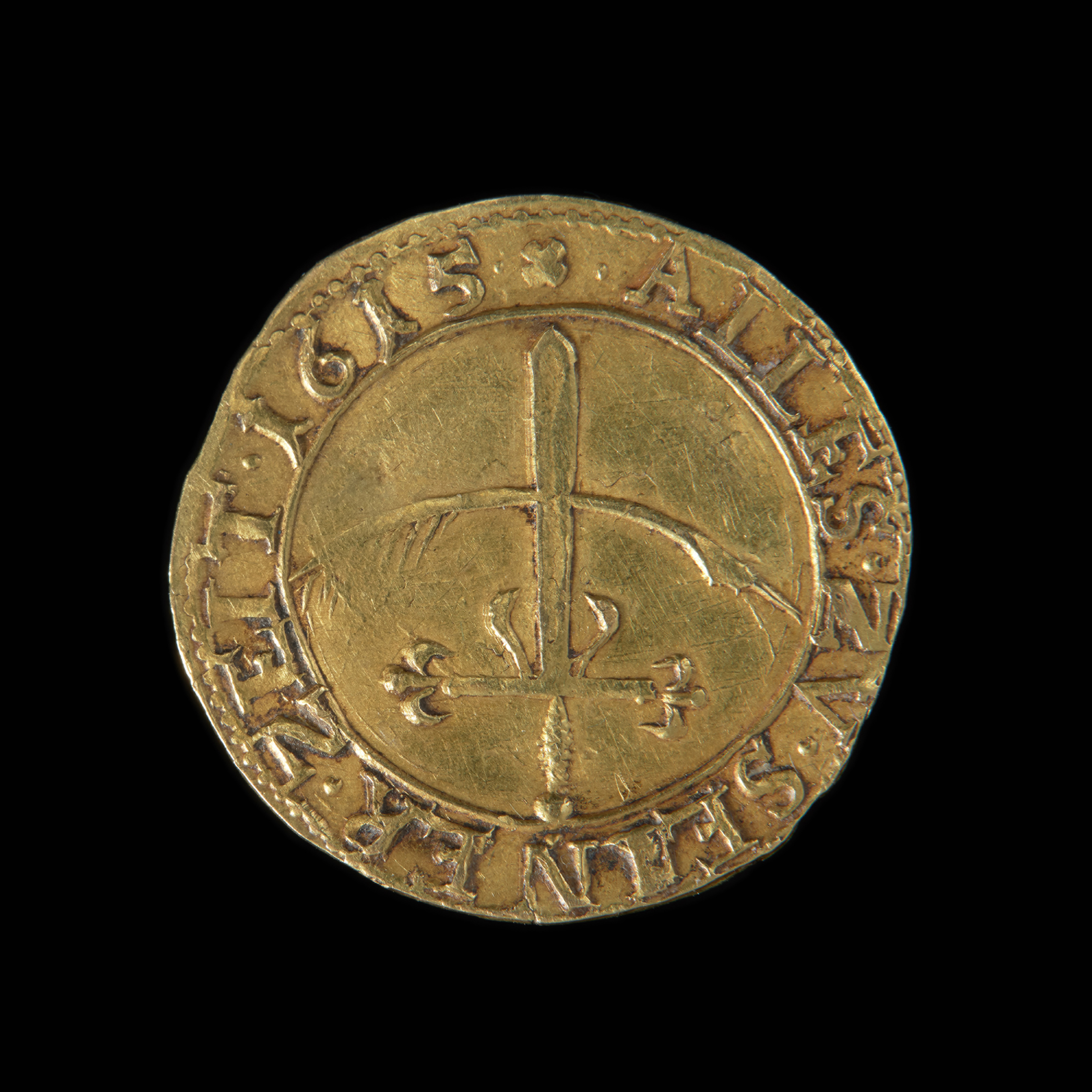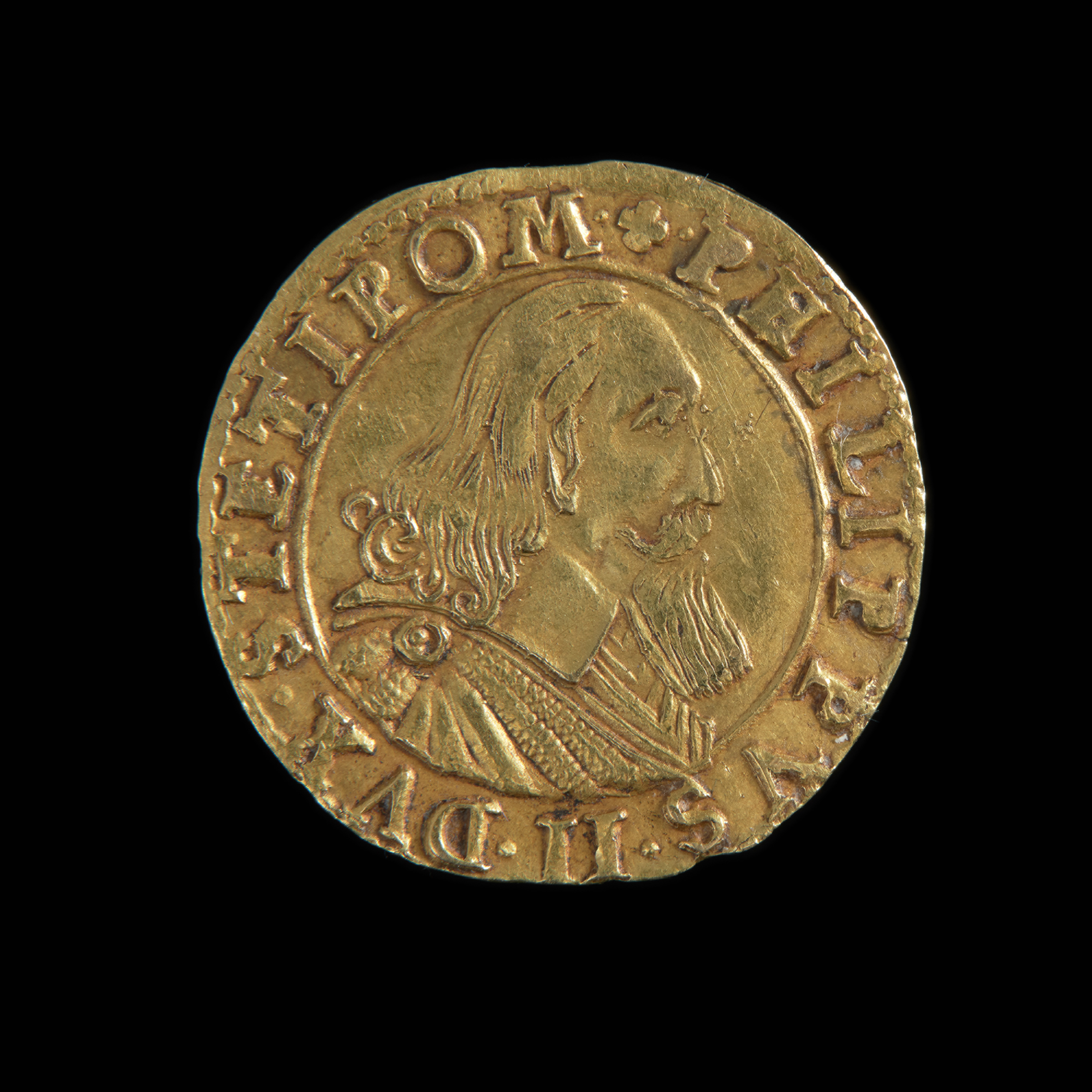 Panowanie księcia Filipa II (1606–1618) zaznaczyło się szczególną obfitością emisji okolicznościowych. Zamiłowanie władcy do sztuki przełożyło się na pasję do kolekcjonowania monet, a także projektowania nowych. Serie guldenów powstałych pod koniec jego rządów (1614–1618) odzwierciedlają nie tylko ówczesne wydarzenia i sytuację polityczną, ale również ideologię panowania Filipa II. Symbole i alegorie umieszczane na rewersach, potraktowane na równi z godłem, są aluzją do wielkiej odpowiedzialności władcy, podporządkowania życia obowiązkowi rządzenia. Monety powstały bezsprzecznie z inspiracji władcy, niektóre pewnie według jego projektów. Prezentowany gulden pod względem przekazywanych treści odwołuje się do ideologii rządzenia państwem (tzw. Regierungskunst). Kompozycji złożonej z dwóch elementów – miecza i pióra towarzyszy sentencja w języku niemieckim. Projekt obrazu został stworzony przez księcia do ulubionego powiedzenia jego matki, Klary brunszwicko-lüneburskiej, alles zu seiner zeit, w okresie rosnącego zagrożenia ze strony buntujących się polskich oddziałów na Pomorzu Gdańskim. Sytuacja zmusiła Filipa II do wydania nakazu utworzenia oddziału 200 muszkieterów, który miał strzec wschodniej granicy księstwa. Pomimo pokojowych celów szlachta protestowała przeciwko zbytnim wydatkom i najmie wojska bez zgody stanów. Emisja guldenów najwyraźniej służyła pokazaniu najważniejszych atrybutów Filipa – wojownika i obrońcy państwa oraz twórcy prawa. Insygnialna funkcja miecza miała symbolizować każdy aspekt władzy wywodzącej się od Boga, a uzupełniona tutaj o pióro kojarzyła się z pisaniem. Gulden nie jest sygnowany, ale wysoka artystyczna jakość wskazuje na augsburskiego złotnika Daniela Sailera, zatrudnionego w mennicy szczecińskiej do produkcji stempli. Egzemplarz muzealny pochodzi z pomorskiej kolekcji niemieckiego kolekcjonera Helmuta Hahna, która w 2013 roku w całości została wystawiona na aukcji w Berlinie.
