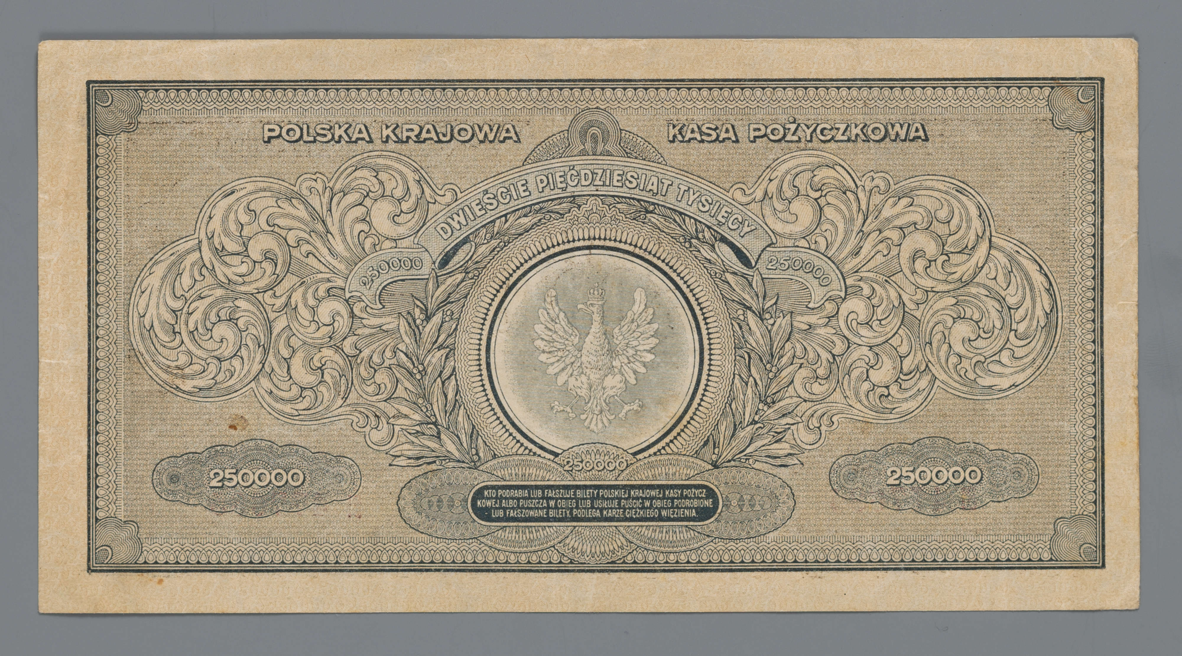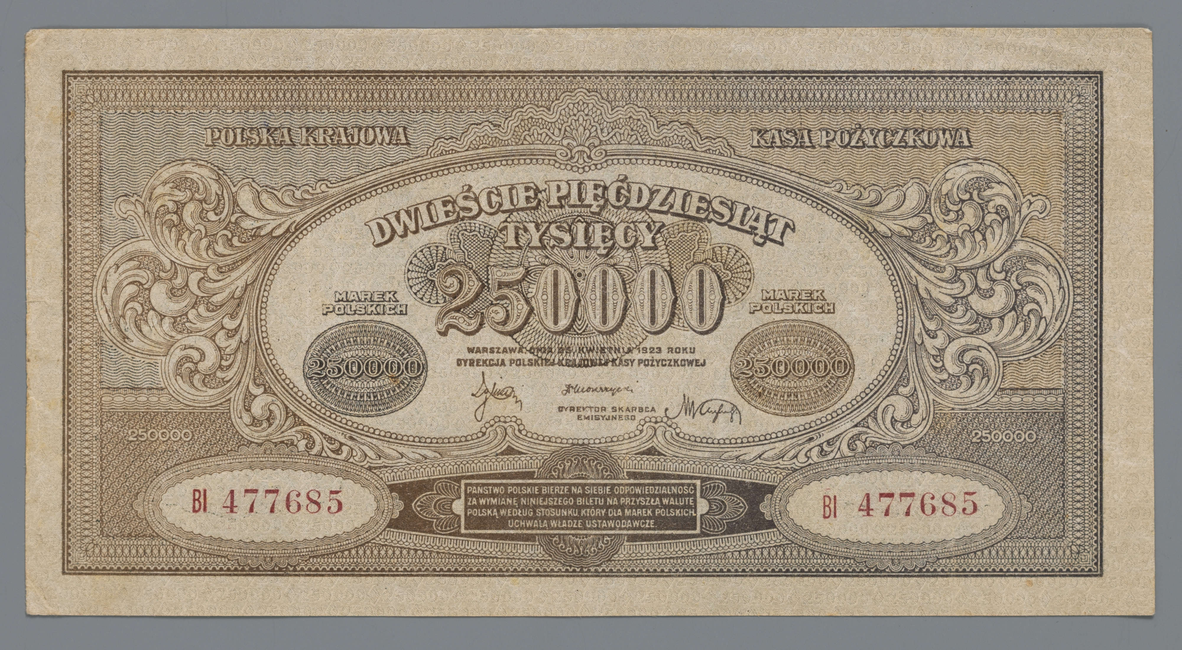 Wprowadzony do obiegu 30 sierpnia 1923 roku banknot 250 000 marek polskich (mkp) zaledwie przez dziesięć tygodni utrzymał rangę najwyższego nominału II Rzeczypospolitej. Jego poprzednikiem w tej roli był walor o wartości 50 000 mkp, będący środkiem płatniczym od stycznia 1923 roku, a następcą 1 000 000 mkp – wprowadzony na rynek 10 listopada. W ciągu niespełna roku nastąpił więc dwudziestokrotny wzrost najwyższych nominałów. Odpowiadało to inflacji mkp wyrażonej relacją tej waluty do dolara. O ile na początku 1923 roku dolar kosztował 17 800 mkp, to w końcu listopada już 350 000 mkp. Jesienią 1923 roku bardzo wysoka dotąd inflacja przeszła w hiperinflację, osiągając w październiku rekordowe tempo 360% miesięcznie, czyli niemal 12% dziennie. Tak dynamiczny spadek waluty uderzał w gospodarkę, powodował bezrobocie i spadek wynagrodzeń. Wzmagało się społeczne niezadowolenie, wyrażane w manifestacjach i coraz częstszych strajkach.