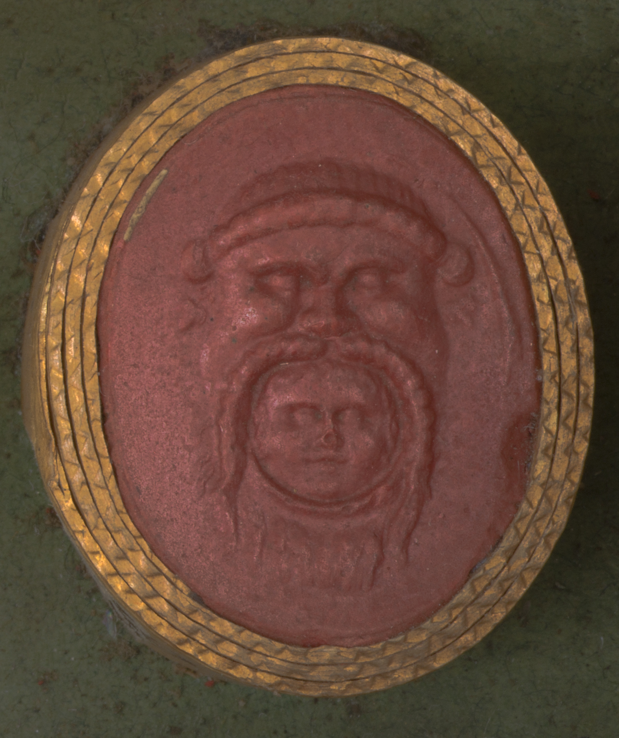 Na owalnym, wypukłym wycisku gemmy, na wklęsłym tle widnieje maska przedstawiająca głowę brodatego mężczyzny, z otwartymi szeroko ustami, przez które wygląda rzymski bóg miłości Kupidyn pod postacią dziecka. Wycisk jest identyczny jak opisany w „Dactyliothecae universalis” Philippa Daniela Lipperta.