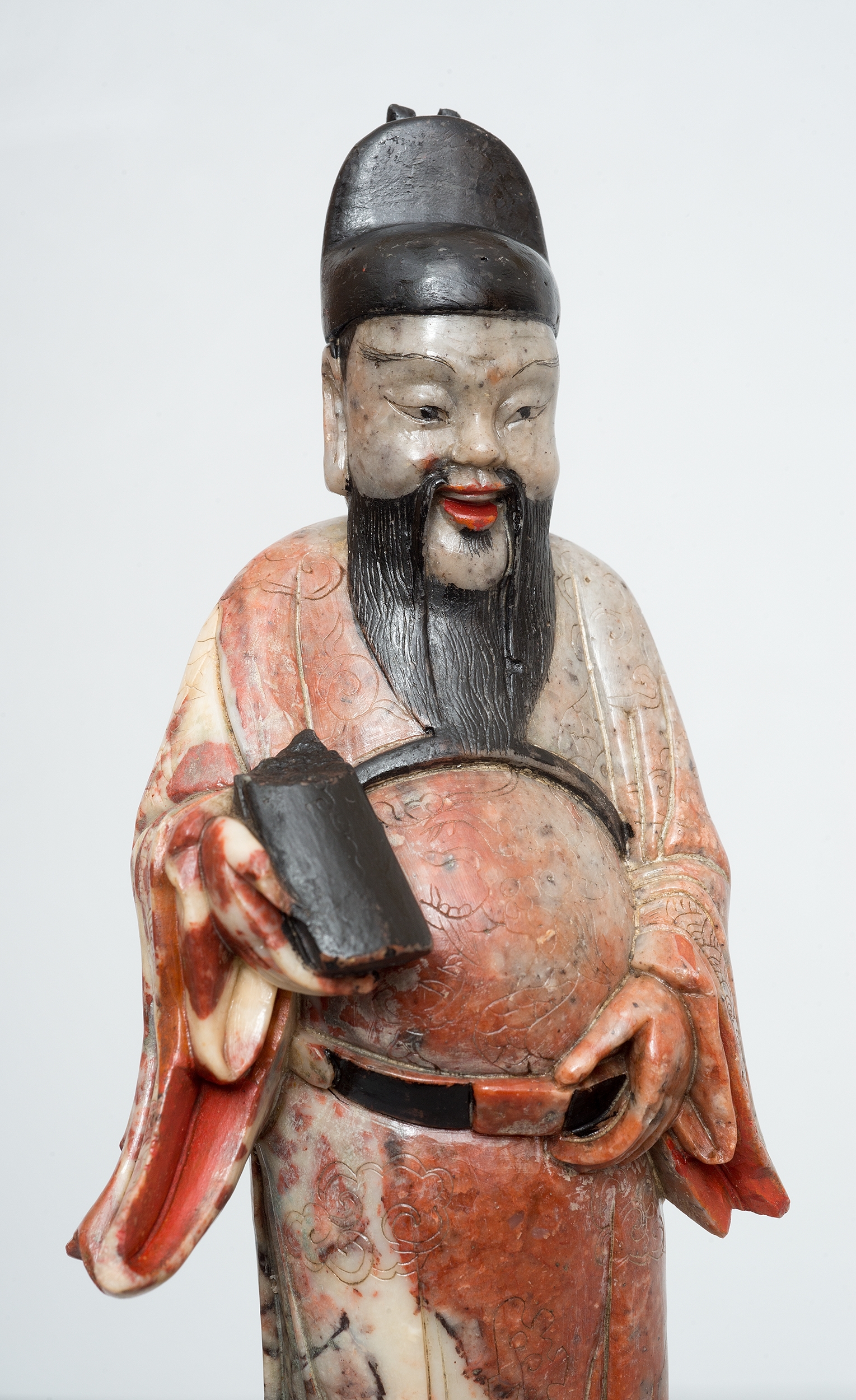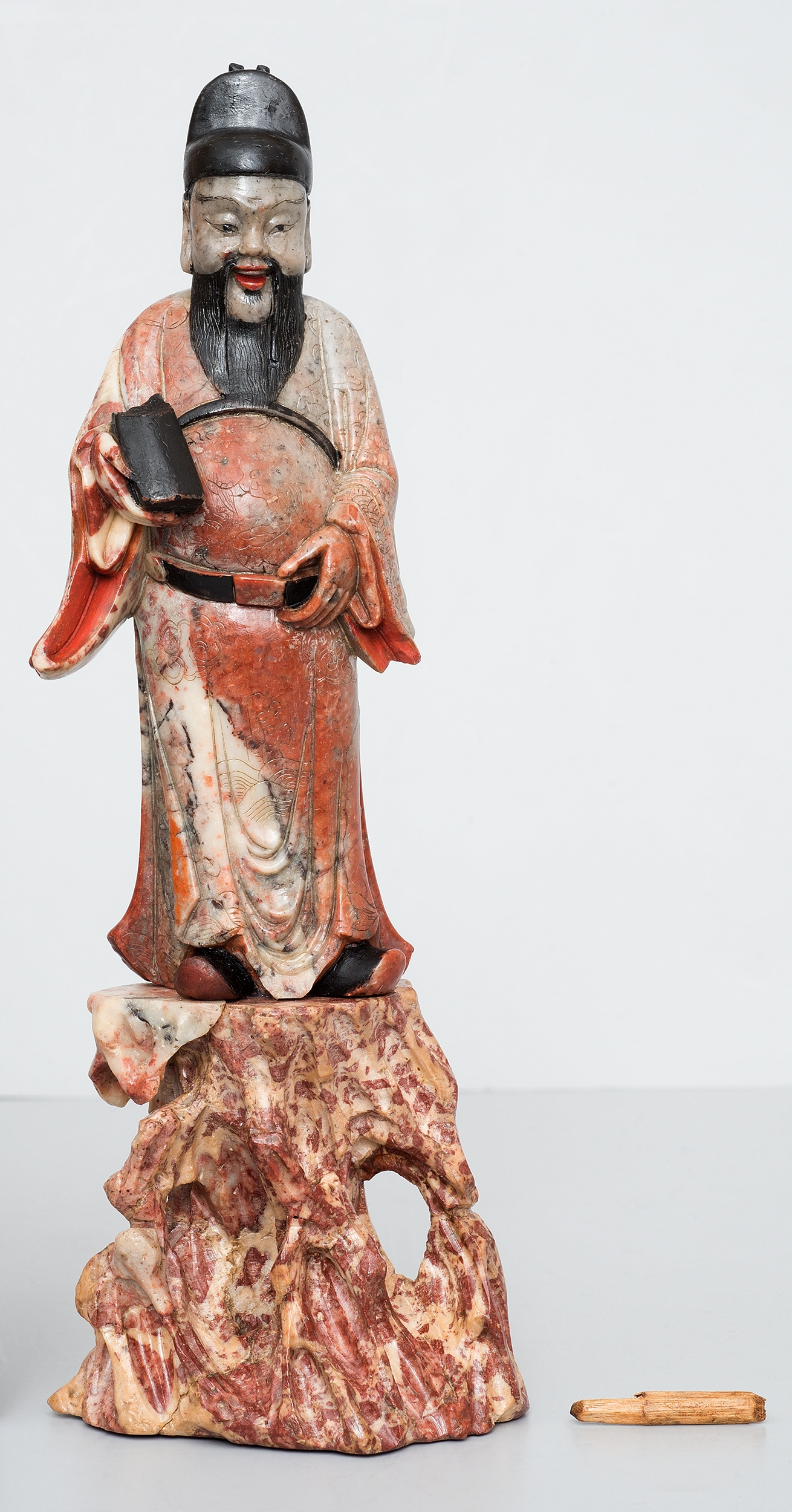 Figurka Cao Guojiu, jednego z Ośmiu Nieśmiertelnych, przedstawianego w oficjalnych szatach, z kastanietami albo jadeitową tabliczką. Uważano go za patrona aktorów. Był spowinowacony z rodziną carską z dynastii Song. Do kręgu nieśmiertelnych trafił za sprawą Zhongli Quan i Lu Dongbin. Ośmiu Nieśmiertelnych to bóstwa tzw. nieśmiertelnych z chińskich wierzeń. Postacie te są popularne zarówno w kulturze chińskiej, jak i w taoizmie.