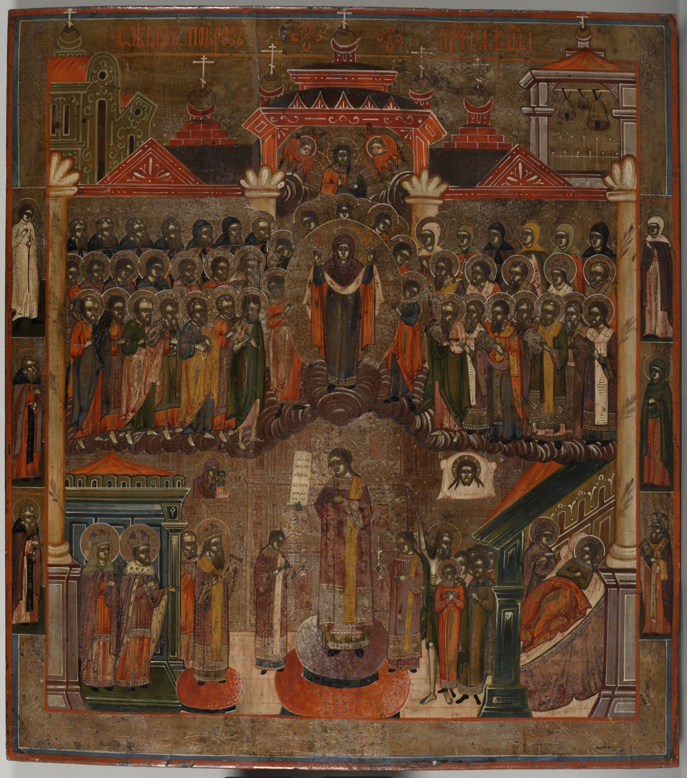 Ikona Pokrow Przeczystej Bogurodzicy obrazuje cud, który wydarzył się w Konstantynopolu podczas nocnego nabożeństwa w świątyni na Blachernach. Szaleniec boży Andrzej Jurodiwy zobaczył Bożą Rodzicielkę rozpościerającą swój maforion - welon nad zgromadzonym w świątyni ludem, co opisano pod S.12821MŁ. Wydarzenie miało miejsce pod koniec życia Andrzeja Szaleńca, ale z powodu braku konkretnych danych kalendarzowych jego datowanie jest domyślne. Większość pisarzy chrześcijańskich umieszcza go pod 910 r., gdy Bizancjum prowadziło wojnę z saracenami i nad stolicą zawisło niebezpieczeństwo. Cud ten zainicjował święto zwane Pokrow Przeczystej Bogurodzicy, a historia jego początków nie została przez badaczy jednoznacznie ustalona. Niektórzy uważają, że święto wprowadzono w Bizancjum, skąd przeszło ono na Ruś z wieloma bizantyjskimi tradycjami i wpływami. Inni przypuszczają, że jego początki należy wiązać z Kijowem, z położonym obok Ławry Peczerskiej monasterem Blacherneńskim za rządów Włodzimierza Monomacha w X/XI w. Jeszcze inni przypuszczają, że było ono zaprowadzone na Rusi Włodzimiersko-Suzdalskiej za panowania Andrzeja Bogolubskiego (wnuka Włodzimierza Monomacha) jako dziękczynienie za opiekę Bogurodzicy w wyprawie przeciwko Bułgarom Wołżańskim w 1164 r. Święto Pokrowu Przeczystej Bogurodzicy stało się symbolem szczególnej opieki Bożej Rodzicielki nad ziemiami Rusi. Jego obrazowanie ukształtowało się na Rusi, gdzie w XIII-XIV w. pojawiły się najstarsze ikony Pokrowu w Suzdalu, Pskowie, Nowgorodzie Wielkim. Greckich ikon obrazujących Pokrow Bogurodzicy nie było, w bizantyjskich wzornikach – hermenejach nie ma nawet wskazówek do ich malowania. W dwustrefowej kompozycji przedstawienia główne miejsce zajmuje Bogurodzica, co widać na prezentowanej ikonie. Ponadto scenę uzupełniono o konkretne postacie historyczne, co opisano pod S.12951MŁ.