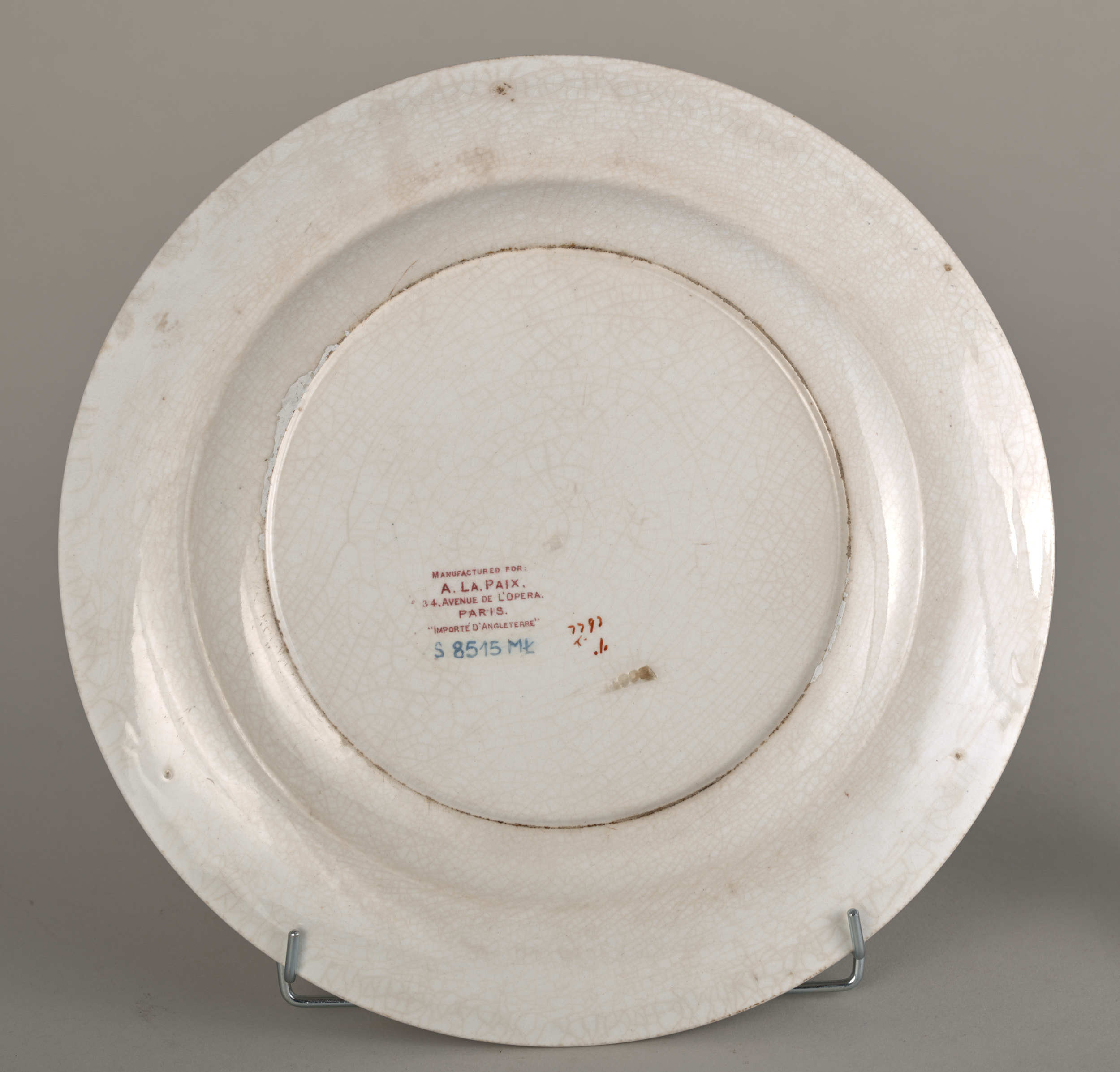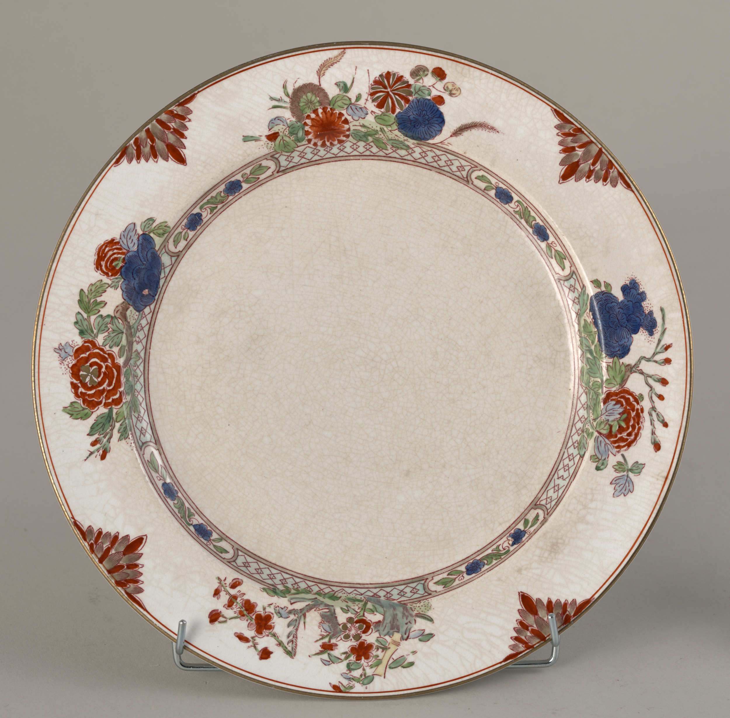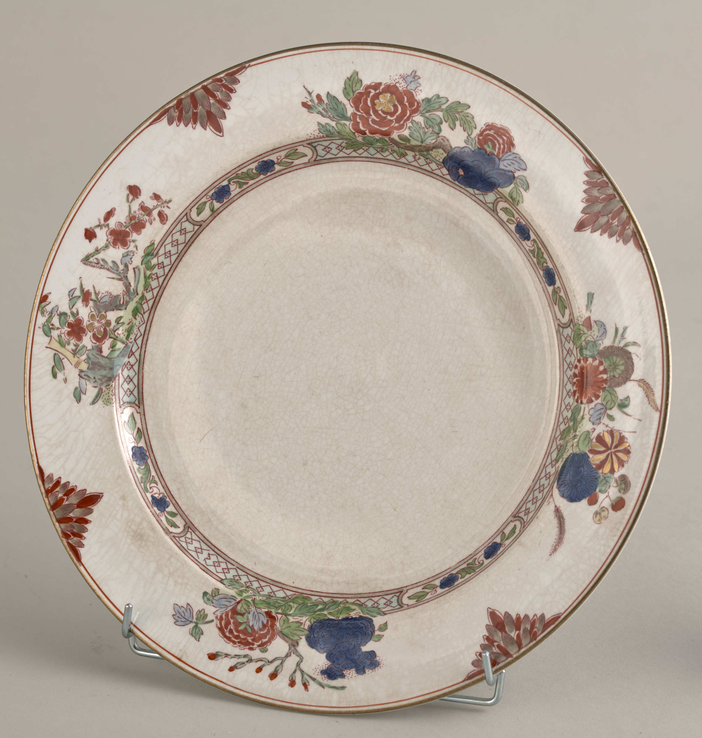 Talerz płytki z dekoracją chinizującą. Talerz płytki, fajansowy o lekko kremowym odcieniu, pokryty siatką ozdobnych spękań szkliwa, zdobiony dekoracją malarską w typie dalekowschodnim o motywach roślinno – geometrycznych, a skoncentrowaną w partii kołnierza. Szczegółowy rysunek wzoru dekoracji naniesiony drukiem w kolorze purpurowym, następnie już na szkliwie- ręcznie podmalowany farbami w kilku kolorach: rdzawa czerwień, ciemnoniebieski, zielony, piaskowo-beżowy. Natomiast w mniejszości użyto farb w kolorach: jasnoniebieskim, stalowozielonym, seledynowym i żółtym. Na dekorację tę składa się pas ornamentu geometrycznego z motywem rombów, biegnący tuż pod krawędzią wrębu, następnie cztery duże kompozycje kwiatowo-roślinne, a jedno z nich z motywem połamanego krzewu, rozmieszczone na kołnierzu, blisko pasa ornamentu. Kompozycje te rozdzielone są liściastymi półrozetami. Złoto znajduje się jedynie w pasku lamującym brzeg kołnierza i drobnych elementach trzech kwiatów w dużych kompozycjach. Odwrocie talerza pokryte jest pod szkliwem szarymi plamkami. Widoczne oznakowania: w centralnym punkcie litera „B”, sygnatura fabryki „BOOTHS” – obydwa znaki stemplowane w masie i duża pieczęć drukowana podszkliwnie w kolorze bordowym: „MANUFACTURED FOR:/A.LA.PAIX,/34.AVENUE DE L’OPERA, /PARIS./IMPORTE D’ANGLETERRE”. Pod nią napis z aktualnym nr inwen. Anglia, Hanley, XIX w.