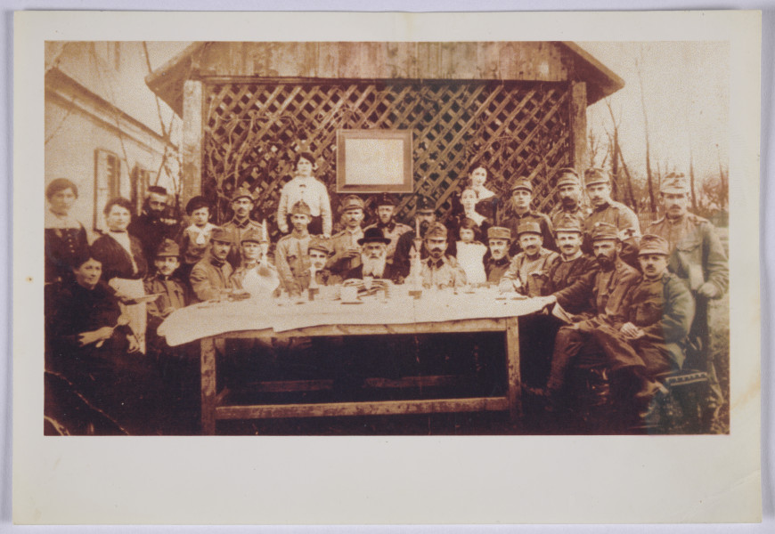 Zdjęcie grupowe, zgodnie z informacją podaną w wywiadach przez Emilię Leibel wykonane w 1915 r. w czasie święta Pesach. Wtórna odbitka. Ozjasz Grossbart (siedzi pośrodku stołu), dziadek Emilii Leibel, zaprosił żołnierzy austriackich pochodzenia żydowskiego, którzy przebywali w szpitalu zorganizowanym w pobliskim klasztorze, na wspólne obchody. Jeden z żołnierzy ma na rękawie opaskę z czerwonym krzyżem. Na zdjęciu widoczne także kobiety. Jedna z nich, w fartuchu, jakby zatrzymała się na moment robienia zdjęcia podczas nakrywania do stołu. To matka Emilii Leibel, która: „zawsze była oburzona, że ją uchwycono w momencie, kiedy talerz trzyma w ręku” (wywiad rzeka Marii Kłańskiej „Wspomnienia Żydówki krakowskiej”, Kraków 2010, s. 12). Inna kobieta, w ciemnej sukni, siedząc, trzyma chochlę. W tle widoczny obraz, o którym wiadomo z relacji, że był podobizną cesarza Franciszka Józefa.