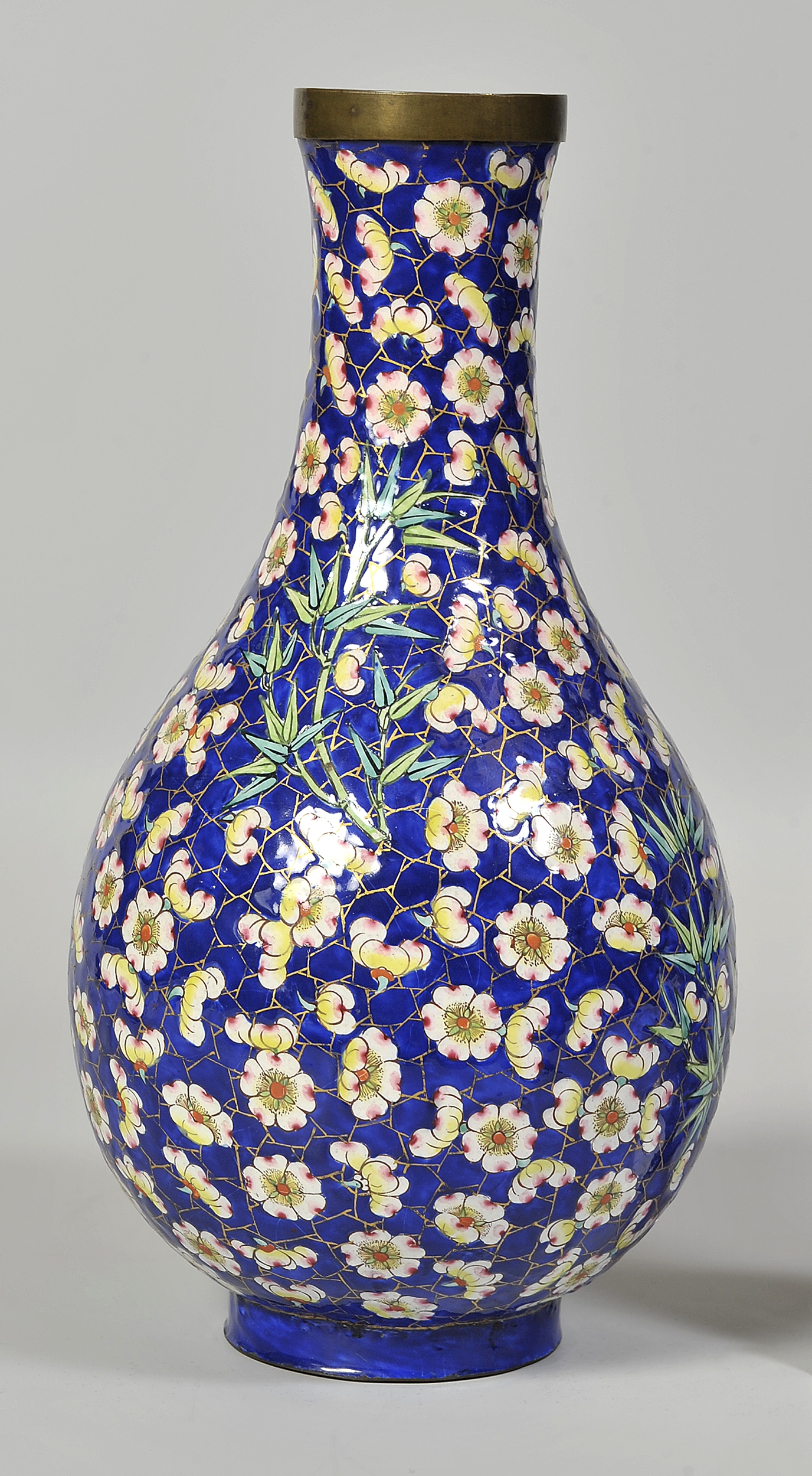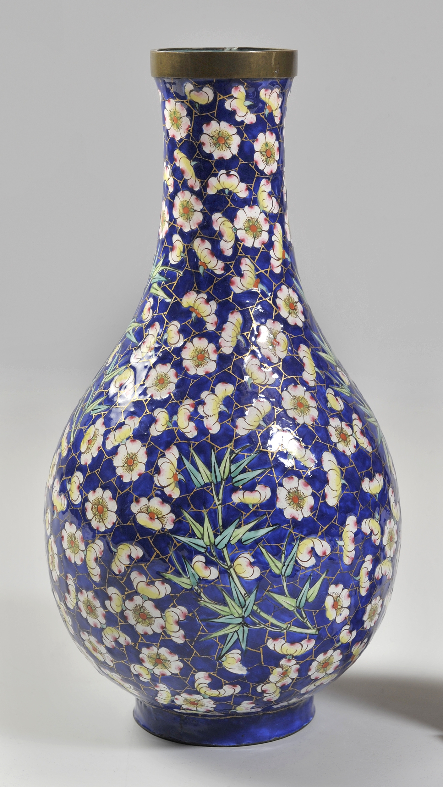 Butla wykonana w technice emalii na miedzi. Kształt brzuśca naczynia owoidalny, płynnie przechodzący w szyjkę z delikatnie rozszerzającym się wylewem, zamkniętym miedzianym pierścieniem. Stopa krótka, cylindryczna. Całą powierzchnię butli pokrywa emalia w głębokim kobaltowym kolorze. Zdobią ją gęsto rozmieszczone białoróżowe kwiaty śliwy i gdzieniegdzie zielone gałązki bambusa na tle złotego wzoru przypominającego spękany lód. Wnętrze naczynia pokryto emalią o barwie turkusowej.