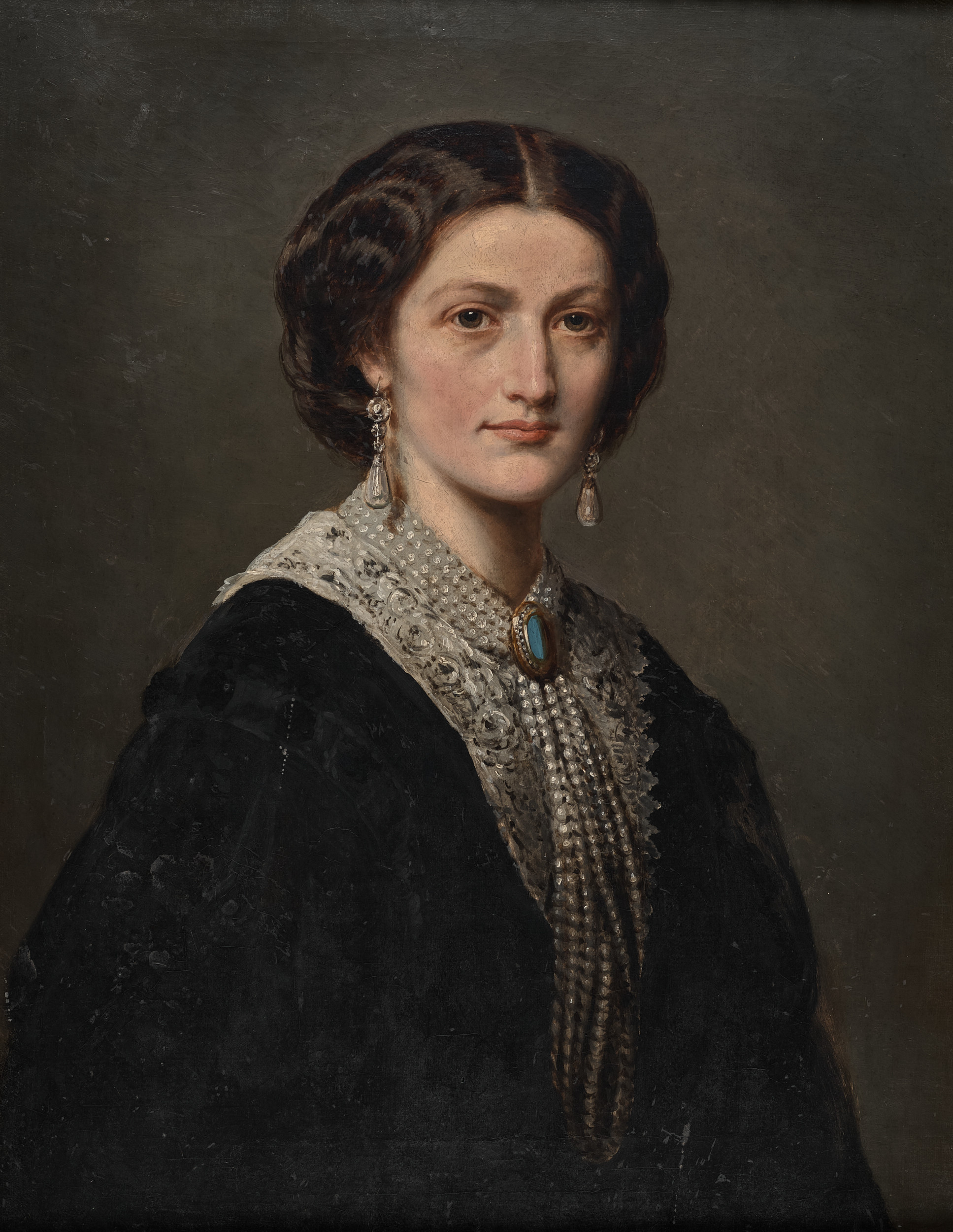Obraz z kolekcji muzealnej przestawia portret młodej kobiety ukazanej w półpostaci, patrzącej na widza. To Maria Klementyna z Sanguszków Potocka (ur. w marcu 1830 r w Sławucie, zm. w październiku 1903 r we Lwowie), córka Romana Sanguszko i Natalii Potockiej. W 1851 r Maria wyszła za mąż za Alfreda Józefa Potockiego, II ordynata łańcuckiego. Była kobietą obdarzoną silnym, władczym charakterem, jako żona namiestnika Galicji często organizowała spotkania i bale, wspierając męża w odpowiedzialnej pracy i zarządzając domem. W 1880 r Alfred zadecydował o budowie pałacu we Lwowie, przy obecnej ulicy Mikołaja Kopernika, a po jego śmierci  w 1889 r Maria nadzorowała ukończenie pałacu, gdzie spędzała jesień i zimę, a lato w Antoninach. Rzadko bywała w Łańcucie, który zaczął podupadać. Z łańcuckiego portretu spogląda na nas piękna kobieta w czarnej sukni, ozdobionej dużym białym koronkowym kołnierzem i długimi sznurami pereł, spiętymi na szyi owalną broszą, w uszach długie kolczyki z perłami w typie dormeusów. Portret jest kopią z oryginału Franza Xavera Winterhaltera (ur. w kwietniu 1805 r w Menzenschwand, zm . w lipcu w Frankfurcie nad Renem), niemieckiego malarza i litografa, który zyskał popularność jako portrecista głów koronowanych i arystokracji. Portretował większość koronowanych głów w Europie, najsłynniejszy to portret austriackiej cesarzowej Elżbiety (Sisi) z 1864 r. Jego sposób malowania był konserwatywny, charakterystyczna była gładka powierzchnia obrazów („emaliowana”). Nie doczekał się pochwał od krytyków, za to był ceniony wśród zleceniodawców i bardzo wśród nich popularny. Omawiany portret jest eksponowany w Salonie Wejściowym na I piętrze zamku łańcuckiego.