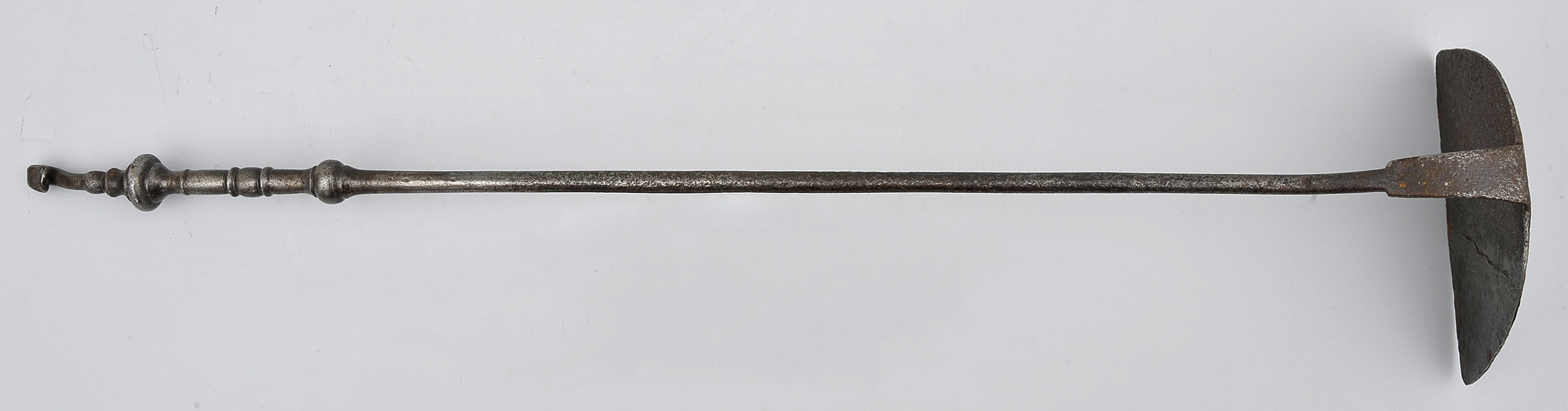 Wygarniacz do popiołu żelazny, kuty, z prostym, gładkim trzonkiem o okrągłym przekroju. Pogrzebacz żelazny, kuty, z prostym, gładkim trzonkiem o okrągłym przekroju. Trzonek zakończony jest u góry krótkim, podłużnym uchwytem, toczonym tralkowato i zakończonym małym haczykiem do odwieszania. Zakończenie od strony paleniska ma formę motykowatą, o zaokrąglonych bocznych krawędziach, prosto zakończoną.