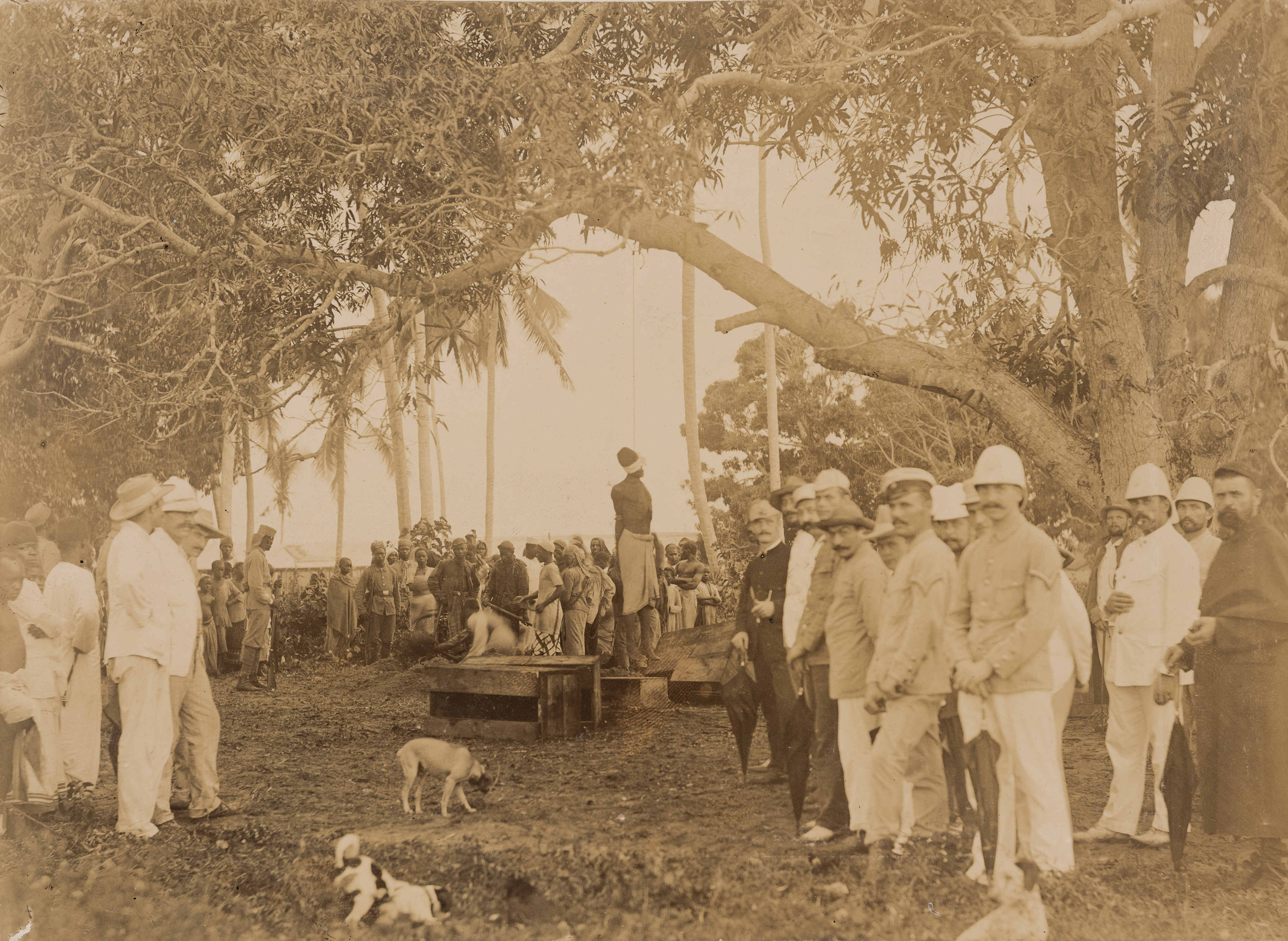 Jest to jedna z 76 fotografii z albumu Aleksandra Dandelskiego (1863–1944), oficera pruskiego uczestniczącego w wojskowej ekspedycji do Niemieckiej Afryki Wschodniej (teren dzisiejszej Tanzanii, Rwandy i Burundi) około 1893 roku. Był to okres antyniemieckich powstań tubylców przeciw najeźdźcom bezwzględnie eksploatującym ludzi i zasoby, z których pierwsze wybuchło już trzy lata po założeniu Niemieckiej Afryki Wschodniej, w 1888 roku. Pomiędzy 1891 a 1898 rokiem grupy Hehe (suahili Wahehe), prowadzone przez wodza Mkwawę (Mkwavinyika Munyigumba Mwamuyinga 1855–1898), stawiały silny opór pruskim kolonizatorom aż do 1898 roku. Być może stracony mężczyzna był jednym z partyzantów lub próbującym wyswobodzić się niewolnikiem. W Niemieckiej Afryce Wschodniej niewolnictwo zostało bowiem zniesione dopiero w 1922 roku wraz z objęciem Tanganiki protektoratem brytyjskim.
