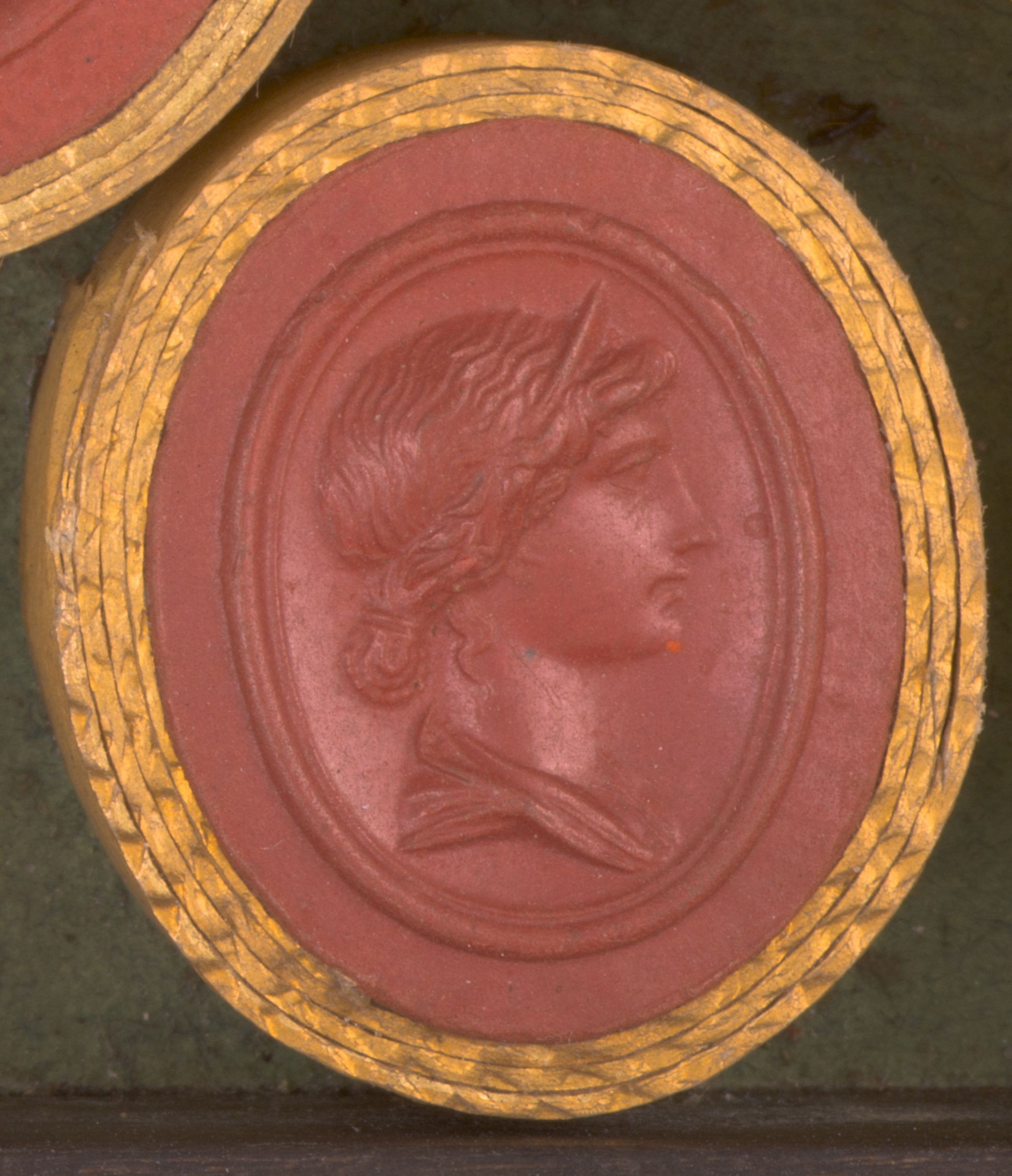 Na owalnym, wypukłym wycisku na wklęsłym tle, obwiedzionym wałkiem z uskokiem i marginesem przedstawiony jest prawy profil popiersia młodej kobiety, z włosami spiętymi wokół głowy w formie wałka, a z tyłu przy szyi upiętymi w koczek. We włosach widoczny jest diadem, a na ramionach fragment szaty.