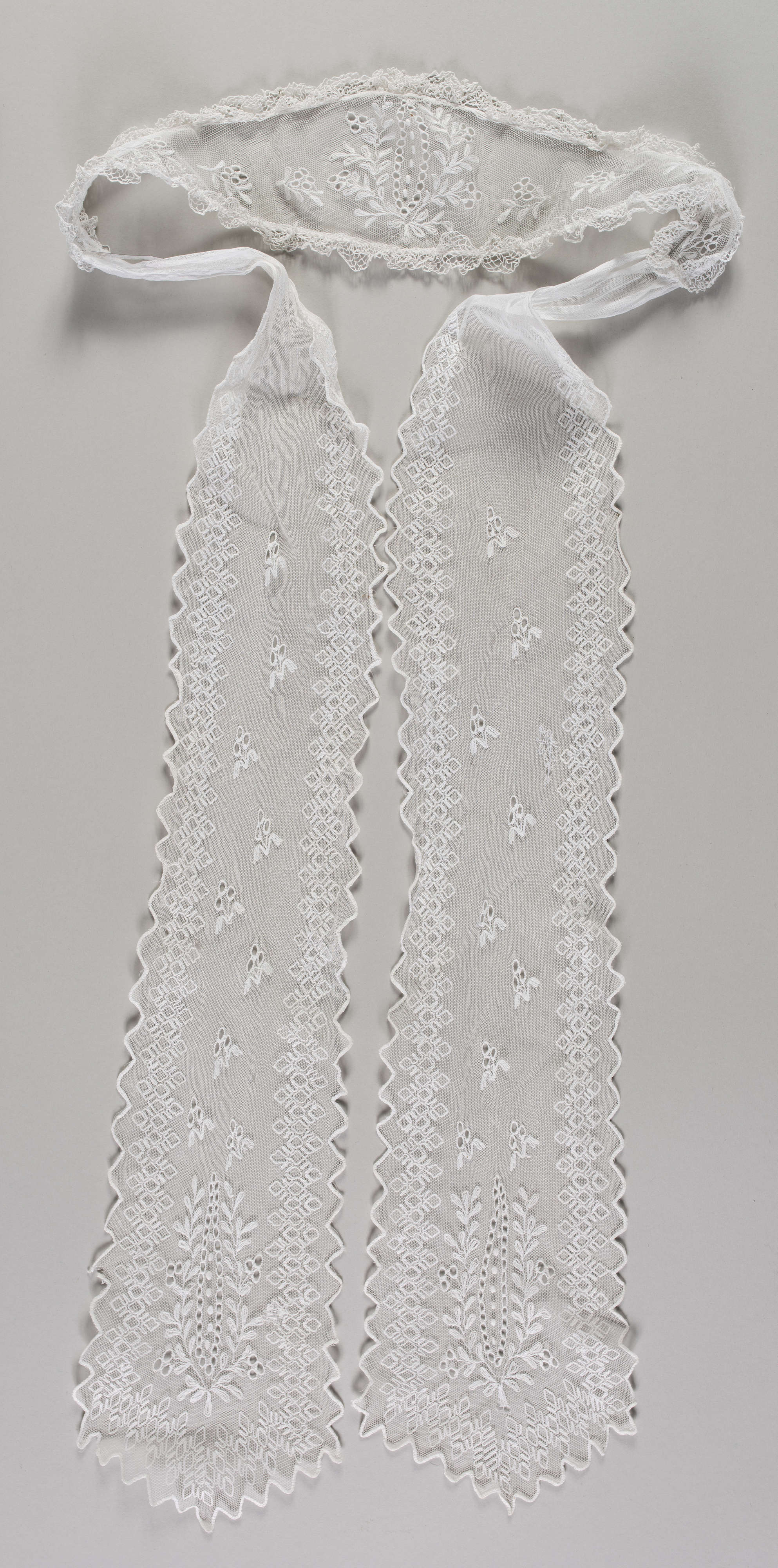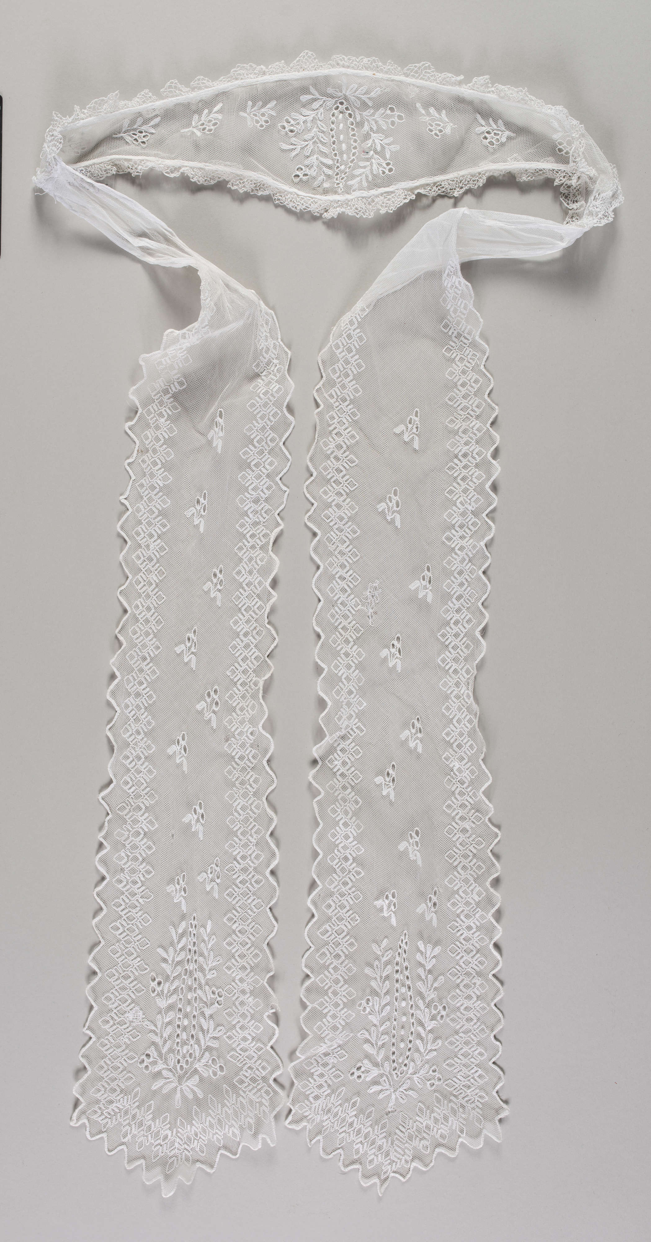 Prezentowane nakrycie głowy, noszone przez kobiety zamężne do stroju świątecznego, zostało uszyte przez krawcową i wyhaftowane przez zawodową hafciarkę. Pochodzi z okolic Łukowa, powstało pod koniec XIX wieku. Składa się z trzech części: główki w kształcie prostokąta zaokrąglonego przy dłuższych krawędziach – zakładany był na czubek głowy, i dwóch szarf, które służyły do przywiązania półczepca pod brodą na ozdobną kokardę. Każdy z elementów wykonany jest z fabrycznego tiulu i ozdobiony białym haftem maszynowym oraz odręcznym w motywy roślinne. Najintensywniejsze wzory umieszczano w najlepiej wyeksponowanych miejscach, czyli w środkowej części główki w formie wianka z pojedynczych gałązek z listkami, które na końcach mają drobny kwiat. Takie same gałązki odchodzą pasowo na boki. Podobne zdobienie umieszczono w dolnej części szarf, ale jest bardziej wydłużone i dodatkowo wprowadzono tam motyw drobnych pojedynczych kwiatków wykonanych ściegiem dziurkowanym. Tym samym ściegiem ozdobiono wewnętrzną część wianków. Krawędzie główki są dodatkowo obszyte podwójną marszczoną koronką fabryczną, a szarfy ozdobnie wycięte na brzegach w ząbki i obszyte białą nicią.