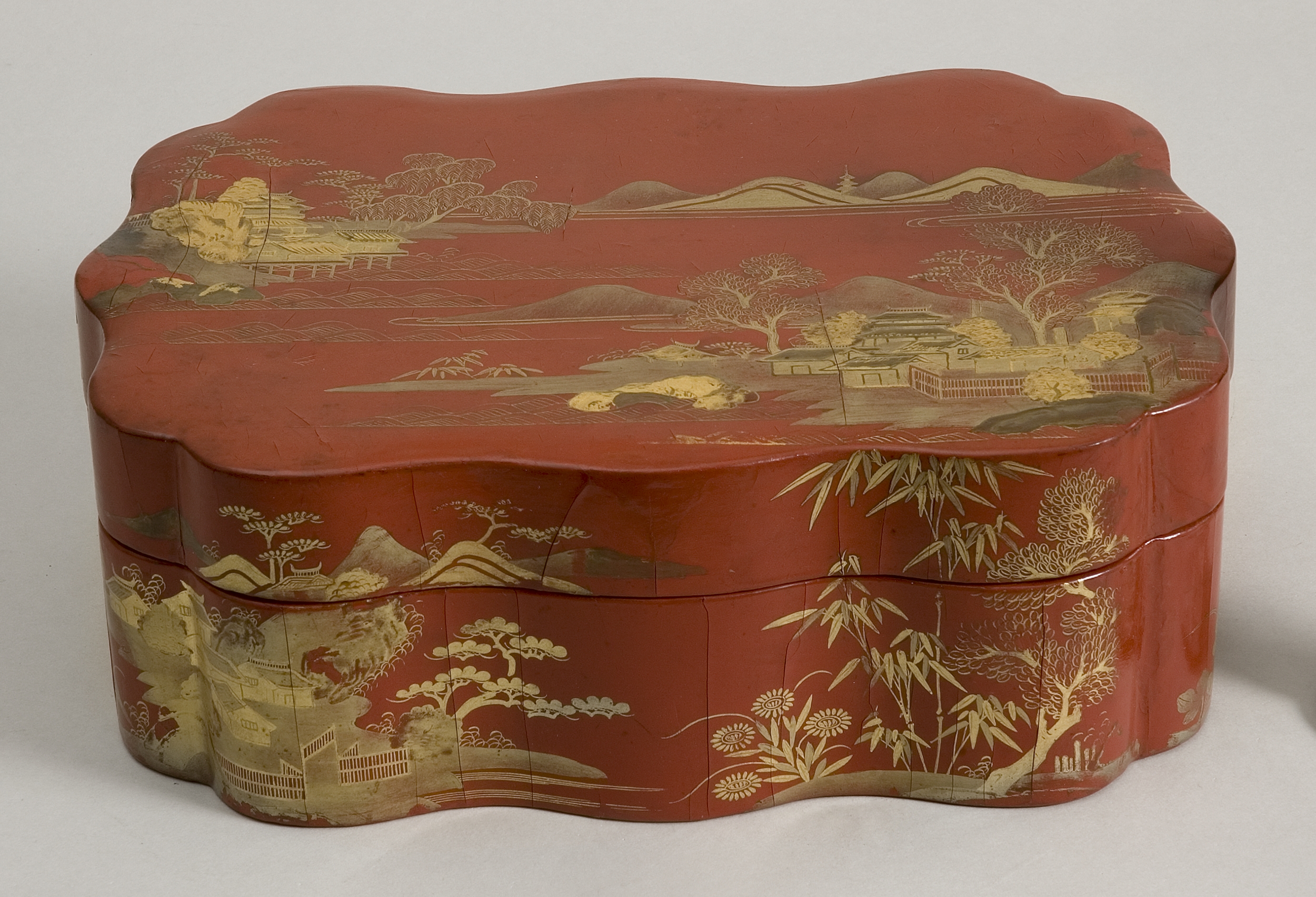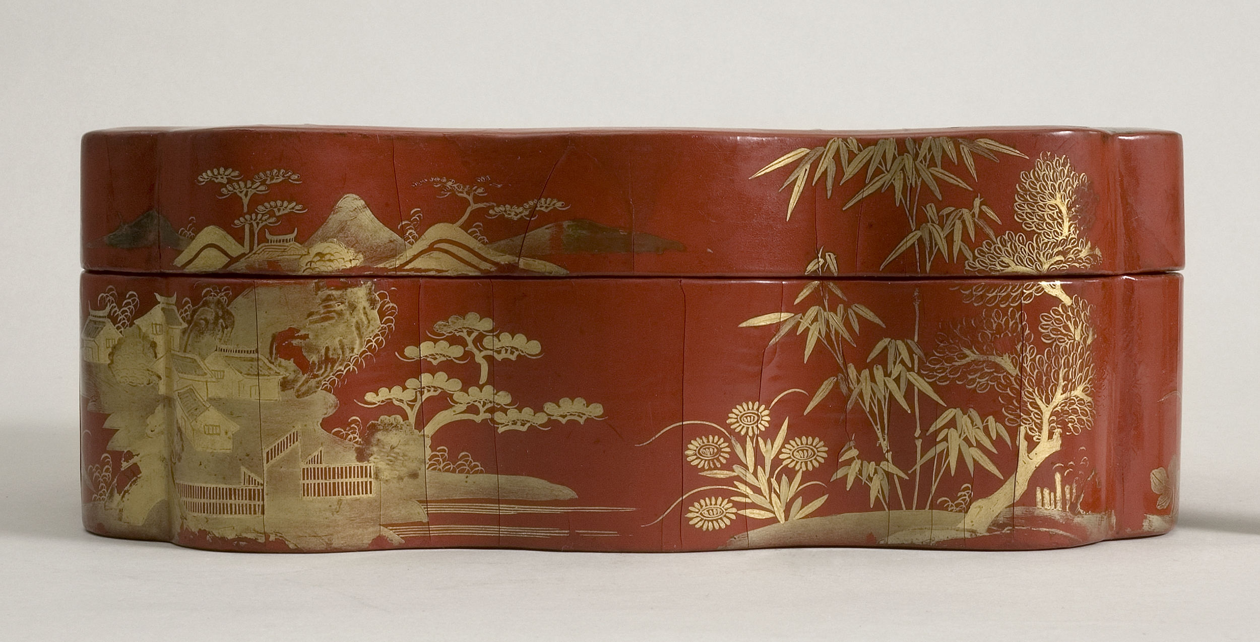 Drewniane pudełeczko z pokrywą dekorowane czerwoną imitacją laki i złoceniami, o prostokątnym kształcie z regularnie pofalowanymi krawędziami. Przedmiot składa się z dwóch części – korpusu i nakładanej nakrywy. Wieczko ozdobiono złoconą dekoracją. Przedstawia ona górski krajobraz z terenami nad zatoką, z zabudowaniami pośród skał, rozłożystymi drzewami i drobniejszą roślinnością. Boczne powierzchnie pudełka i pokrywy zdobią mniejsze scenerie krajobrazowo-architektoniczne, nawiązujące do dekoracji pokrywy, oraz różnorodne motywy zaczerpnięte z flory.