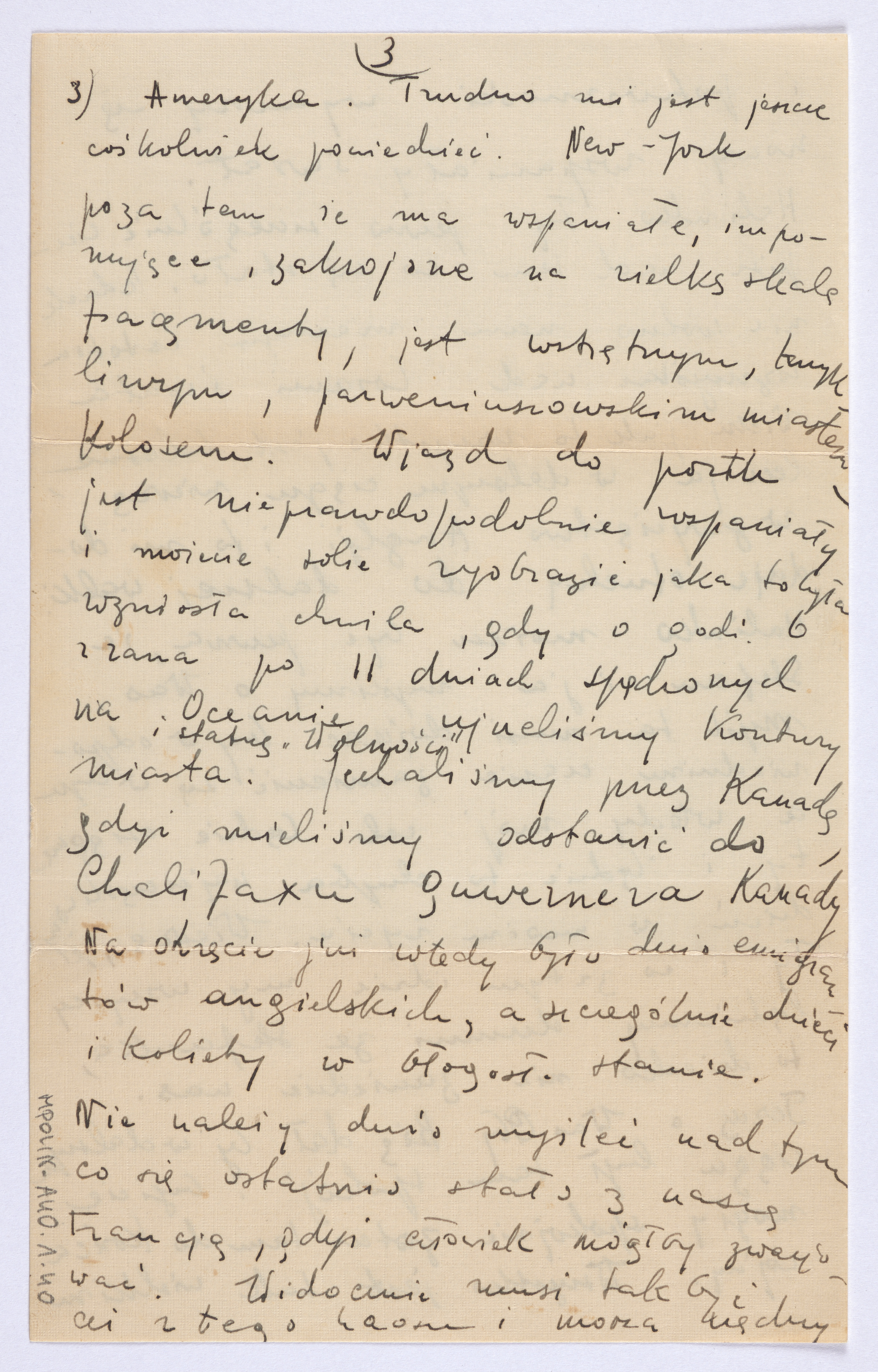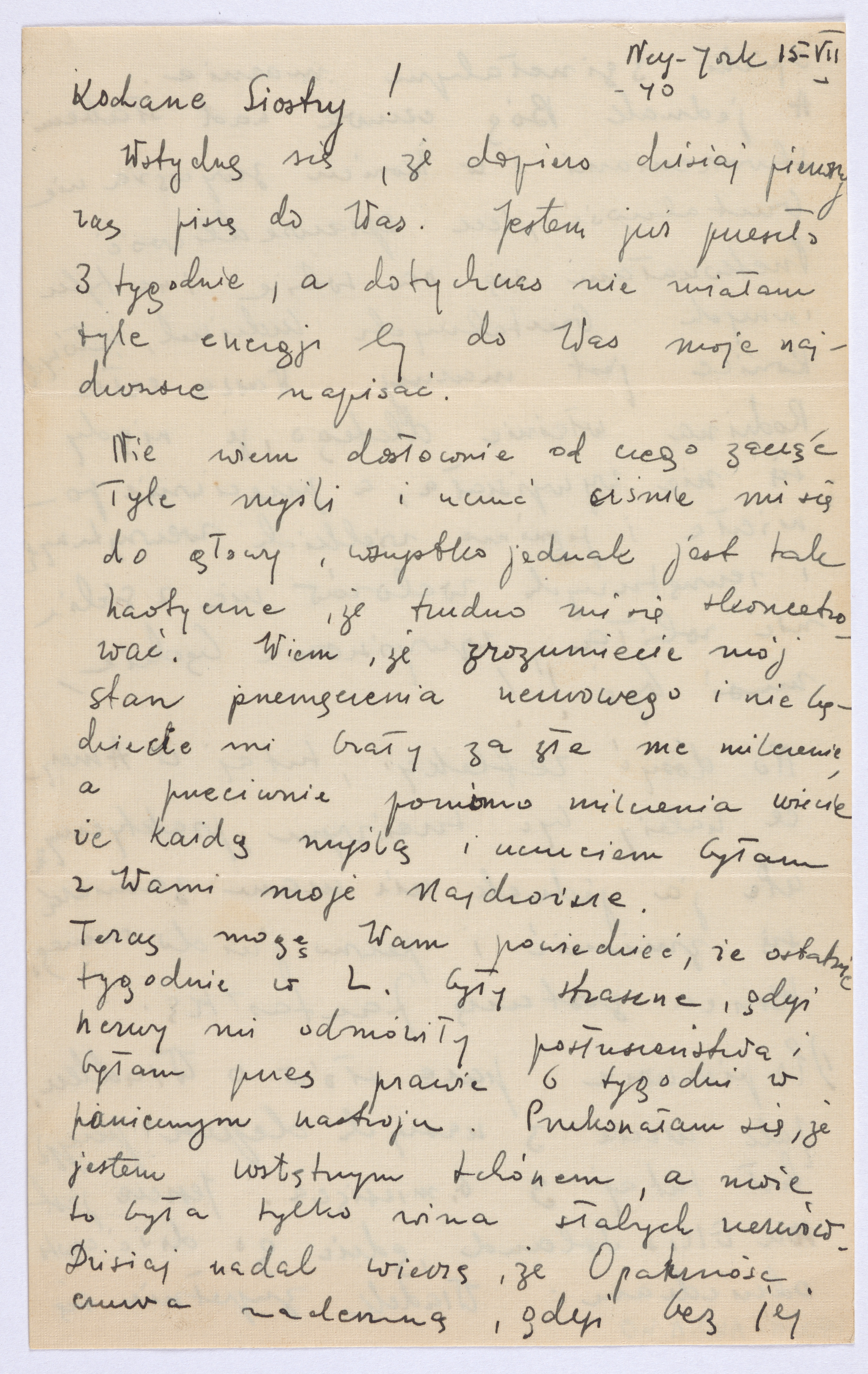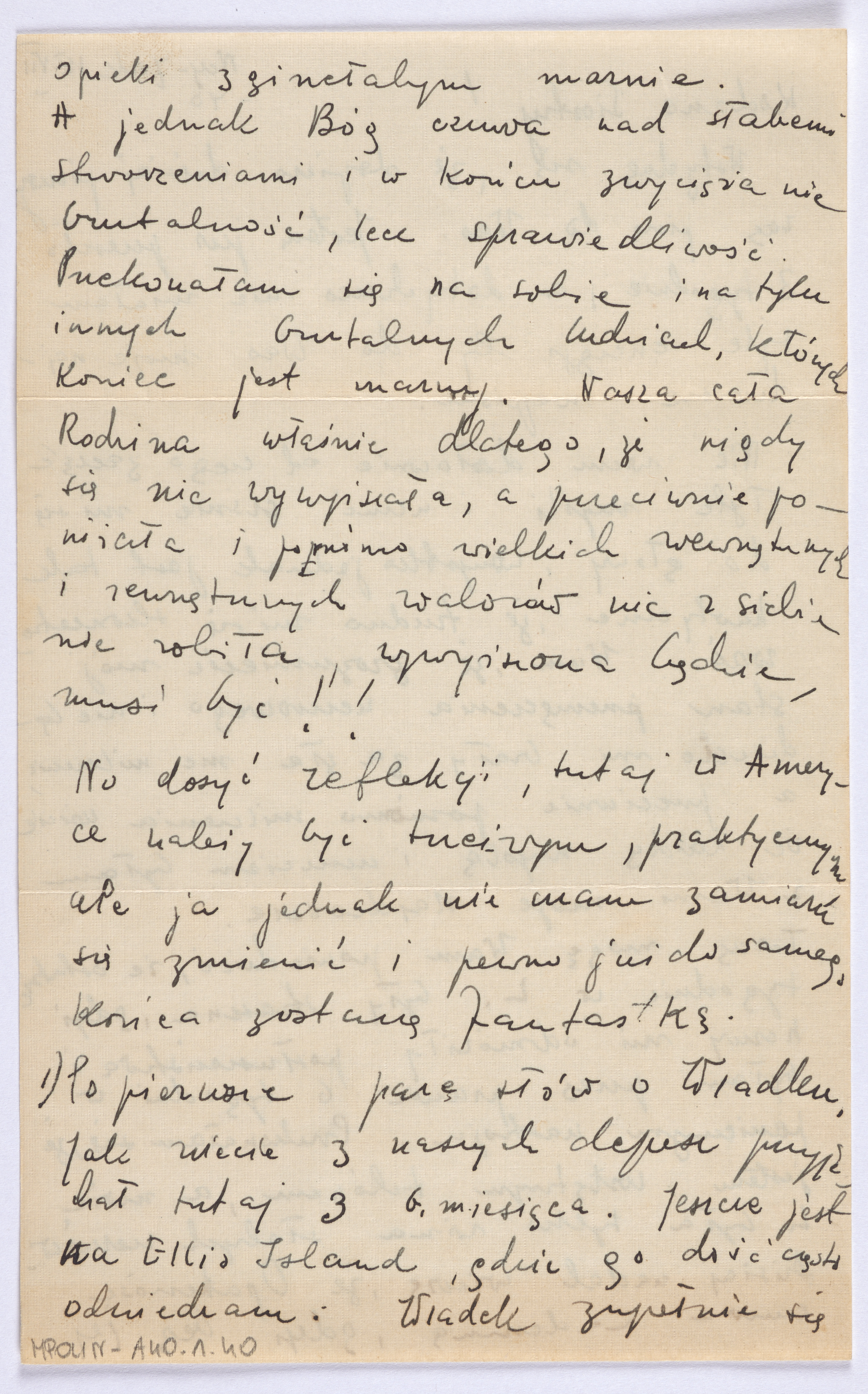 List Bronisławy Roller do sióstr na 2 kartach. Z treści listu (pisownia oryginalna): „Po pierwsze parę słów o Władku. Jak wiecie z naszych depesz przyjechał tutaj 3 b. miesiąca. Jeszcze jest na Ellis Island, gdzie go dość często odwiedzam. […] | Ameryka. Trudno mi jest jeszcze cokolwiek powiedzieć. New-York poza tem że ma wspaniałe, imponujące, zakrojone na wielką skalę fragmenty, jest wstrętnym, krzykliwym, parweniuszowskim miastem kolosem. Wjazd do portu jest nieprawdopodobnie wspaniały i możecie sobie wyobrazić jaka to była wzniosła chwila, gdy o godz. 6 z rana po 11 dniach spędzonych na Oceanie ujrzeliśmy kontury miasta i statuę «Wolności». Jechaliśmy przez Kanadę gdyż mieliśmy odstawić do Chalifaxu guwernera Kanady. Na okręcie już wtedy było dużo emigrantów angielskich, a szczególnie dzieci i kobiety w błogosł[awionym] stanie.”