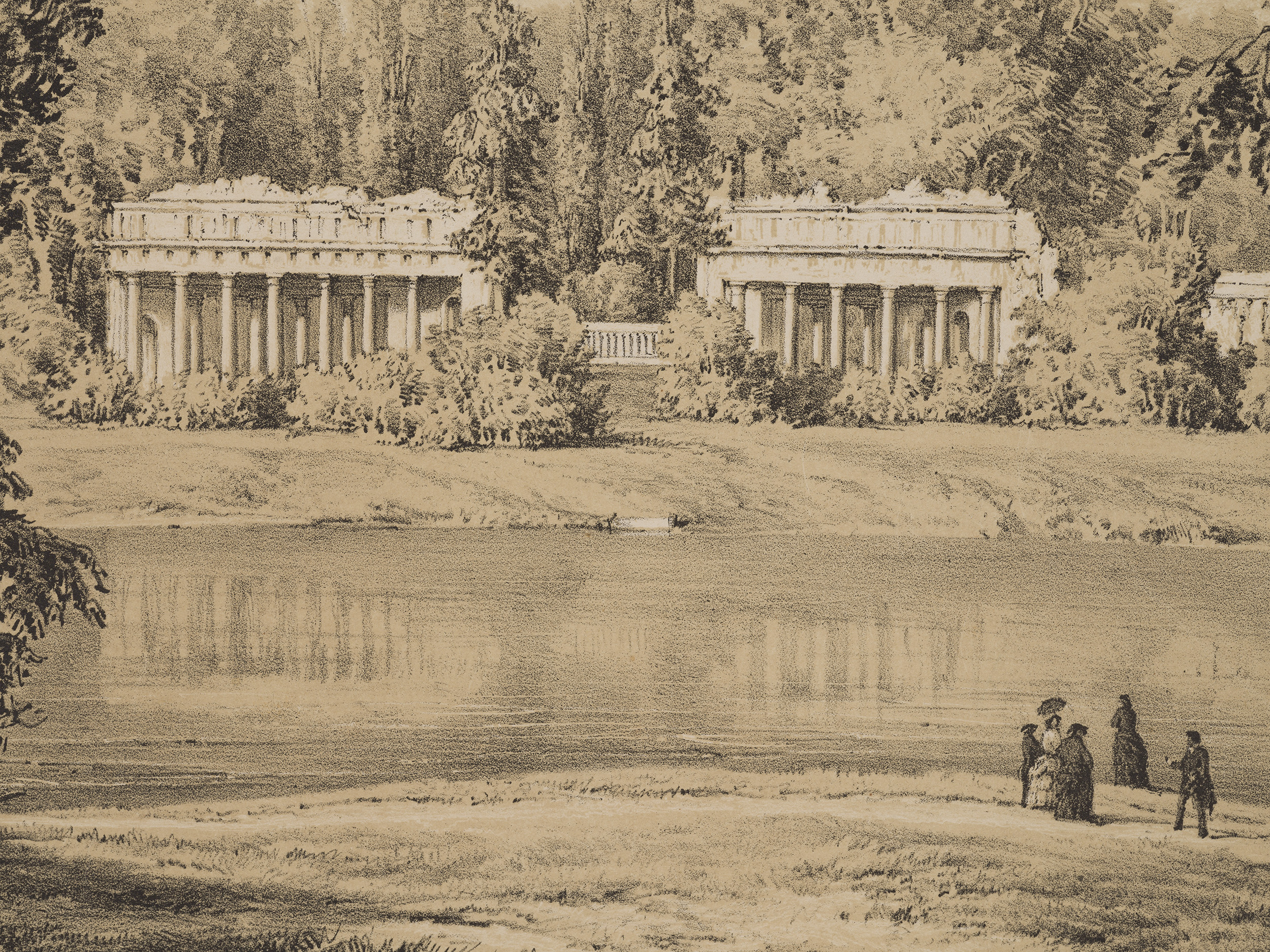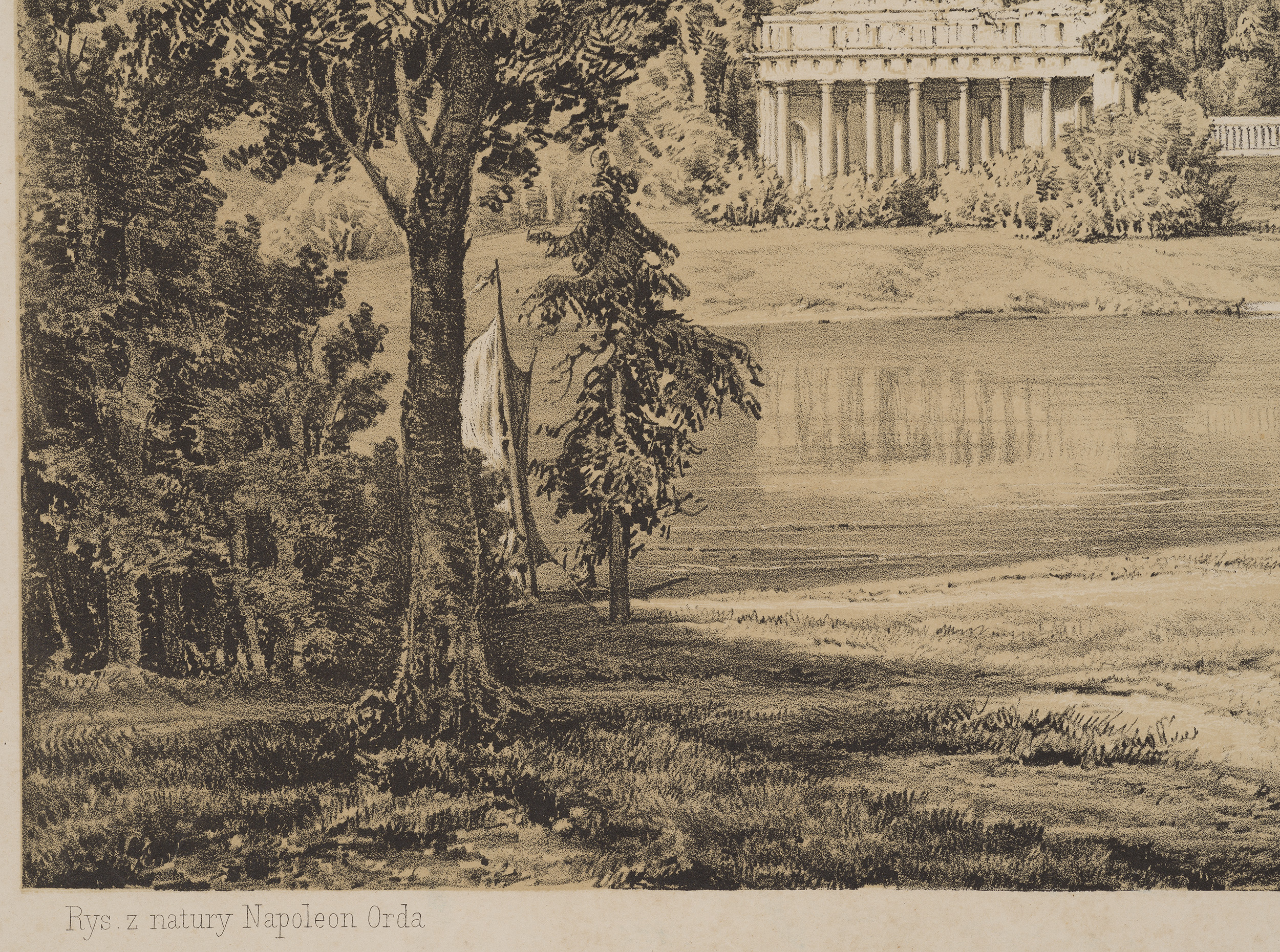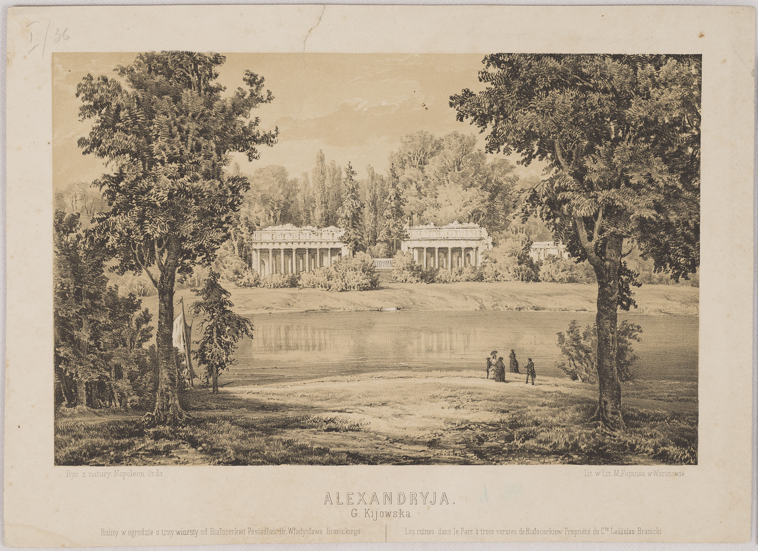 Opis na odbitce objaśnia, że jest to widok „Alexandryi” (Aleksandrii) w guberni kijowskiej, pod Białą Cerkwią (obecnie to część miasta Biała Cerkiew na Ukrainie). W XVIII wieku wzniesiony tam został przez Franciszka Ksawerego Branickiego (1730-1819) pałac w otoczeniu parku, dar dla jego małżonki, Aleksandy z Egelhardtów (1754-1838), o czym przypomina nazwa upamiętniająca pierwszą właścicielkę. Rysunek Ordy, a za nim – litografia Misierowicza i Fajansa, ukazują widok na park, z widocznymi poza jeziorem dwoma pawilonami, otwierających się kolumnadami. Pod sceną, poza identyfikacją miejsca, znalazł się opis uzupełniający: Ruiny w ogrodzie o trzy wiorsty od Białocerkwii Posiadłości Hr. Władysława Branickiego (obok ten sam tekst w jęz. fr.). Władysław Branicki był synem Franciszka Ksawerego i Aleksandry, a także bratem Katarzyny z Branickich Potockiej, matki Aleksandry, ostatniej właścicieli dóbr wilanowskich (do 1892 roku) z rodu Potockich.