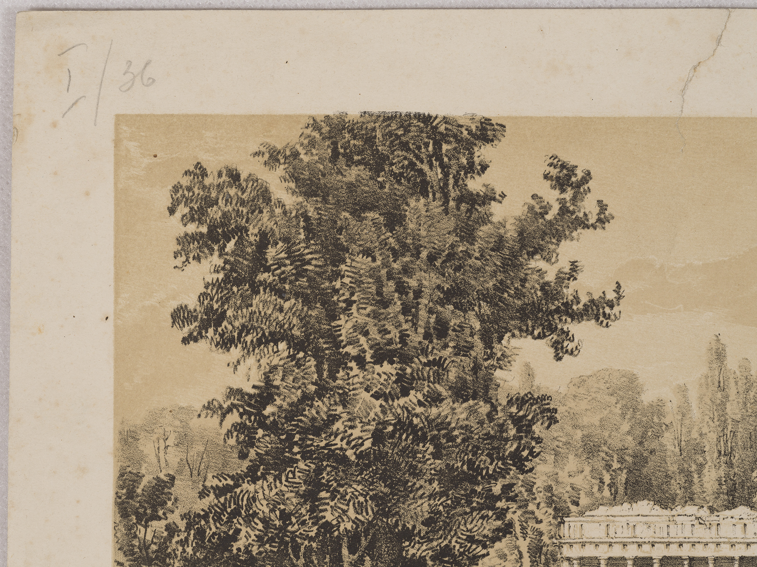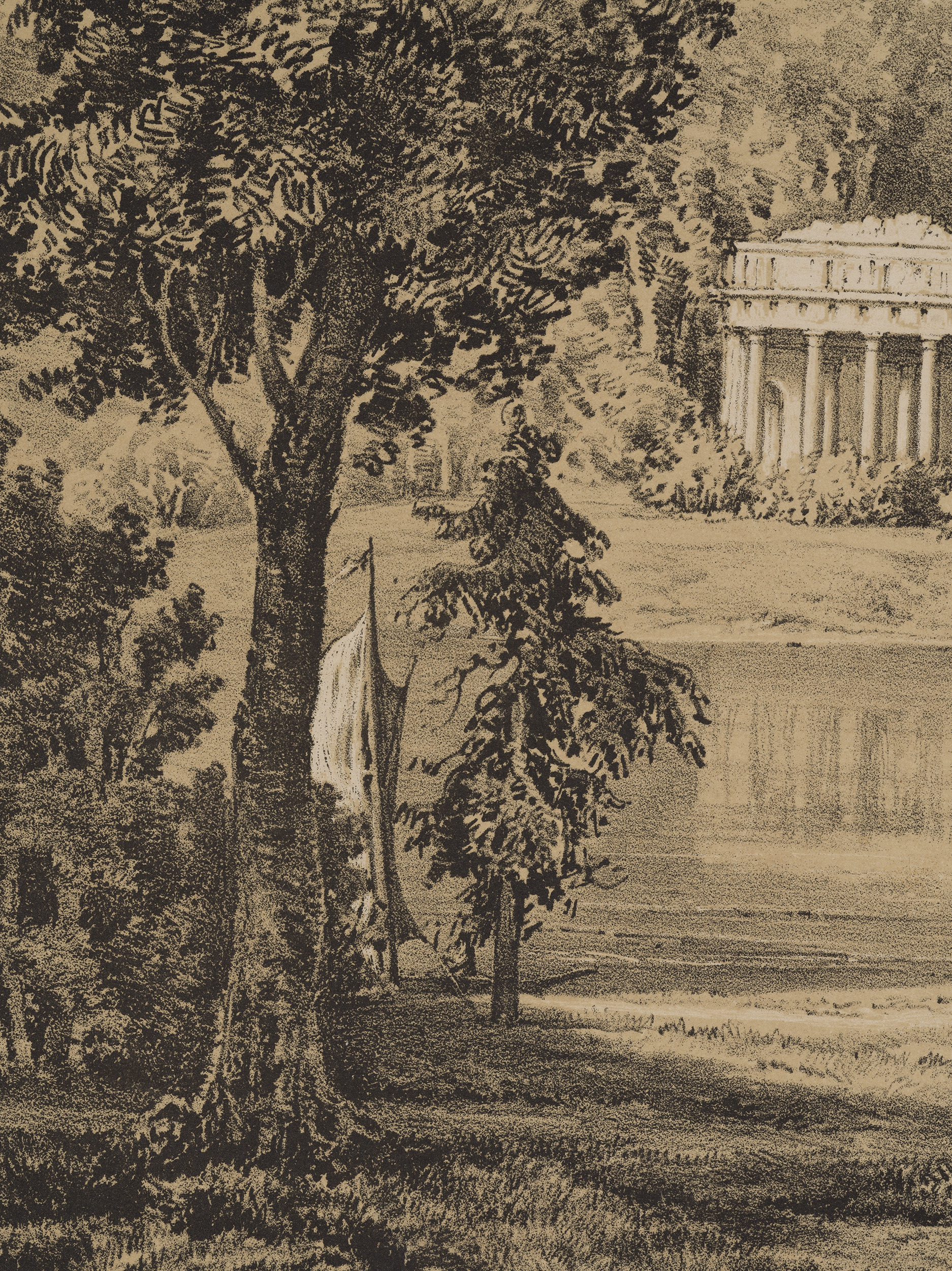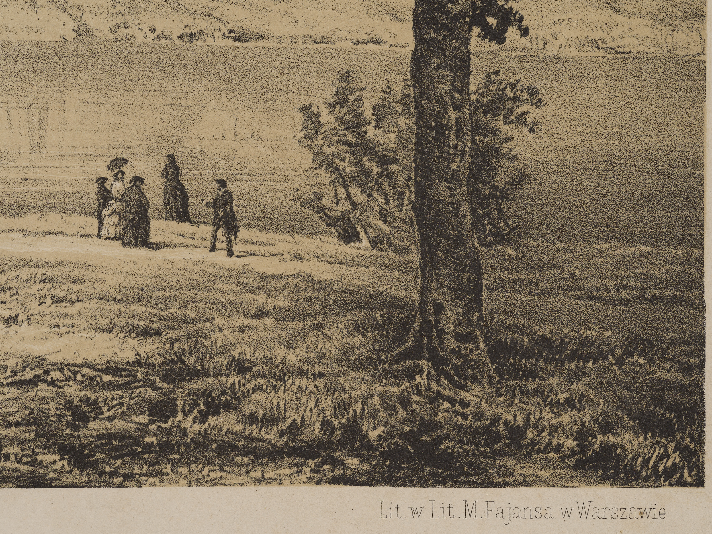 Opis na odbitce objaśnia, że jest to widok „Alexandryi” (Aleksandrii) w guberni kijowskiej, pod Białą Cerkwią (obecnie to część miasta Biała Cerkiew na Ukrainie). W XVIII wieku wzniesiony tam został przez Franciszka Ksawerego Branickiego (1730-1819) pałac w otoczeniu parku, dar dla jego małżonki, Aleksandy z Egelhardtów (1754-1838), o czym przypomina nazwa upamiętniająca pierwszą właścicielkę. Rysunek Ordy, a za nim – litografia Misierowicza i Fajansa, ukazują widok na park, z widocznymi poza jeziorem dwoma pawilonami, otwierających się kolumnadami. Pod sceną, poza identyfikacją miejsca, znalazł się opis uzupełniający: Ruiny w ogrodzie o trzy wiorsty od Białocerkwii Posiadłości Hr. Władysława Branickiego (obok ten sam tekst w jęz. fr.). Władysław Branicki był synem Franciszka Ksawerego i Aleksandry, a także bratem Katarzyny z Branickich Potockiej, matki Aleksandry, ostatniej właścicieli dóbr wilanowskich (do 1892 roku) z rodu Potockich.