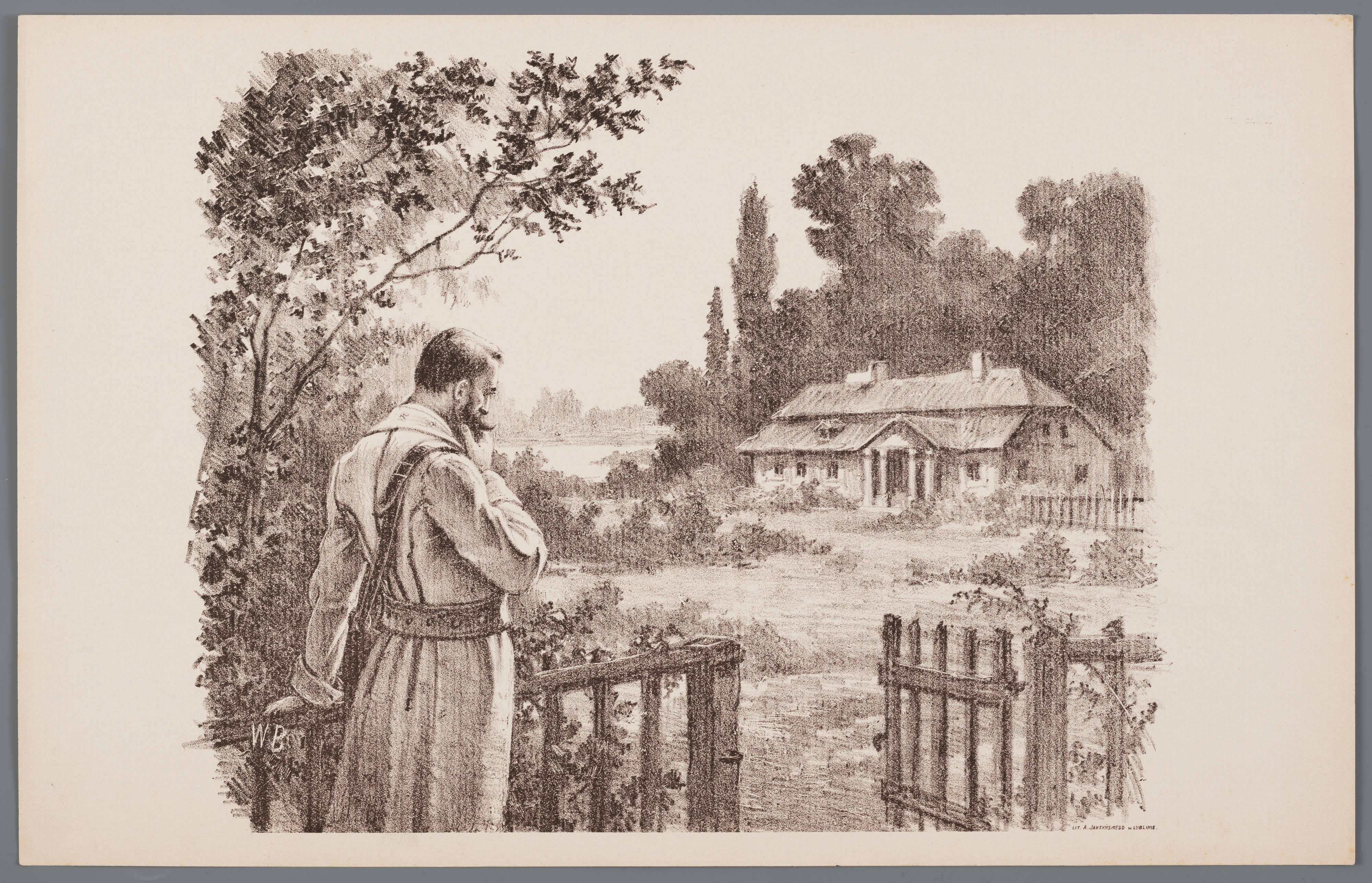 Grafika przedstawia mężczyznę przy wejściu na podwórze, na którym stoi okazały dwór. Zadumany człowiek nie przekracza jednak otwartej furtki – stoi zamyślony, wsparty ręką o płot. Mężczyzna nie jest już młody, o czym świadczą przerzedzone włosy. Być może powrócił po latach do swojego domu, który istnieje już tylko fizycznie. Nie wie, co zastanie w opuszczonym budynku.