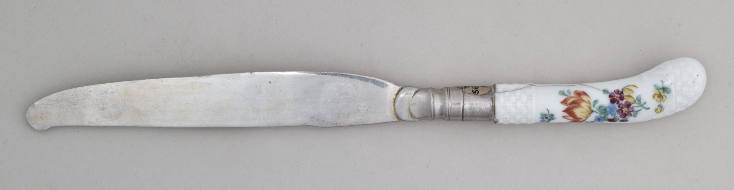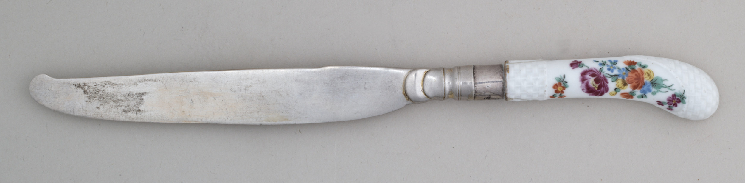 Nóż do owoców z płaskim ostrzem zakończonym półokrągło. Z drugiej strony ostrze zakończone, z tulejką i połączone z porcelanowym trzonkiem. Trzonek wygięty, w kształcie stylizowanej litery „S”, wykonany z białej porcelany, ozdobiony plastycznie przy obu końcach szachownicą. Po obu stronach malowany w wielobarwne kwiaty w kolorach bordowym, żółtym, pomarańczowym i niebieskim. Na brak widocznych znaków firmowych i próby srebra. Wyrób wykonany w warszawskiej Karola Filipa Malcza.