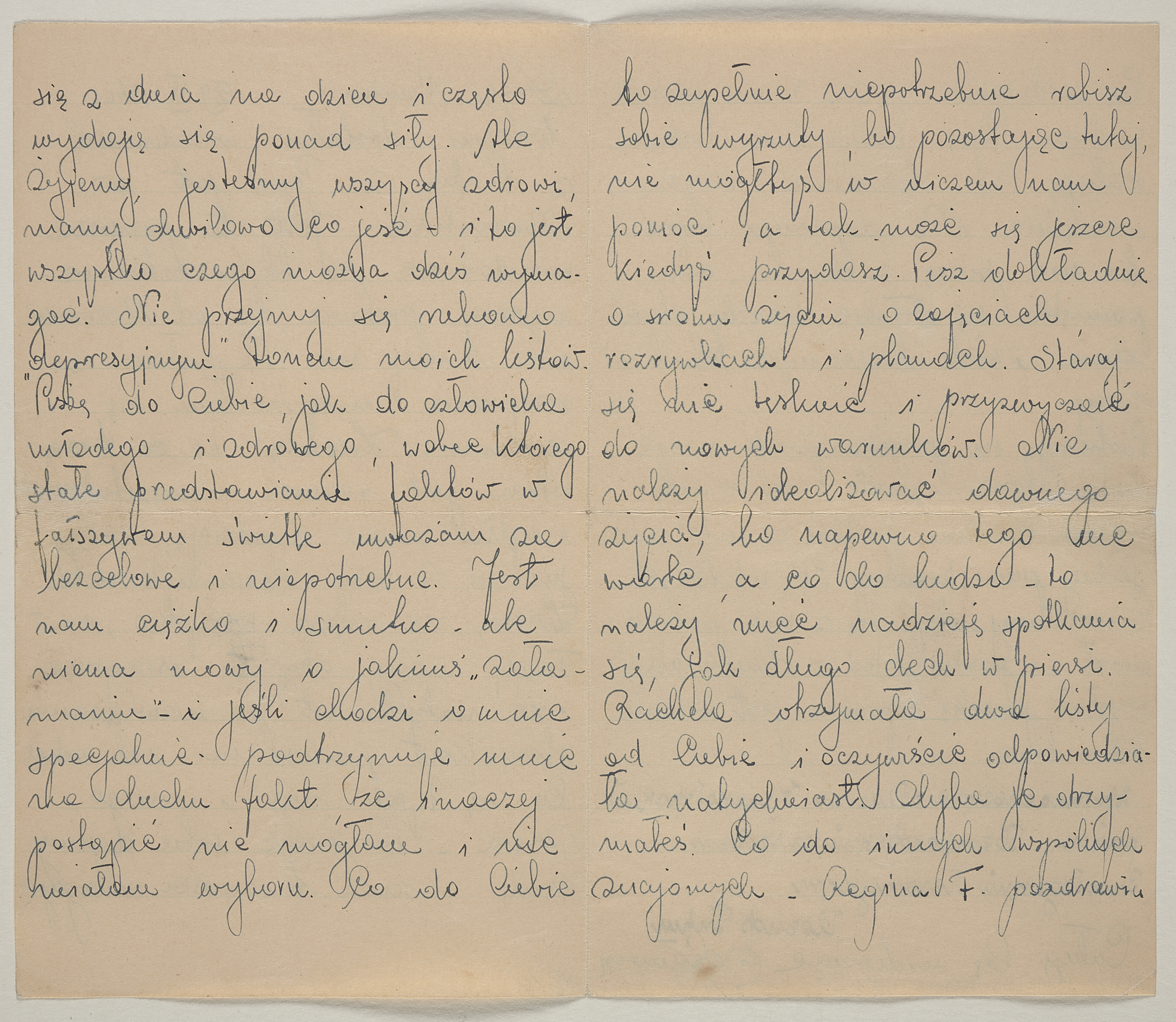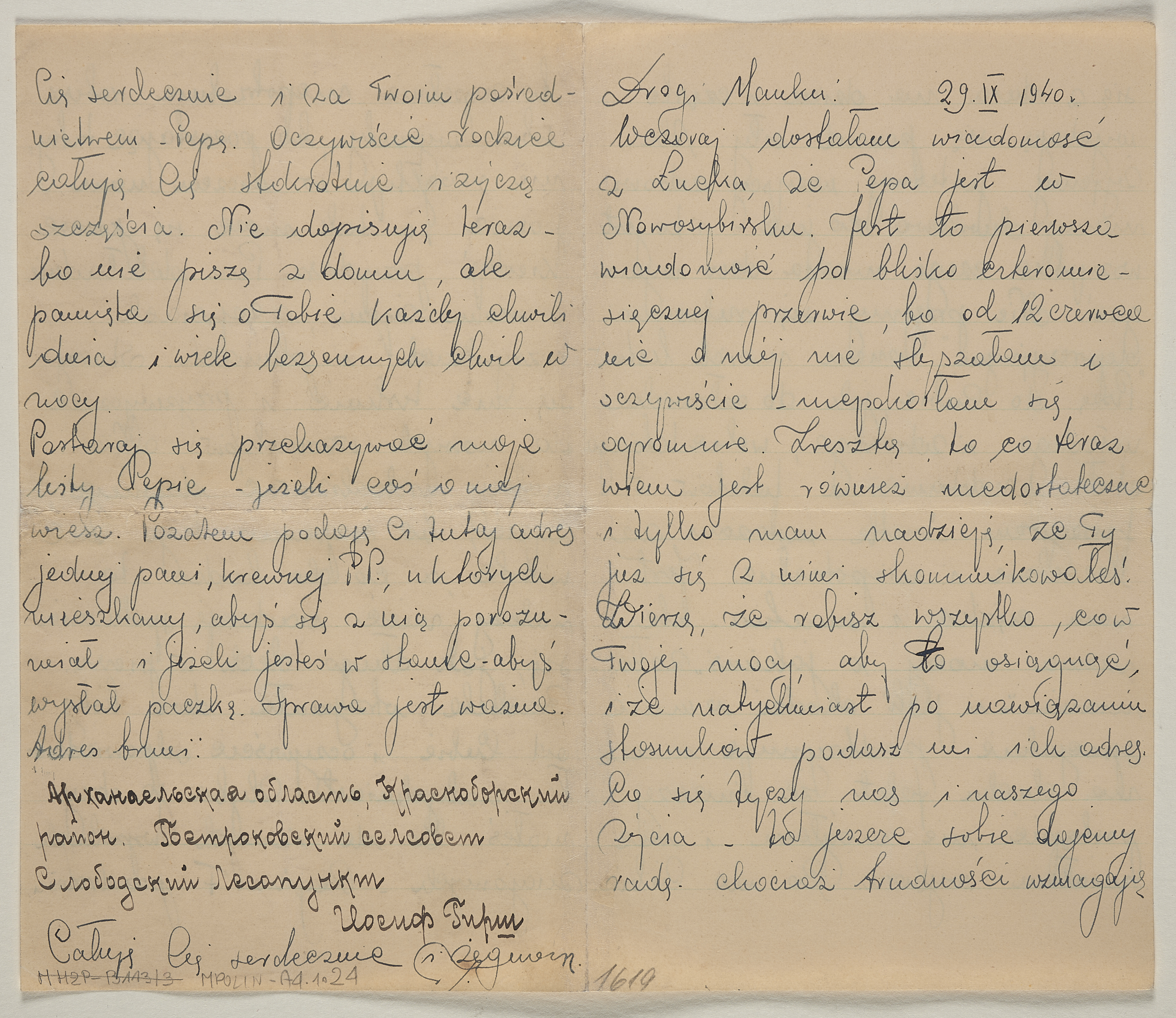 List do Emanuela Justmana od rodziny z Warszawy - od Reginy Justman. Treść: siostra pisze do brata o tym, że otrzymała wiadomość od Pauliny Włodawer, że ta przebywa na Syberii. List z okresu, kiedy pozostała w Warszawie część rodziny musiała już opuścić Pańską 69. Fragment listu: ,,jeśli chodzi o mnie specjalnie, podtrzymuje mnie na duchu fakt, że inaczej [niż zostać w Warszawie? - dop. red.] postąpić nie mogłam i nie miałam wyboru. Co do Ciebie, to zupełnie niepotrzebnie robisz sobie wyrzuty, bo pozostając tutaj, nie mógłbyś w niczem nam pomóc, a tak może się jeszcze kiedyś przydasz. [...] Gdyby nie świadomość, że jestem im [rodzicom - red.] potrzebna, niedzownie potrzebna, cała ta mordęga byłaby zupełnie bezsensowna i nie do zniesienia. A więc wędruję codziennie ulicami miasta, które w niczem nie przypomina tej dawnej jasnej wielkiej Warszawy. Ohydny stwór, dziwoląg okaleczony[,] kadłub owrzodzony i jęczący. Klątwa jakaś padła na miasto, nawet niebo się rozgniewało i odmienił się klimat. Mrozy, śnieżyca i wichry trapią nieszczęśliwców, którzy tak się bali Syberji. Ale gdy wszyscy są przeciwko nam, dwaj sprzymierzeńcy pozostali wierni: czas i nadzieja. W tym chaosie jedno jest pewne: czas posuwa się naprzód; jeszcze trochę, a śniegi stopnieją, wichury się uciszą, a wojna tak czy owak musi się jednak skończyć". Na ostatniej stronie prośba o przekazywanie tych listów przez brata Paulinie Włodawer, oraz prośba o kontakt i przekazanie (,,jeśli jesteś w stanie") paczki krewnej rodziny, u której Justmanowie mieszkają. Adres kobiety zapisany innym charakterem pisma i cyrylicą. W lewym dolnym rogu pierwszej strony pochyłym pismem (innym niż Reginy Justman) i ołówkiem nr: 1619.