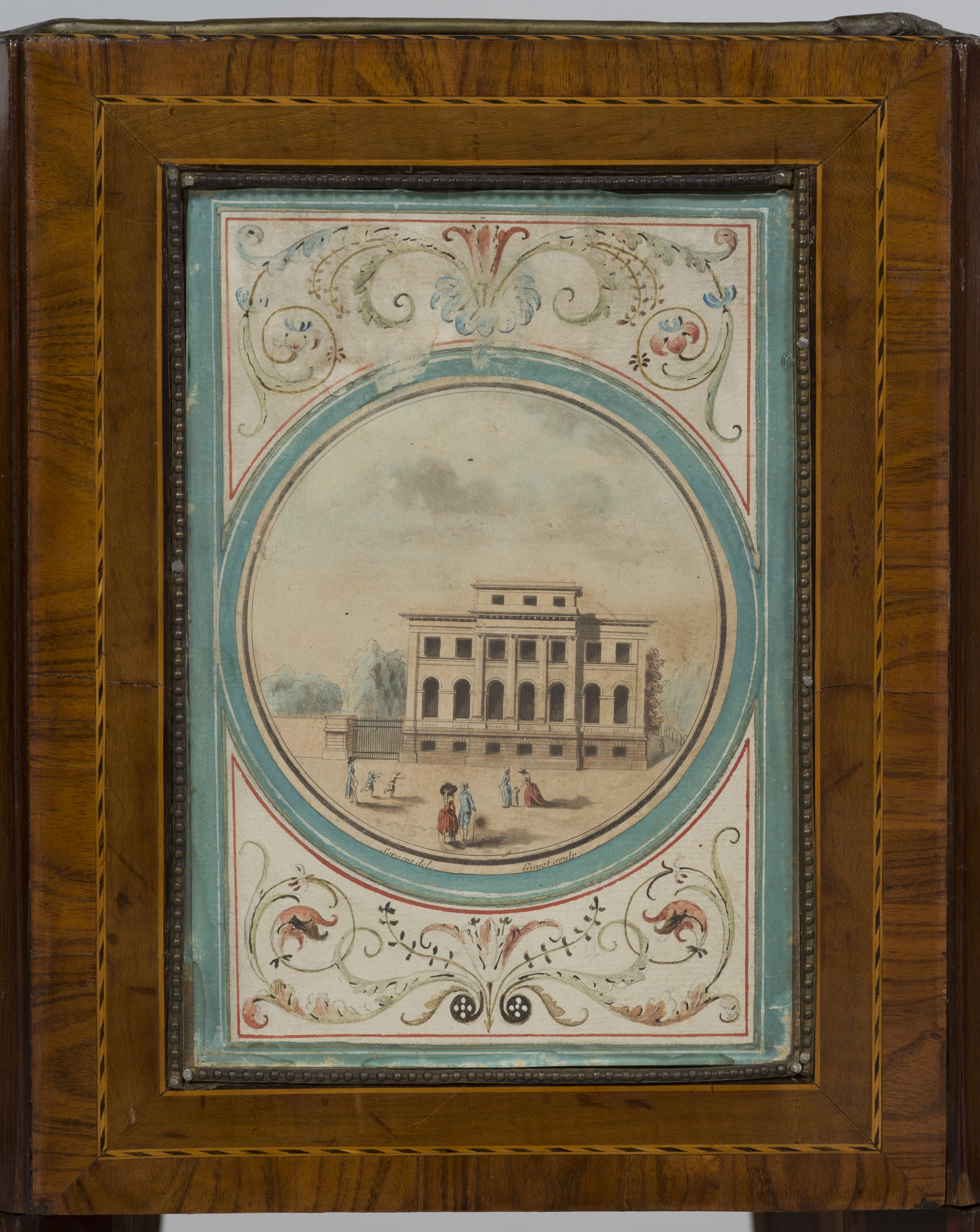 Mebel klasycystyczny w formie prostopadłościennej skrzyneczki o lekko ściętych narożach wpartej na czterech nóżkach o przekroju kwadratu, zwężających się ku dołowi, zakończonych kulką. Wnętrze mieści wyjmowaną wkładkę metalową o tym samym kształcie, z dwoma uchami. Powierzchnia mebla zdobiona jest dekoracyjnymi fornirami i intarsją podkreślającymi kształty płaszczyzn i stanowiącymi oprawę dla dekoracji ścianek i narożników. Prostokątne ścianki zdobią cztery okrągłe ryciny z widokami Paryża w ujęciu i perełkowania z brązu złoconego: Pałac Tuilleries, Hôtel de Luksemburg, Panteon i Łuk Triumfalny. Rezerwy powyżej i poniżej rycin oraz narożniki wypełnione są ręcznie malowanymi barwnymi arabeskami, przypisywanymi autorowi dekoracji arabeskowych w zamku łańcuckim włoskiemu malarzowi Vincenzo Brennie.