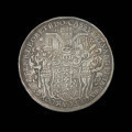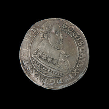 Panowanie księcia Bogusława XIV (1620–1637) w całości przypadało na okres wojny trzydziestoletniej. Księstwo pomimo polityki neutralności, jako część Rzeszy ponosiło koszty wojny. Ostatecznie w 1627 roku poddało się dyktatowi i okupacji kraju przez wojska cesarskie. Utrzymanie obcej armii doprowadziło do załamania rynku pieniężnego. Na monety przebijano srebra zarekwirowane z kościołów, dworów, a nawet z książęcego skarbca. Dramat sytuacji polegał na tym, że była to produkcja ukierunkowana na płatności dla cesarskich wojsk stacjonujących na Pomorzu podczas wojny, a nie na poprawę finansów księstwa. Ostanie lata panowania księcia Bogusława XIV przyniosły wyraźny wzrost emisji monet, szczególnie talarów i dukatów. Serie talarów (ok. 120 odmian stempli) masowo produkowano w Szczecinie i Koszalinie. W większości mają portretowe ujęcie popiersia lub półpostaci księcia na awersie i wielopolową tarczę herbową na odwrocie. Dwutalar pojawił się pod koniec panowania, mocno schorowanego Bogusława XIV. Choć różni się od innych monet obiegowych i dekoracyjnością bardziej przypomina medal, wybity został zgodnie ze standardami. Emisja talarów medalowych pojawiła się wkrótce po uchwaleniu wewnętrznych reform państwa (1934), w krytycznej sytuacji politycznej i spodziewanej śmierci księcia. Ze względu na przedstawienia daje nam pewne pojęcie o ideologii pomorskiego dworu. W mennictwie pomorskim jest to jedyny wizerunek konny władcy, do tego w tak dynamicznym i pomnikowym ujęciu. Towarzyszący jeźdźcowi atrybut – pałka, tzw. regiment, podobnie jak motyw architektoniczny na drugim planie rewersu, bardziej oddają treść ceremonialną niż militarną. Wielki herb Pomorza i pełna tytulatura uzupełniają propagandowy charakter emisji. Stemplem talara, oprócz podwójnych sztuk, wybito również okazy w złocie o wadze 10 dukatów, wszystkie przeznaczone dla wąskiego kręgu ówczesnych elit. Moneta pochodzi z kolekcji Helmuta Hahna i do zbiorów muzealnych została nabyta w 2013 roku na aukcji w Berlinie.
