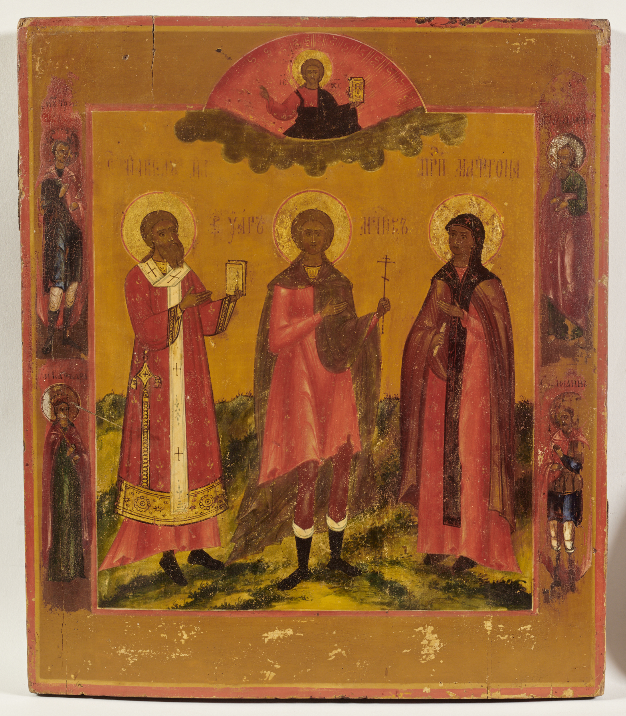Sobór Świętych – to zestawianie kilku i więcej postaci różnych świętych w jednym przedstawieniu. Ikony takie często stosowano w domowym użytku. Obrazowano świętych otoczonych szczególnym kultem i orędowników w konkretnych potrzebach, do których zanoszono prośby i modlitwy wierząc w ich skuteczne wstawiennictwo. Opisywana ikona prezentuje męczenników i świętych, którzy byli prześladowani za wiarę chrześcijańską. Centralne miejsce zajmuje stojący po środku rzymski żołnierz o imieniu Warus, który został zgładzony w Aleksandrii ok. 304 r., czczony przez katolików i prawosławnych. W jego otoczeniu po prawicy stoi prawdopodobnie biskup Neocezarei św. Paweł, prześladowany i więziony przez cesarza Licyniusza - jednego z rzymskich tetrarchów, a po lewicy błogosławiona Matrona – żyjąca w V w. mniszka i założycielka żeńskiego monasteru w Konstantynopolu, początkowo nierozpoznana ukrywała się przed prześladowaniami męża w męskim monastyrze. Postacie ukazane na bordiurze ikony należą do tej samej kategorii świętych.