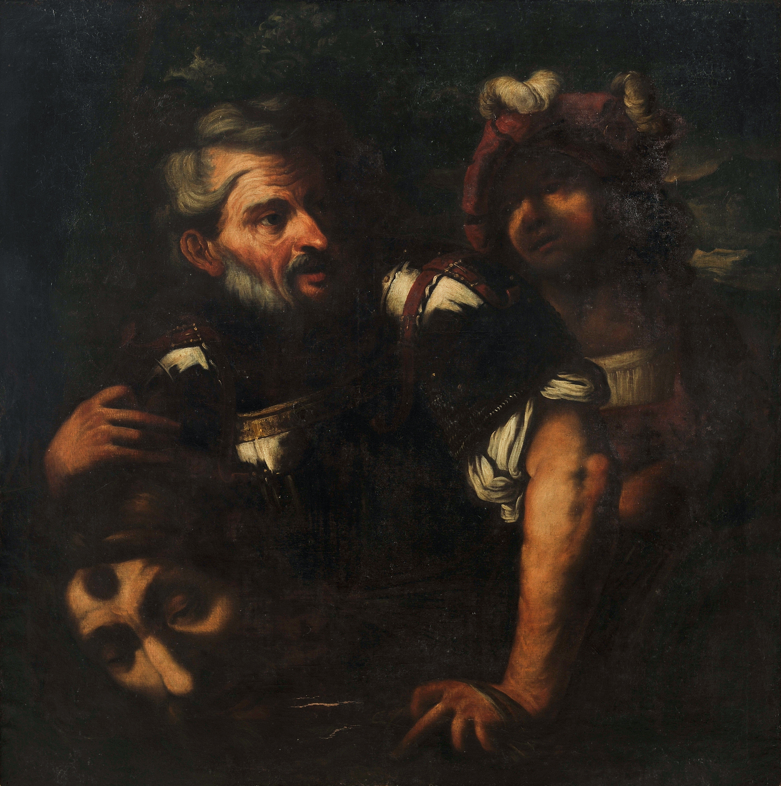 Pierwowzorem obrazu jest dzieło Pietra della Vecchii (1603-1678), Saul i David z głową Goliata. (znane są m.in. wersje z Chrysler Museum of Art i Schorr Collection). W swojej karierze artysta tworzył w różnych stylach artystycznych i ulegał różnorodnym wpływom, w tym artystów współczesnych, a także artystów z poprzedniego wieku. Umiejętnie łączył monumentalność XVI-wiecznej sztuki weneckiej artystów takich jak Tycjan i Tintoretto z dramatycznymi efektami stylu caravaggionistów. Przez jego płótna przewijają się postaci mężczyzn w strojach podobnych do widzianych tutaj, charakterystyczne są zwłaszcza berety z piórami.