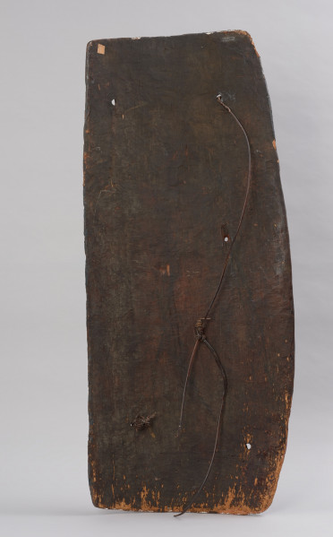 Papuasi zamieszkujący Nową Gwineę od pokoleń żyli w małych i izolowanych wioskach. Nieustannie toczyli między sobą wojny, w których nieodłącznymi atrybutami były tarcze i oszczepy. Tarcze, wraz z innymi obiektami kultu, do których się zaliczają, przechowywano w tzw. Domach Duchów, melanezyjskich świątyniach, do których wstęp mieli jedynie wtajemniczeni mężczyźni. Przed podjęciem decyzji o wyprawie wojennej zasięgano rady przodków „zamieszkujących” tarcze. Duchy czynnie włączały się do walki z wrogiem i potęgując ochronną siłę tarcz osłabiały przeciwnika, niszcząc w nim ducha walki. Prezentowana dwuosobowa tarcza wojenna atkom została wykonana przez przedstawicieli grupy etnicznej Faiwolmin, zamieszkujących Prowincję Zachodnią w Papui-Nowej Gwinei. Jest wyjątkowa, ponieważ wyrzeźbiono ją kamienną siekierką – pozostałe tarcze z oceanicznej kolekcji Muzeum Narodowego w Szczecinie wykonano narzędziami metalowymi. Jej front jest pokryty dużym, centralnie umieszczonym motywem motyla, który otocza gąszcz powtarzalnych figur geometrycznych. Zygzaki po bokach imitują węże, natomiast powtarzające się linie w górnej i dolej części kompozycji przedstawiają szczęki krokodyla. Rysunek wykonano techniką champlevé, w której barwnik wypełnia wgłębienia. Tarcze wojenne często zdobiono wizerunkami przodków, rysunkami twarzy dawnych, dzielnych wojowników. Miały być widoczne z dużej odległości, tak aby ukryta w nich symbolika mogła być łatwo odczytana przez wrogów. Bogata ornamentyka świadczyła również o odwadze wojownika, albowiem malowane tarcze szybciej przyciągały wzrok nieprzyjaciół. Wraz z ustaniem wojen zmienił się wygląd nowogwinejskich tarcz. Wielkie, których rolą było zakrycie całego wojownika znacznie się zmniejszyły. Nadawano im czysto rytualne i symboliczne znaczenie. Omawiana tarcza jest darem od ks. André Boucharda z Catholic Mission z miejscowości Kiunga. W muzealnych zbiorach znalazła się dzięki współpracy z dr Marią Wrońską-Friend i jej mężem Anthonym Friendem. Wrońska-Friend jest etnolożką i antropolożką, która w latach 1981–1992 mieszkała i prowadziła badania na Nowej Gwinei.