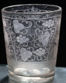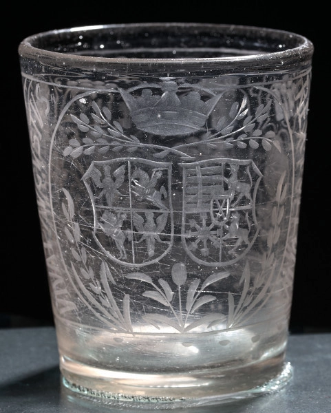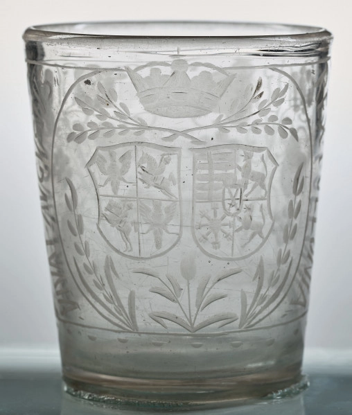Szklanka wykonana została w polskiej, nieokreślonej wytwórni szkła w pierwszej ćwierci XVIIw. Jest to szklanka z grubego szkła, stożkowata, zdobiona na całej powierzchni. Z przodu dwie tarcze herbowe: herb Rzeczypospolitej i herb dynastii saskiej Wettinów, ujęte gałązkami roślinnymi, nad nimi korona królewska. Na bokach szklanki biegnie napis: VIVAT AUGUSTUS/ REX POLLONIA. Z tyłu szklanka zdobiona jest pędami winnej latorośli. Dno naczynia grube, z pełnego szkła, matowe od spodu.