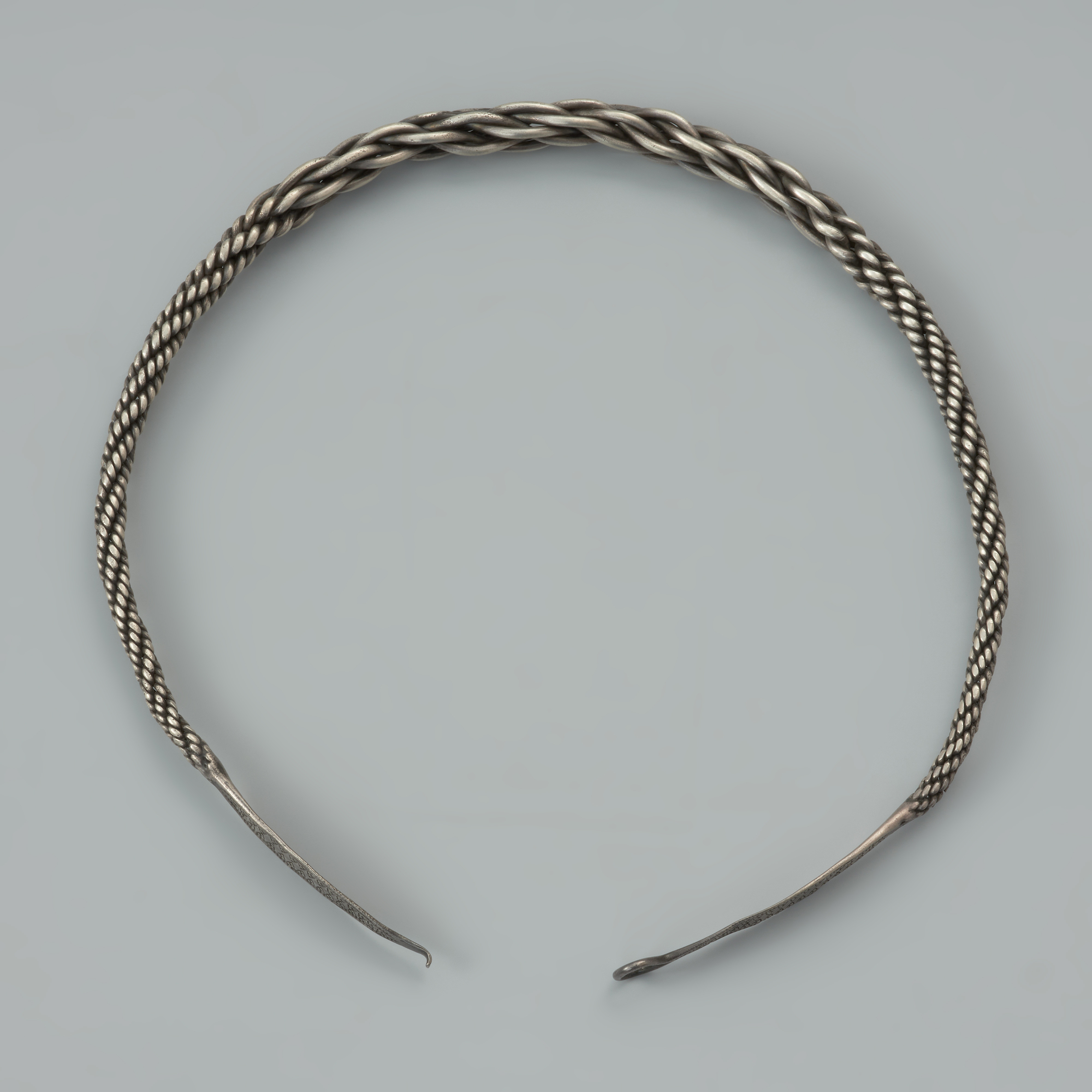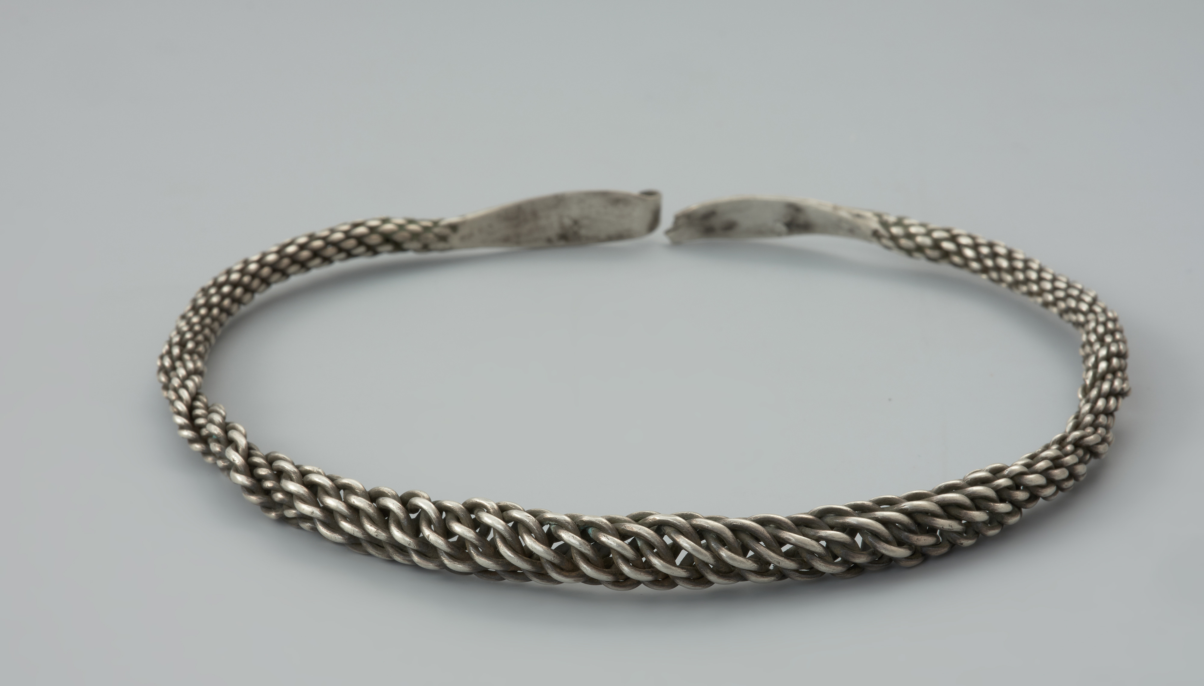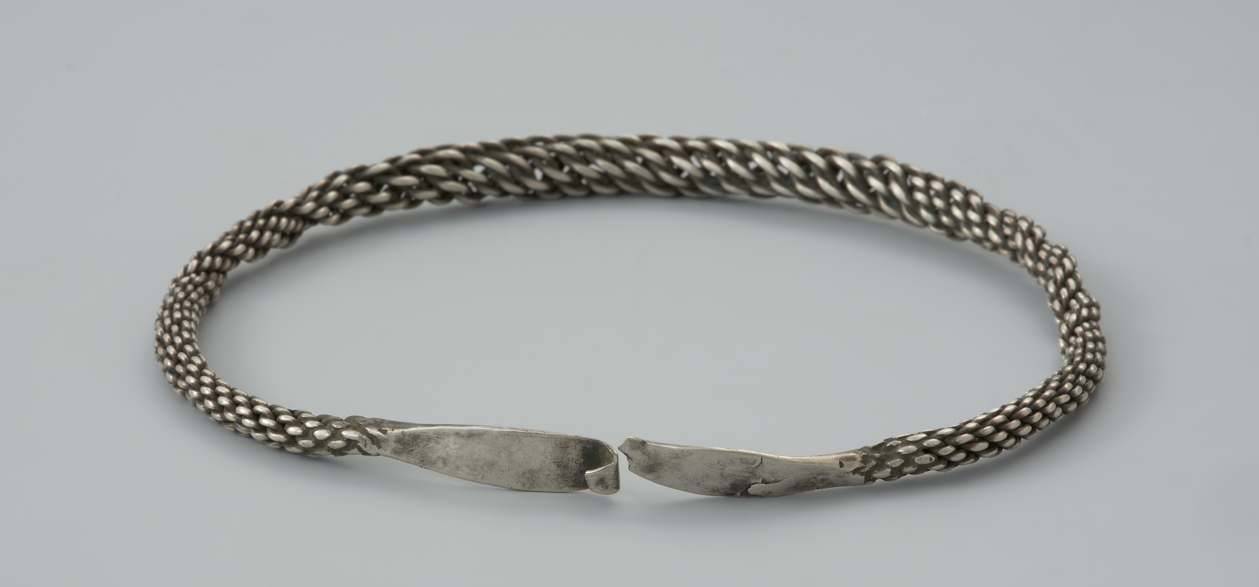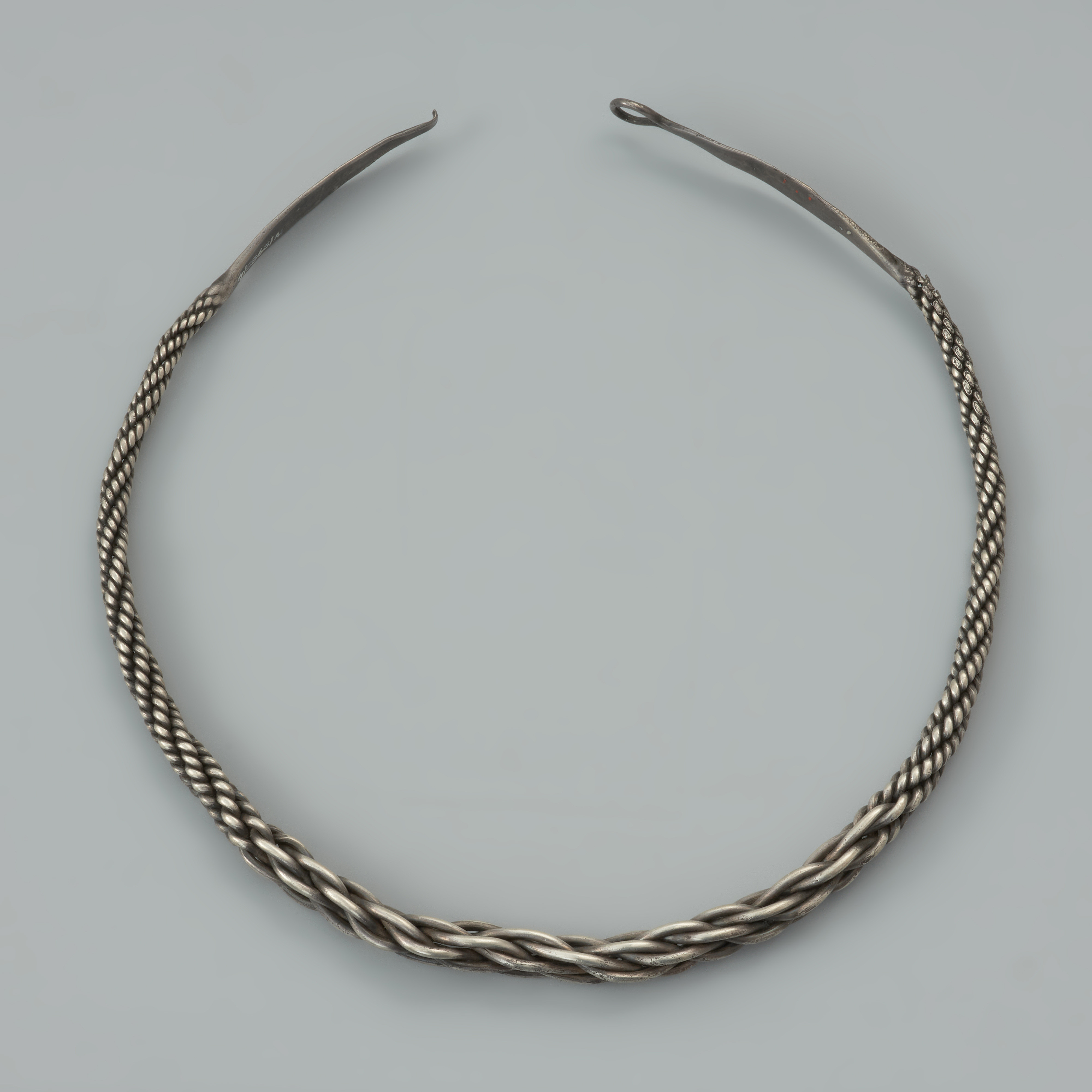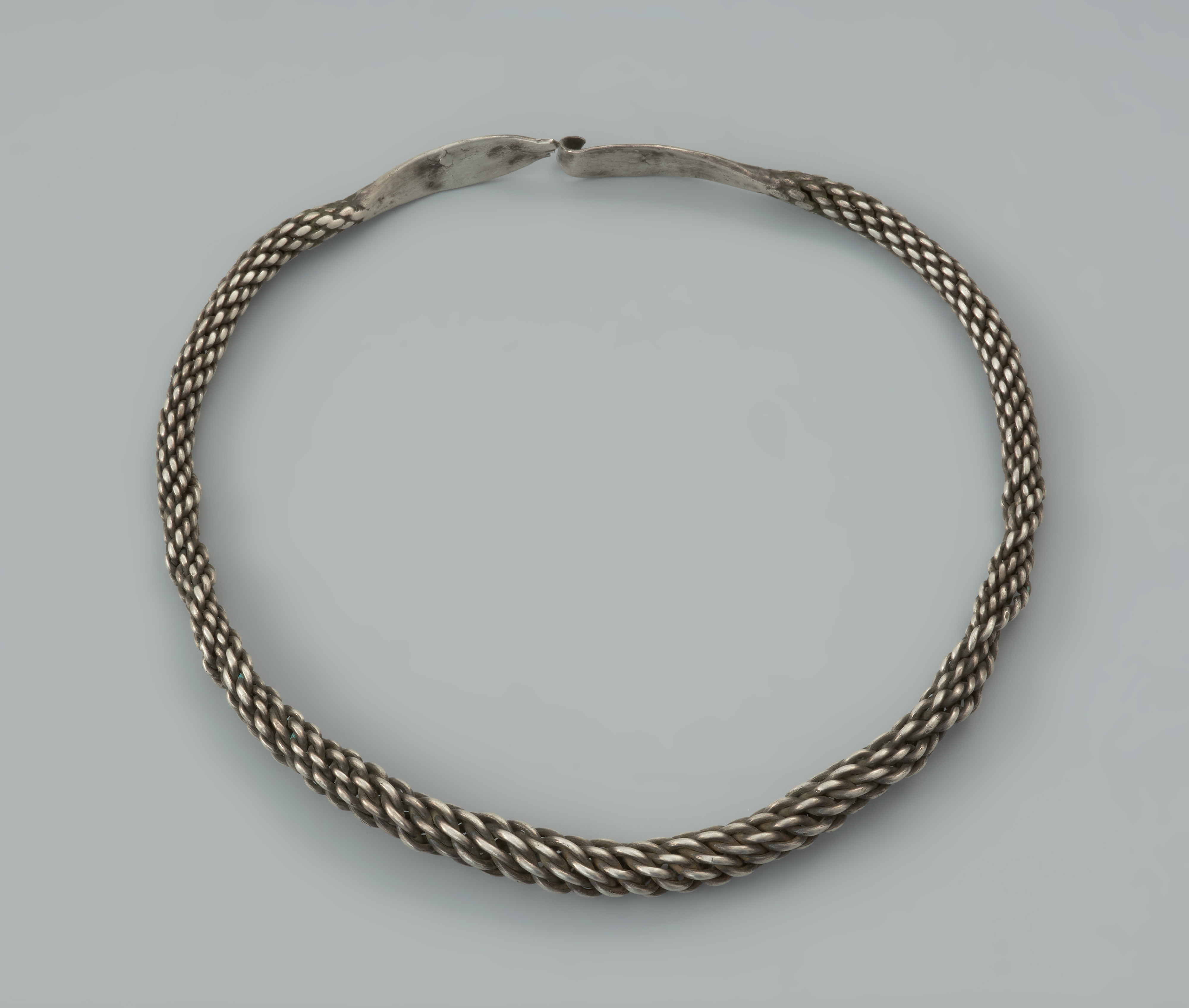 Naszyjnik spleciono z pięciu par drutów owiniętych wokół siebie. Końcówki są rozklepane w owalne, niezdobione płytki. Jedną z nich zakończono haczykiem, końcówka drugiej jest ułamana. W części środkowej druty są skręcone luźniej, co powoduje, że obręcz jest w tym miejscu grubsza.