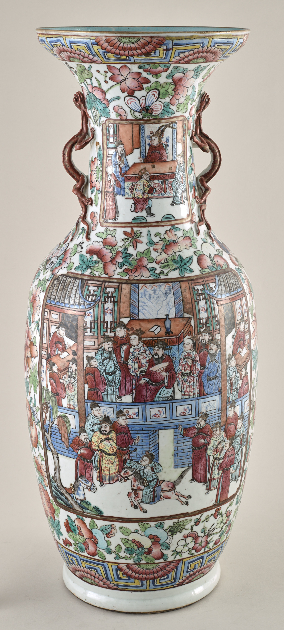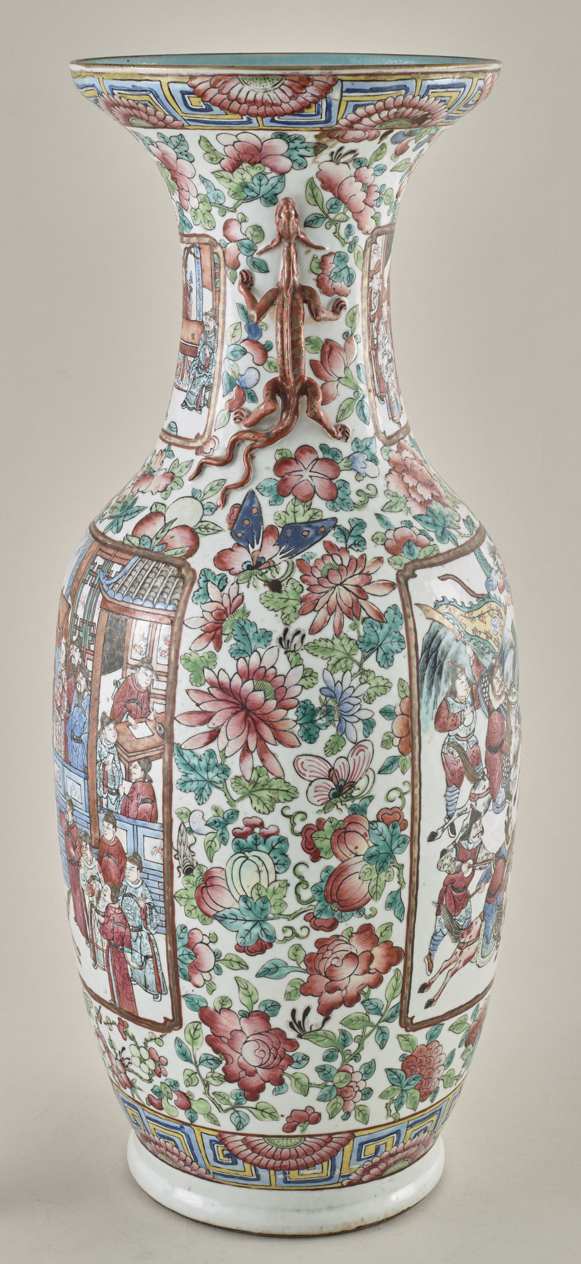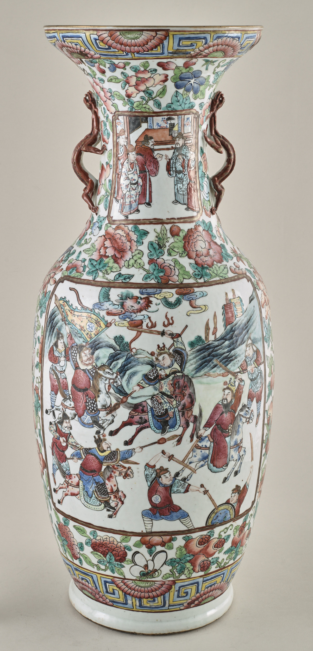 Wazon z grubej porcelany. Dno okrągłe, lekko wyodrębnione, brzusiec owoidalny (w kształcie jaja), szyja wydłużona, zakończoną brzegiem podobnym do nałożonej miseczki. Na szyi dwa uchwyty w kształcie stylizowanych smoków, czerwono - złotych. Dekoracja na białym tle w gamie barwnej „familie rose” - kwiaty, owoce, motyle oraz sceny z legend z okresu „Sześciu Dynastii” (III-VI wiek) Wnętrze turkusowo-zielone. Określenie porcelany z „rodzinny różanej” czyli familie rose zdefiniował w XIX wieku Albert Jacquemart i nie jest to zbieżne z chińskim, fachowym określeniem technologii zdobienia. Zwrot używany w Chinach to fencai, tłumaczone jako „kolory pudrowe” lub yangcai – „kolory obce”. Zastosowana różowa emalia pochodziła z koloidu złota odkrytego około 1670 roku i została sprowadzona do Chin około 1720 roku. Stosowano również bardziej ogólny termin falangcai „kolory szkliwa” lub ruancai „miękkie kolory”. Dekorację w typie famille rose zaczęto stosować pod koniec lat 20 XVIII w. Najlepsze przykłady porcelany tego typu pochodzą z okresu Yongzheng (1723-1735). Pod koniec okresu Kangxi barwę różową zaczęto używać do malowania płatków kwiatów na porcelanie. Dekoracja ta stała się tak popularna w Europie, że w okresie rokoko nagminnie sprowadzano porcelanę tego typu na nasz kontynent. Porcelana, farby emaliowe na szkliwie. Chiny, wyrób eksportowy do Europy, XIX/XX wiek.