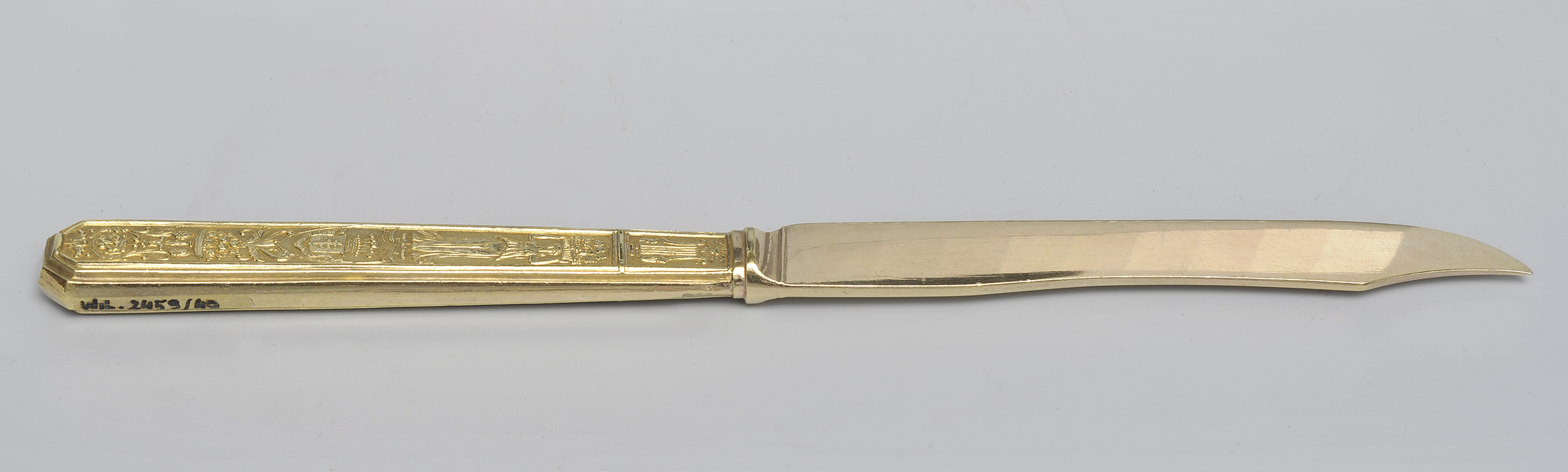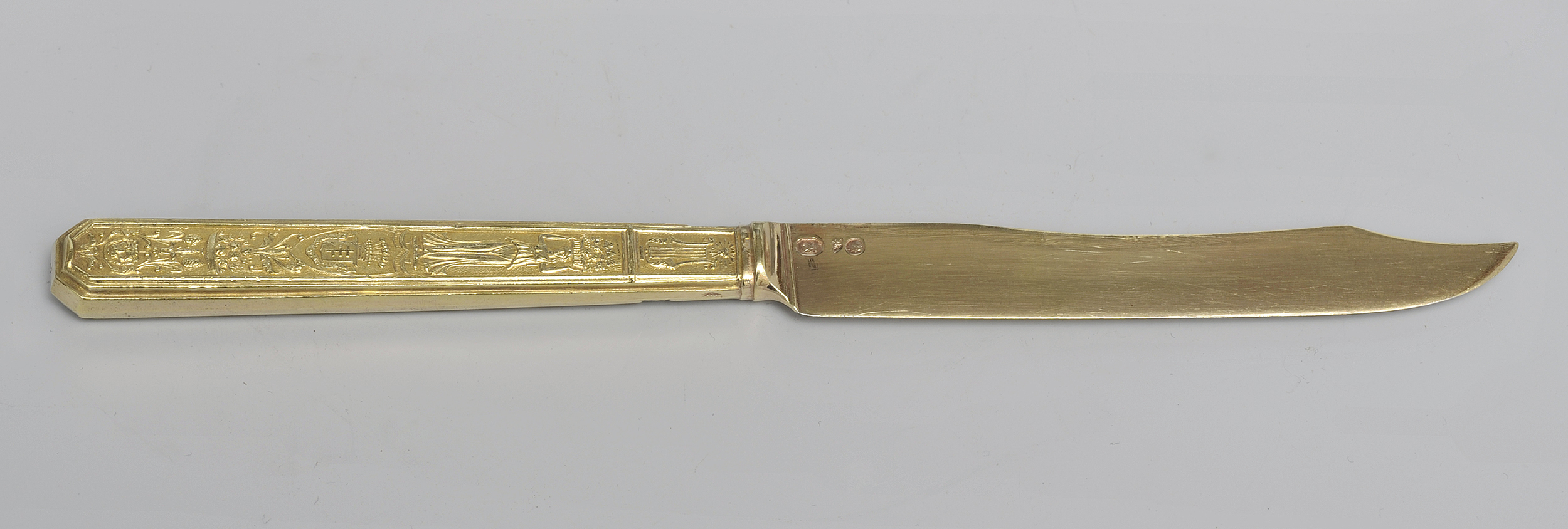 Prezentowany sztuciec jest jednym z siedemdziesięciu dwóch noży deserowych zachowanych w wilanowskiej kolekcji. Co ciekawe, cały komplet na 72 osób wykonany został przez dwóch złotników. Łyżki i widelce wykonał Dominique F. Naudin, a noże Martin G. Biennais.