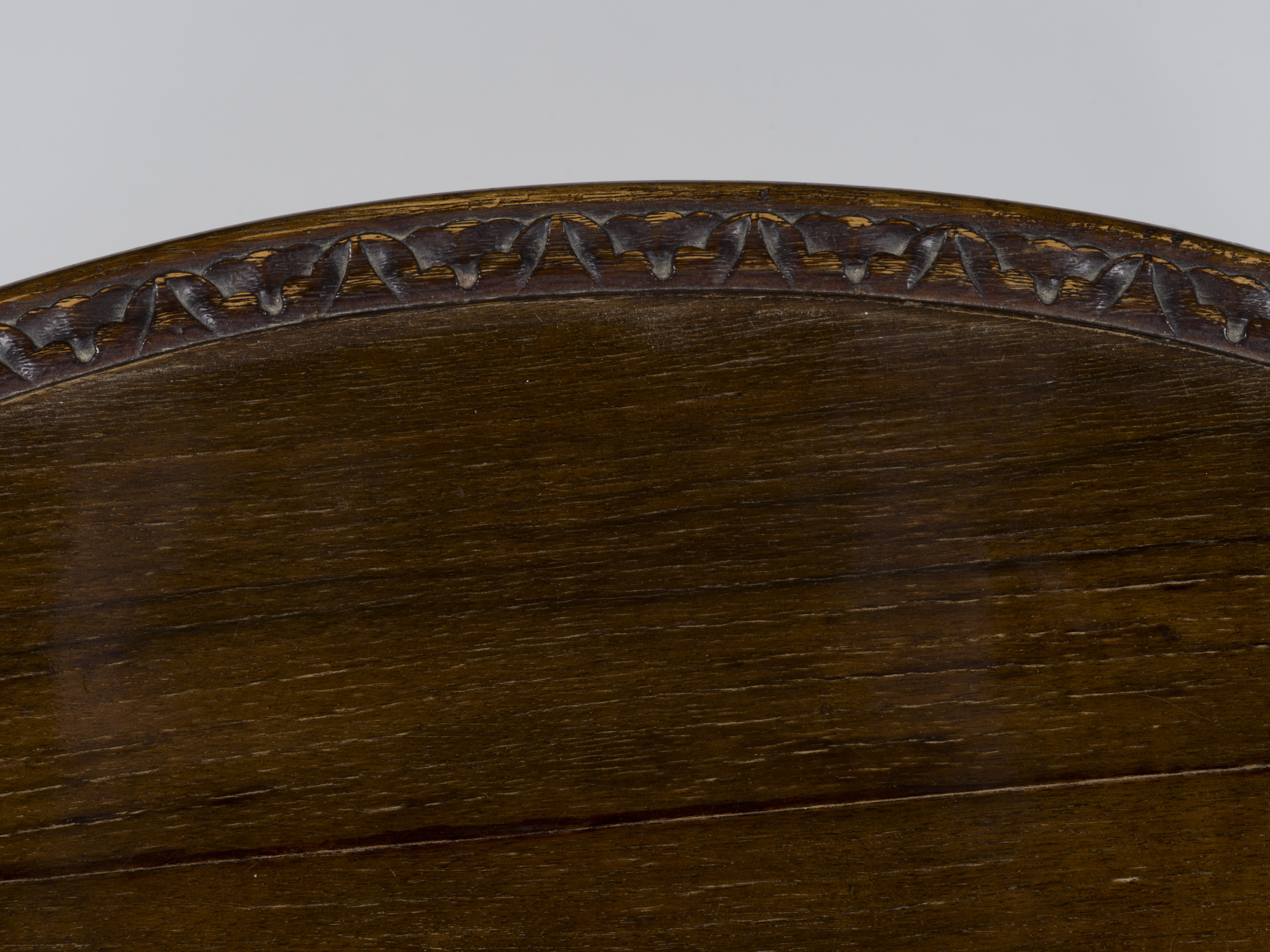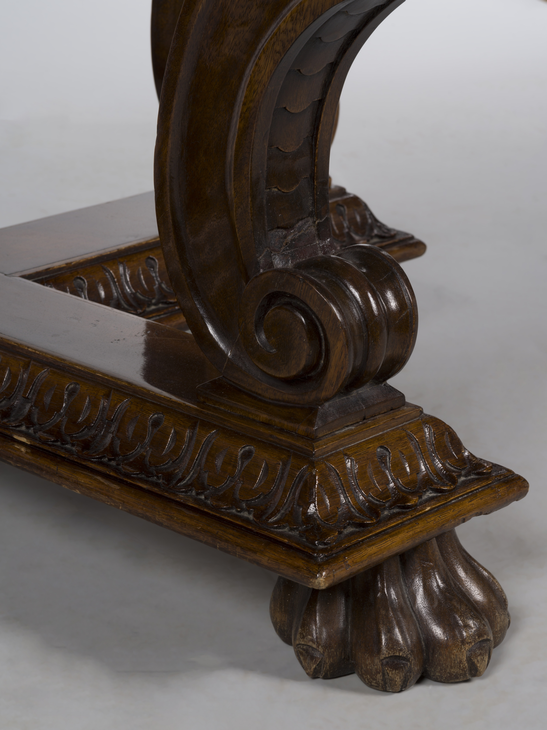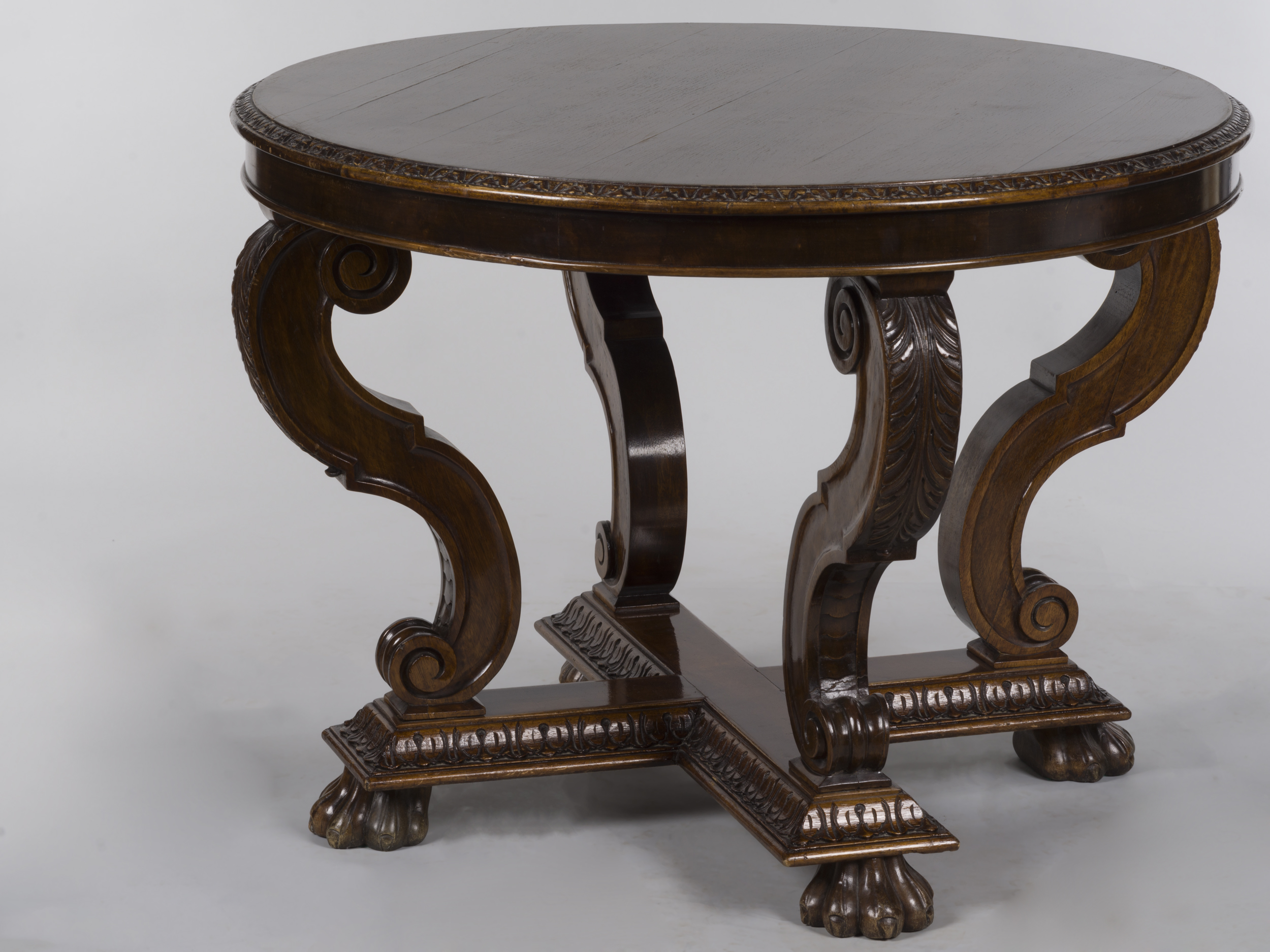Stół o okrągłym blacie, nieznacznie wysuniętym przed lico gładkiej cargi, ozdobionym na fazowanej krawędzi płaskorzeźbionym pasem fryzu akantowego a dalej gładkim półwałkiem. Carga gładka, wzdłuż dolnej krawędzi opatrzona półwałkiem podobnym jak na krawędzi blatu, oparta na czterech esowatych nogach podwójnie przełamanych pośrodku, z podwójnymi wolutami, u góry szerszymi, wywiniętymi do środka, dołem mniejszymi, wywiniętymi na zewnątrz. Na przedniej płaszczyźnie nogi zostały ozdobione płaskorzeźbioną dekoracją, w górnej części z motywem liścia akantu, w dolnej ornamentem cekinowym. Boki nóg na krawędziach zostały wykończone zostały płaskorzeźbioną gładką wstęgą, podkreślającą skręt wolut oraz ich przełamanie pośrodku nóg. Dolne woluty nóg wsparte zostały na końcach ramion profilowanego krzyżaka o przekroju trapezu rozszerzającego się ku dołowi, Krzyżak oparty jest na czterech masywnych lwich łapach.