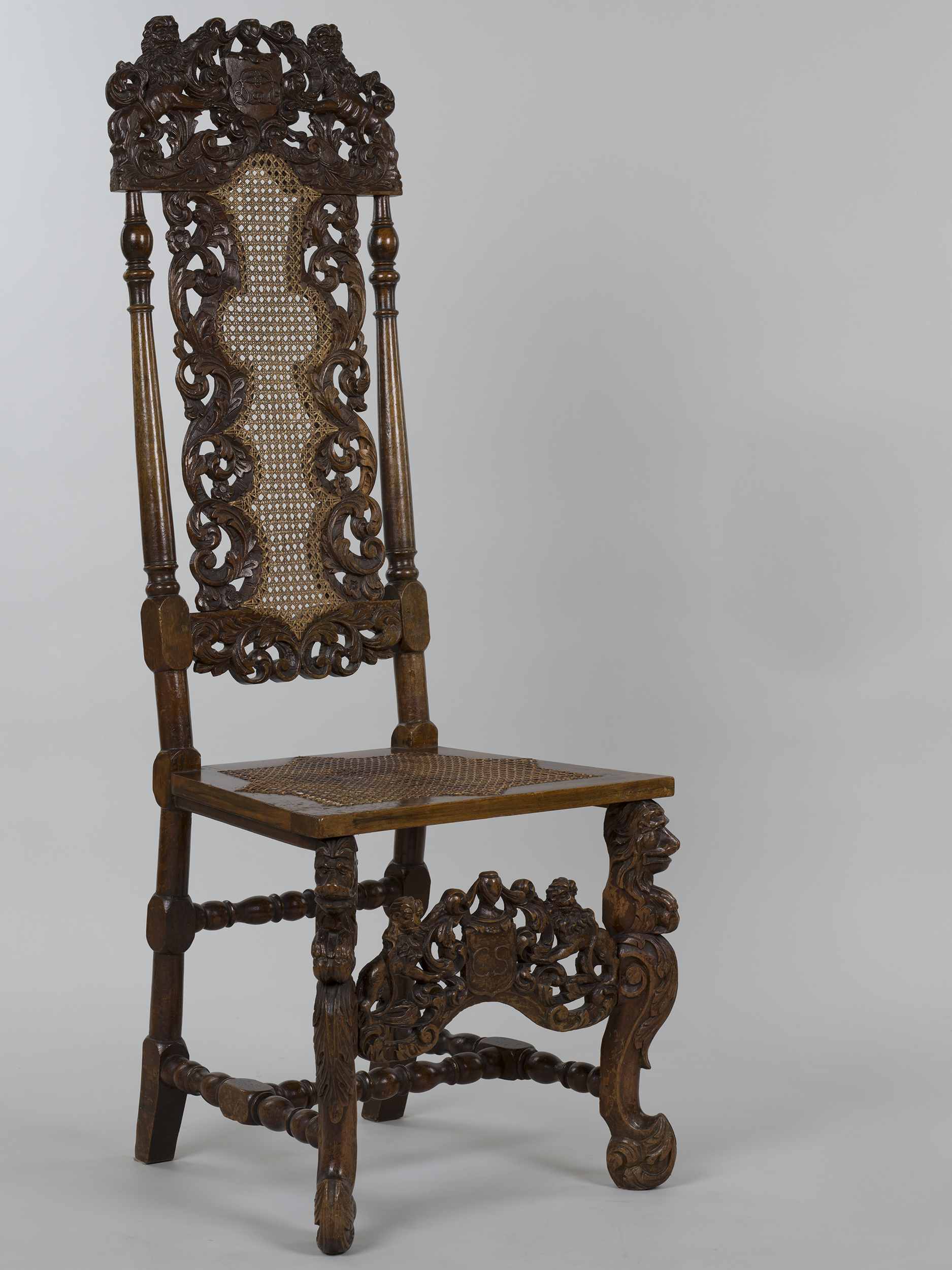Mebel w stylu niderlandzkiego baroku o bogato rzeźbionych częściach konstrukcyjnych zdobionych motywem liści akantu, kolumienek w oparciu pleców i stylizowanych lwich głów u nasady przednich nóg. Ażurowe oparcie pleców i siedzisko wypełnione zostało plecionką trzcinową. W zwieńczeniu oparcia tarcza herbowa, z nie zidentyfikowanym wiązanym monogramem podtrzymywana przez dwa lwy. Podobna dekoracja znajduje się na ażurowym wiązaniu przednich nóg; na tarczy herbowej podtrzymywanej przez dwa lwy znajduje się monogram C S. Pierwotnie krzesło wchodziło w skład wyposażenia Biblioteki Wilanowskiej co zostało uwiecznione na obrazie Wilibalda Richtera Willanów, Biblioteka Augustostwa Potockich dawna Sala Uczt Jana III. W 1867 r. rejestrowano je w Galerii Obrazów Muzeum zwanej, w okresie przed II wojną światową pełniło funkcje użytkowe prywatnych pomieszczeń rodziny Branickich, w jadalni prawego skrzydła. Obecnie eksponowane jest w apartamentach królewskich pałacu wilanowskiego.