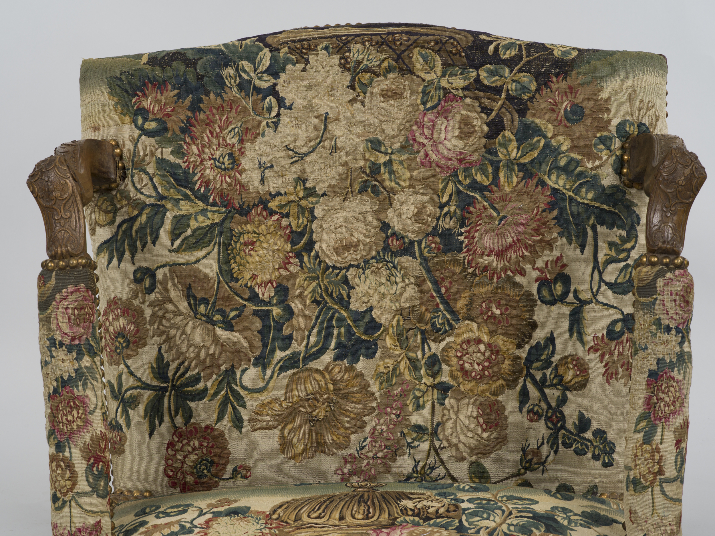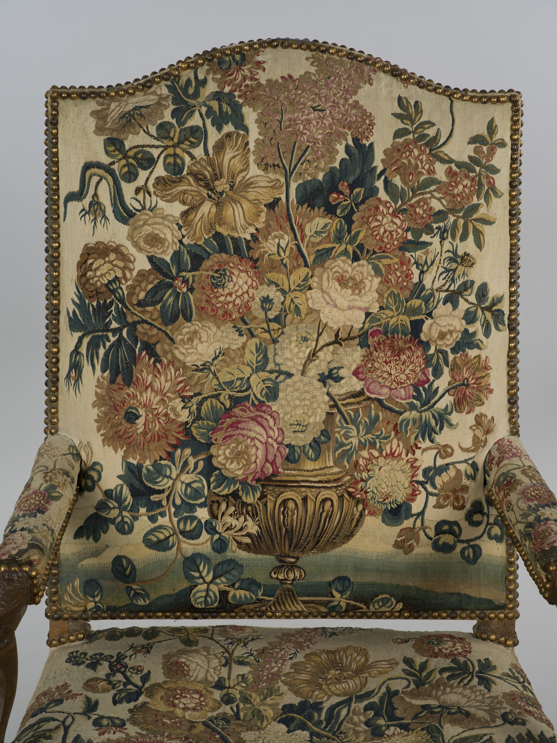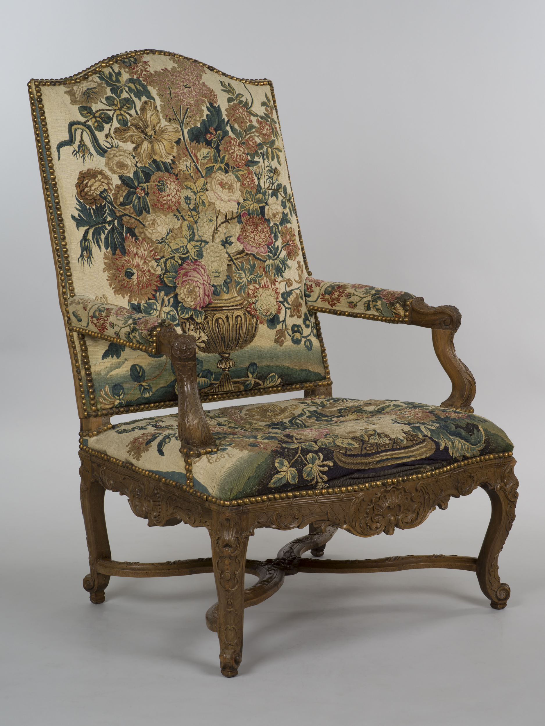 Fotel należy do jednego z trzech w zbiorach wilanowskich kompletów francuskich mebli w stylu regencyjnym, krytych gobelinem o wysokiej wartości artystycznej, składającego się pierwotnie z kanapy i dwunastu foteli. Reprezentuje typ à la raine, - oparcie pleców oddzielone od siedziskia, zachowało jeszcze barokowy kształt prostokąta o lekko sfalowanej górnej krawędzi. Falista linia pozostałych elementów krawędzi zaciera linie konstrukcyjne mebla. Siedzisko wsparte jest na czterech wygiętych nóżkach typu cabriole; widoczne części drewnianej konstrukcji: rama oskrzynia, nóżki i ich krzyżowe wiązania w naturalnym kolorze drewna pokrywa bogata rzeźba z wiotkimi liniami gałązek oplatającymi ramy, liśćmi akantu oraz muszlami akcentującymi podziały kompozycyjne nadając mu walor lekkości. Podkreśla go wielobarwna tkanina gobelinowa pokrywająca oparcie pleców, poręcze i siedzisko, przedstawiająca wspaniałe kompozycje kwiatów znanych z barokowych obrazów mistrzów flamandzkich. W części centralnej oparcia imponujący bukiet w dekoracyjnej wazie, na siedzisku kwiaty w misie. Rzędy główek dekoracyjnych ćwieków mocujących tkaninę do konstrukcji drewnianej dają dyskretne złote refleksy. Komplet mebli pod koniec XVIII w. stanowił wyposażenie Apartamentów ks. Izabeli Lubomirskiej, później dekorowały dawne Apartamenty Królewskie. Obecnie z kompletu zachowała się kanapa (Wil.964) i sześć foteli (Wil. 962/1-6).