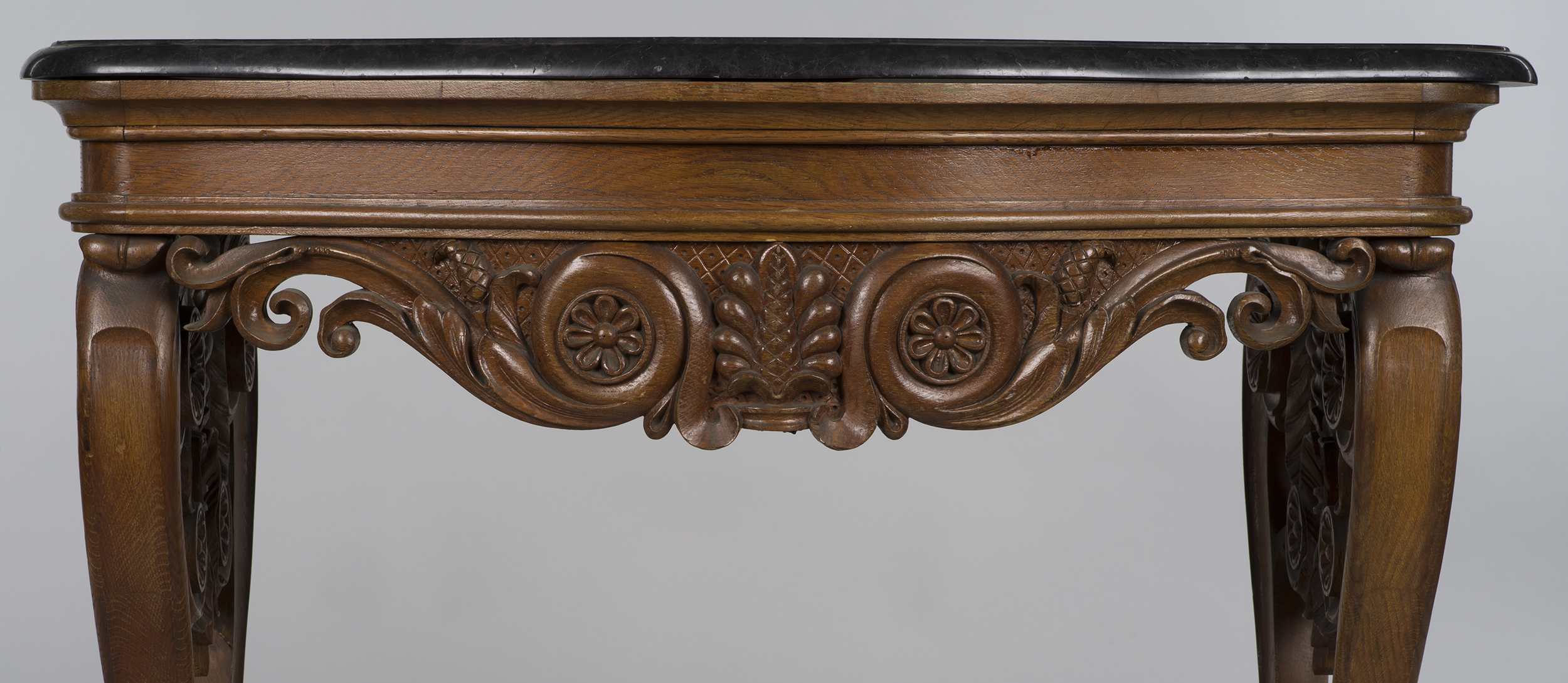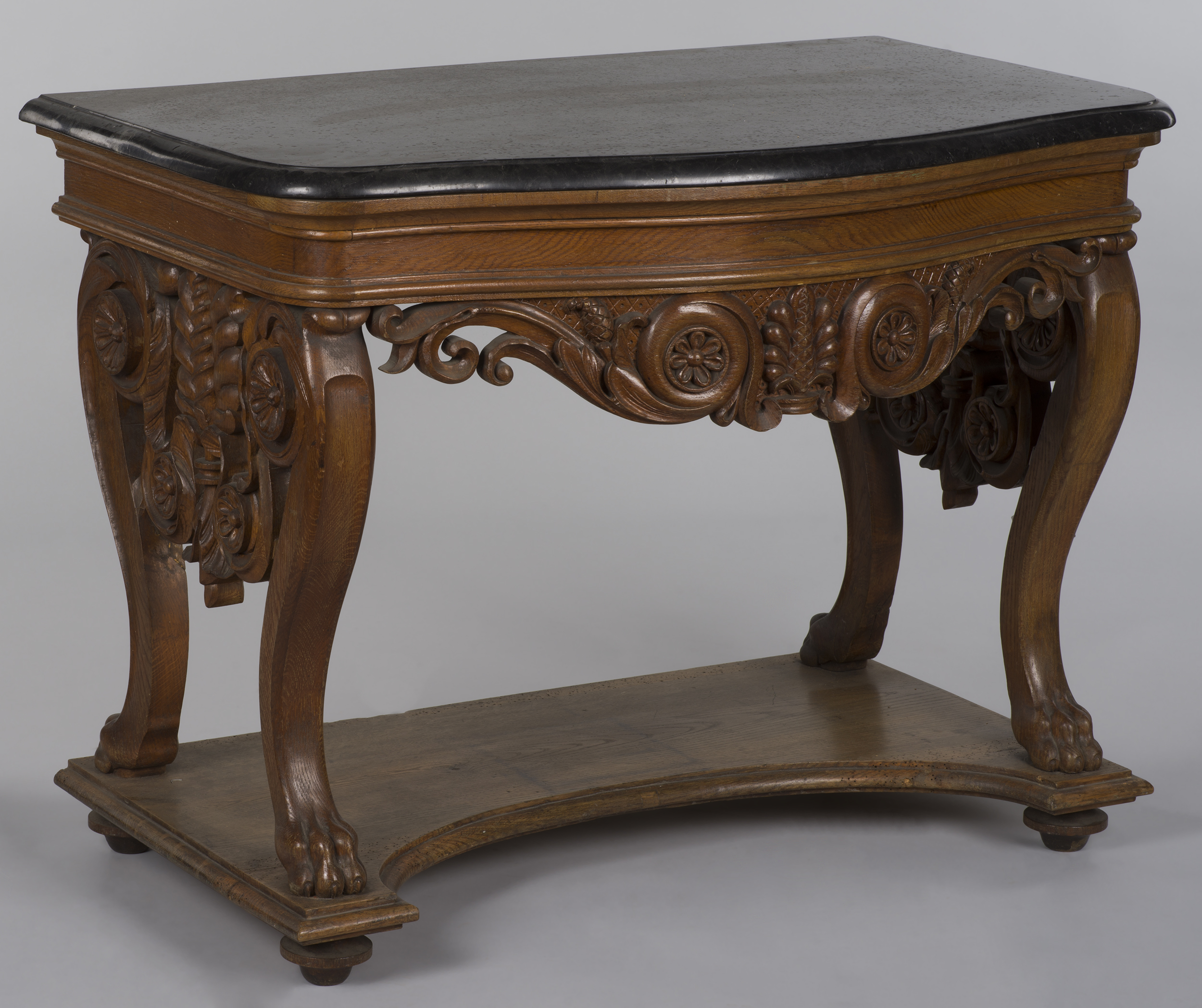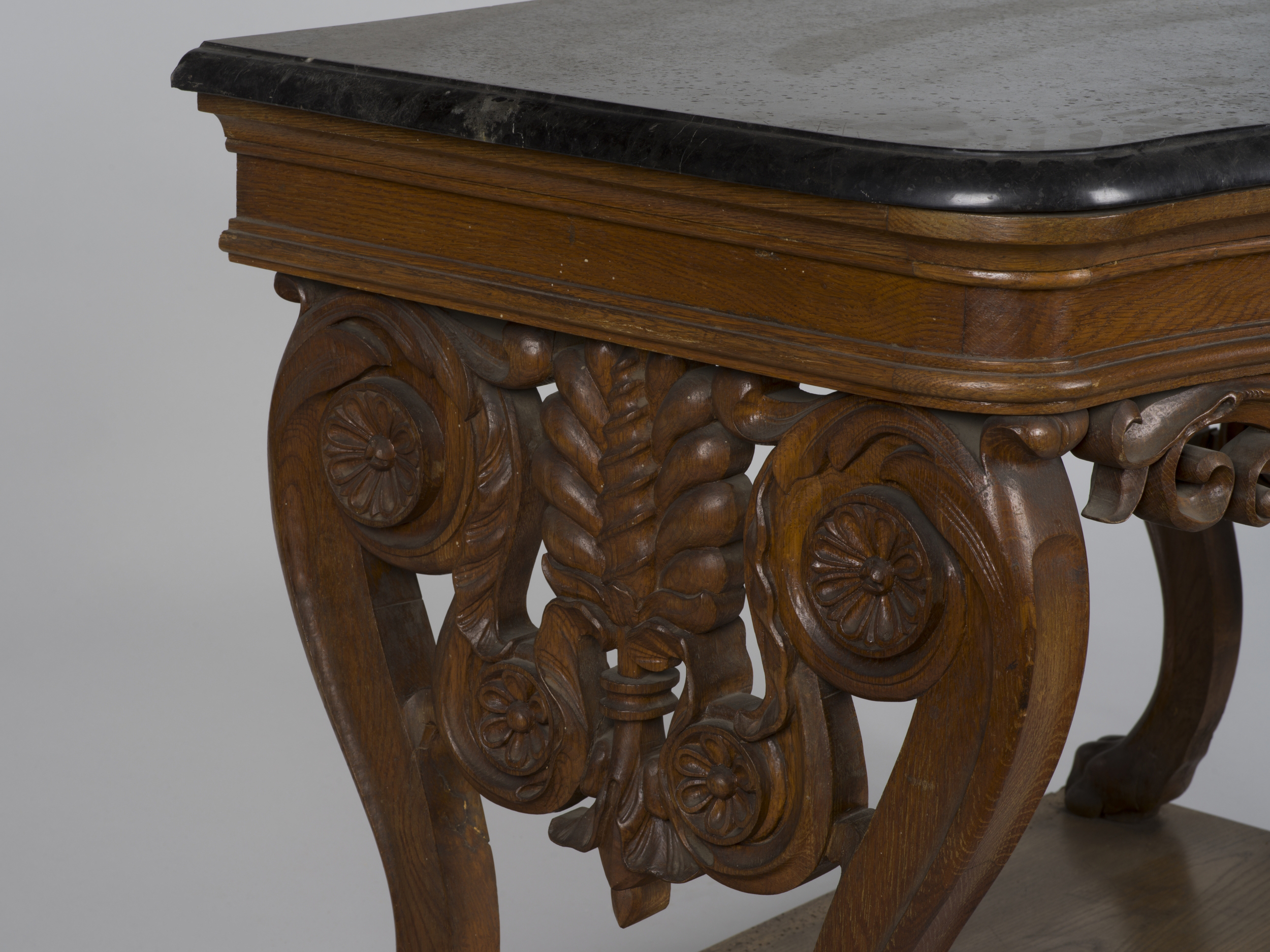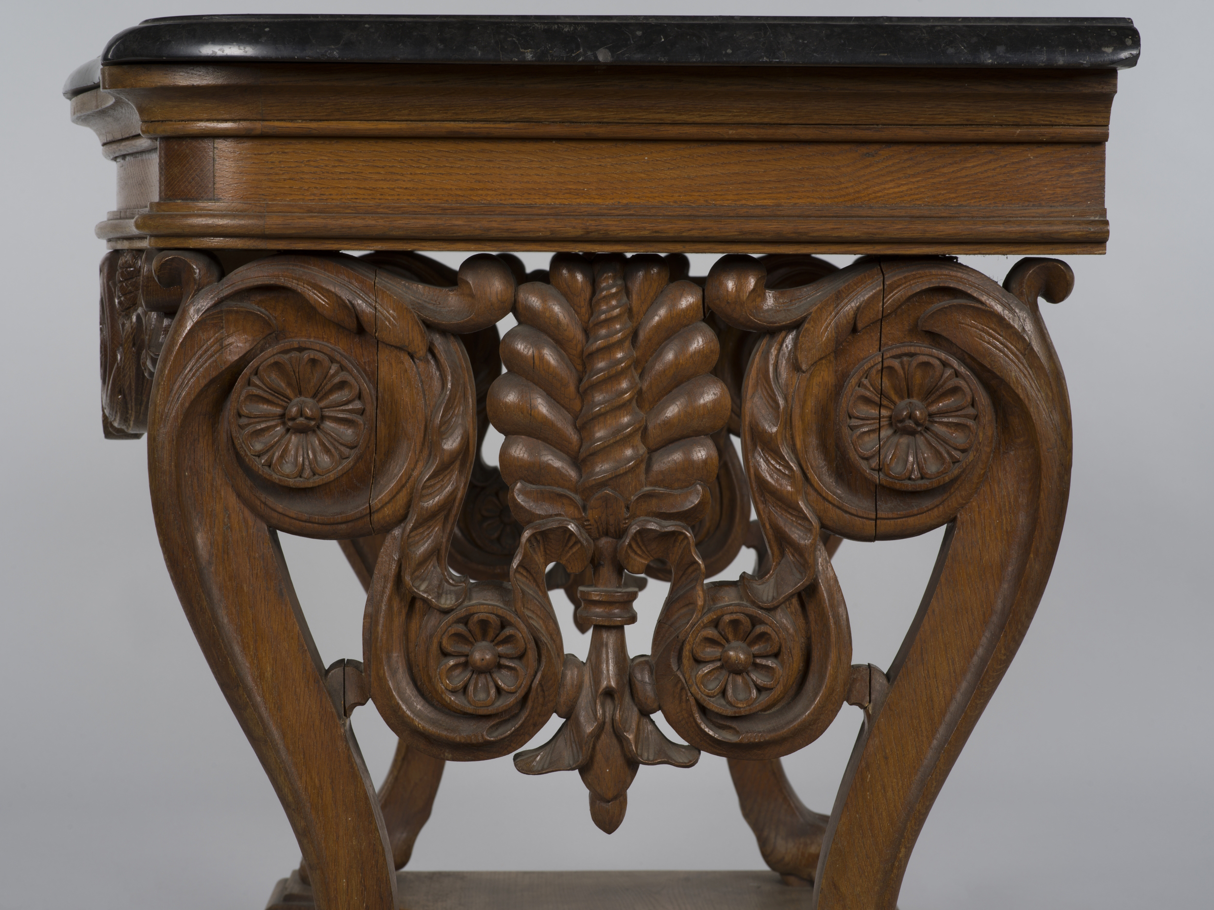 Konsola należy do grupy mebli, które pojawiły się w wilanowskiej Galerii Malarstwa dzięki inicjatywie Aleksandra Potockiego. Wzorem były ławy galeryjne odlewane z cynku zaprojektowane przez Friedricha Augusta Stülera (1800-1865) będące wyposażeniem Neue Museum w Berlinie. Posługując się wzornikiem projektów Stülera na zlecenie hrabiego wykonano w warszawskim warsztacie komplet dębowych mebli galeryjnych, w skład którego wchodziło sześć ław, osiem taboretów i dwie konsole z czarnymi marmurowymi blatami. Tylko nieliczne z nich zachowały się do dzisiaj; jednym z nich jest prezentowana konsola. Mebel charakteryzuje się solidną konstrukcją oskrzynienia z marmurowym blatem opartym na dwóch policzkowych podporach z czterema nogami w kształcie zwierzęcych łap stojących na desce wiązania. Zaczerpnięte z berlińskiego wzornika symetryczne, rzeźbione ażurowo kompozycje zwojów liści i kwiatów akantu dekorują policzkowe podpory, powtórzone zostały w wersji uproszczonej zdobiąc przód mebla. Wszystkie elementy konstrukcyjne materiał, konstrukcja, nawet dekoracje wpływają na stabilność mebla.