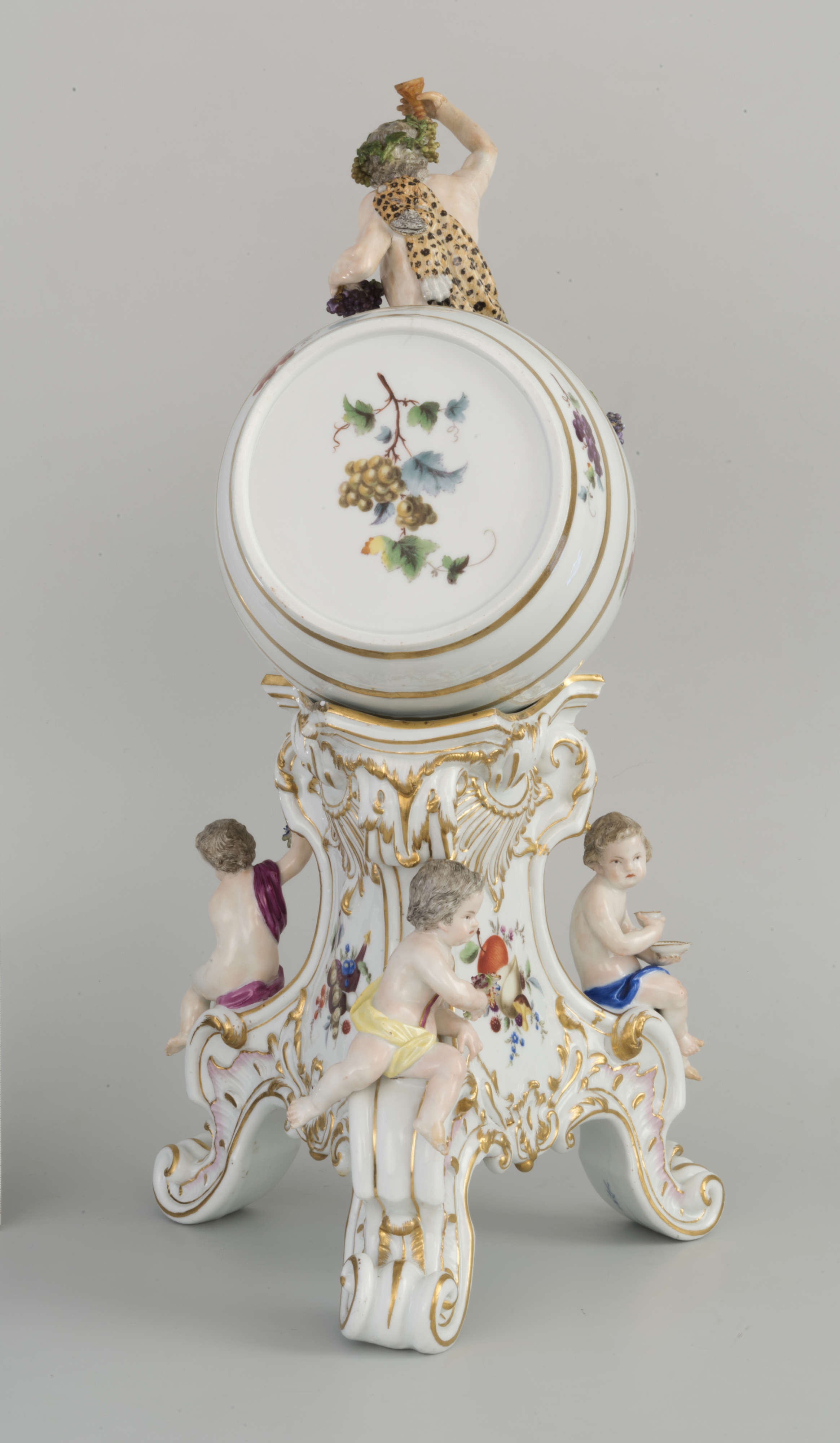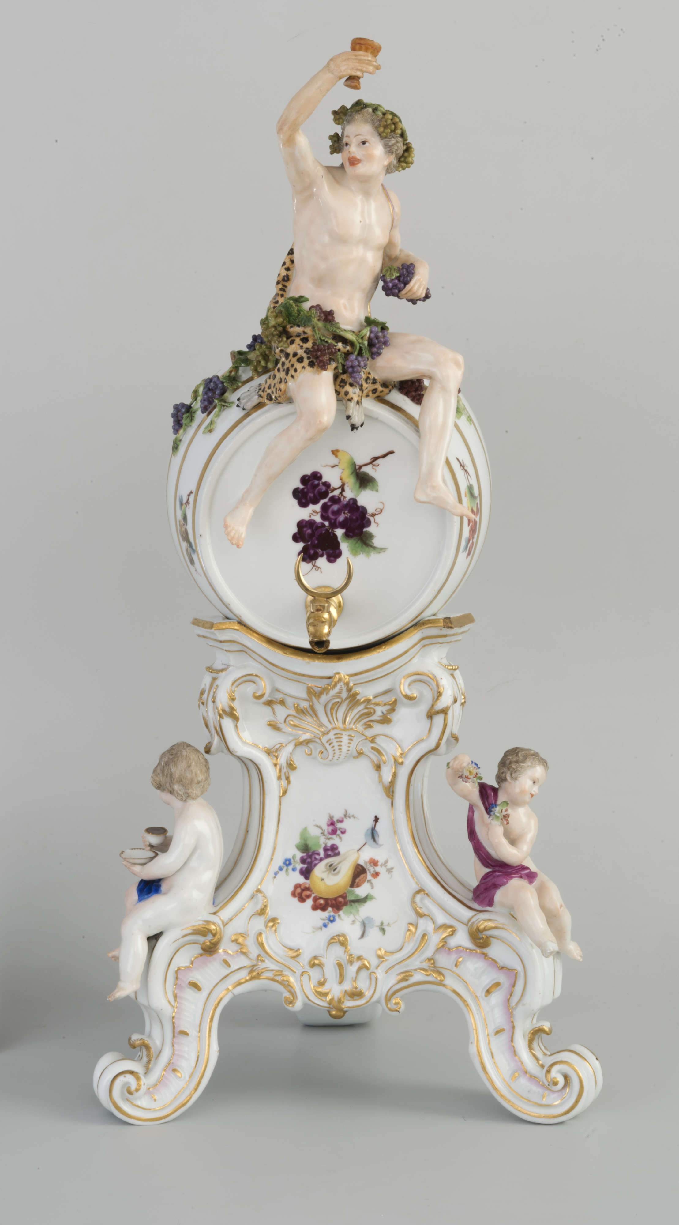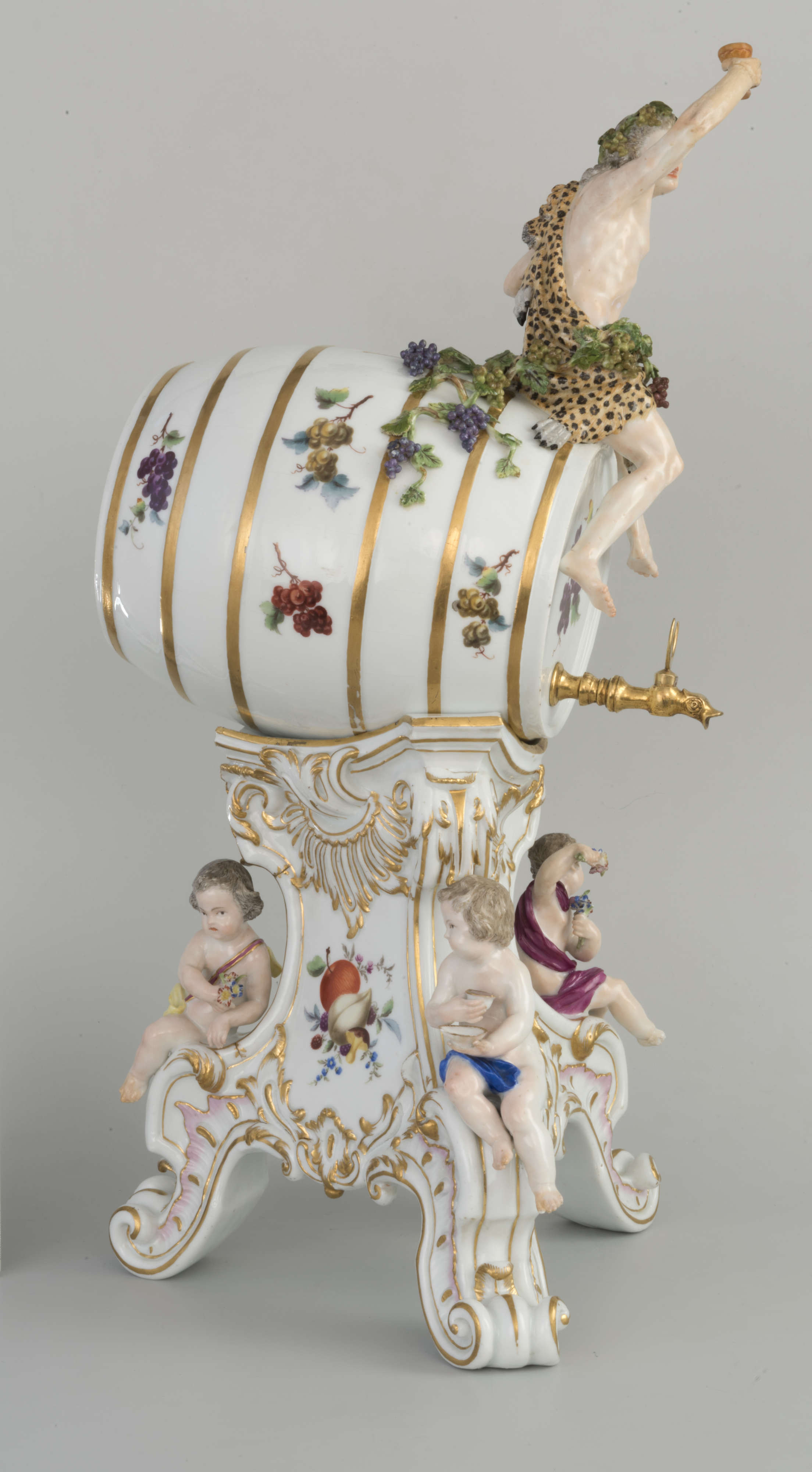 Miśnia i znajdująca się tam manufaktura zasłynęły nie tylko z wyrobu porcelanowych stołowych garniturów, ale przed wszystkim z niezliczonej ilości rzeźb i figurek, których zadaniem było urozmaicenie nakrycia stołu, a z czasem jego nieodzownym elementem. Miśnieńscy artyści, tacy jak Eberlein Johann Friedrich, którego autorstwa przedmioty znajdują się w Muzeum Narodowym w Lublinie, w malowanych figurkach uwieczniali postaci ludzkie i zwierzęce. Porcelanowe rzeźby umilały swoim właścicielom oraz ich gościom nie tylko picie kawy czy herbaty, ale także wina. Tym samym nie dziwi fakt, że na porcelanowej beczułce rozsiadł się Bachus – rzymski bóg dzikiej natury, winnej latorośli i wina. Postać w jednej dłoni ściska winne grono, a w drugiej, uniesionej w geście toastu, dzierży złoty puchar zachęcający biesiadników do odkrycia dobroczynnego i upajającego wpływu zamkniętego w białej beczce trunku.