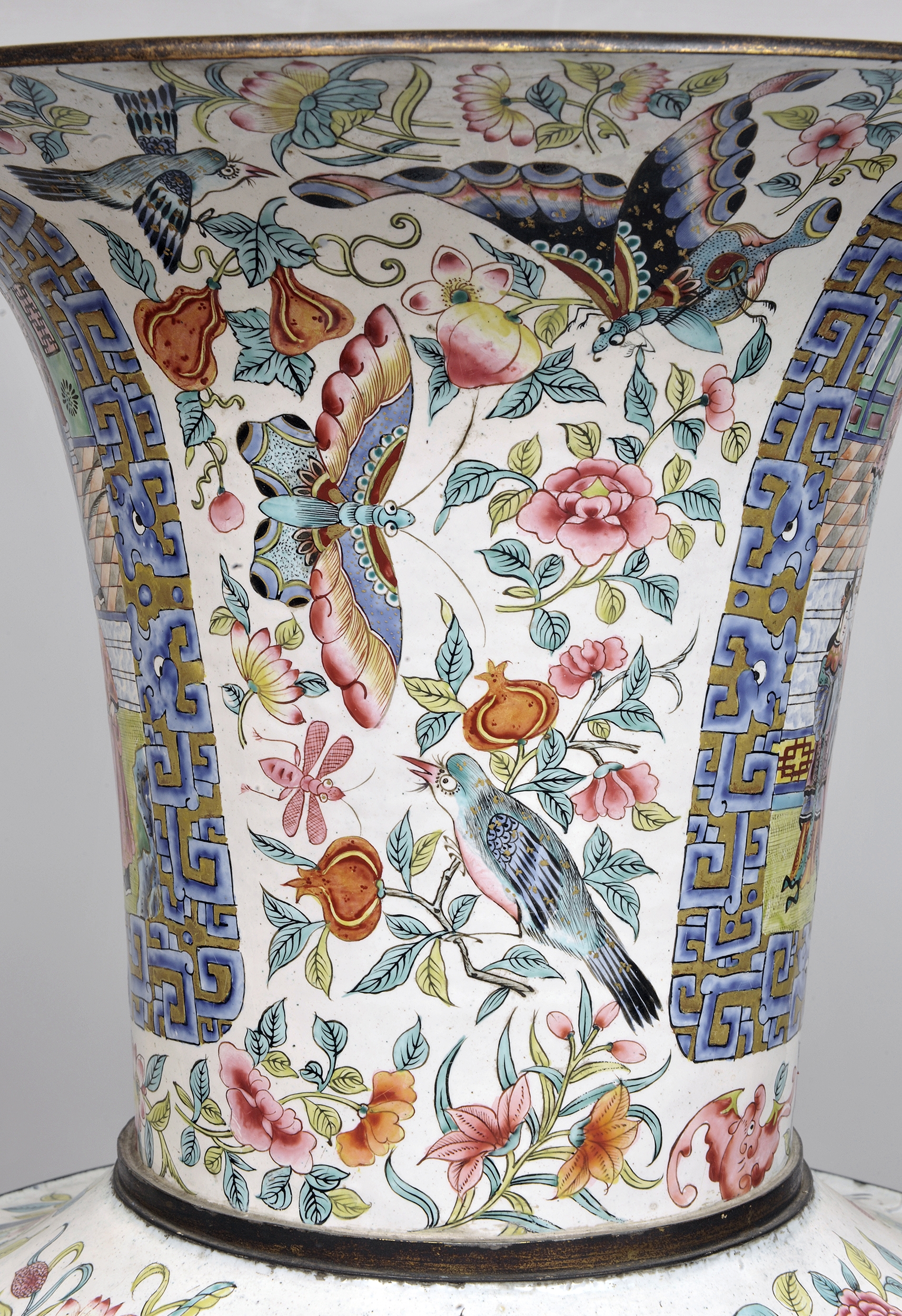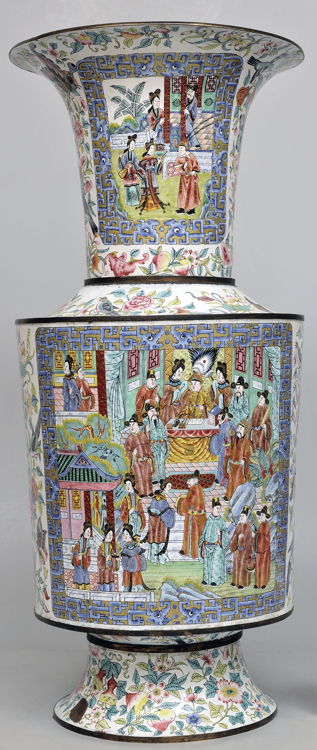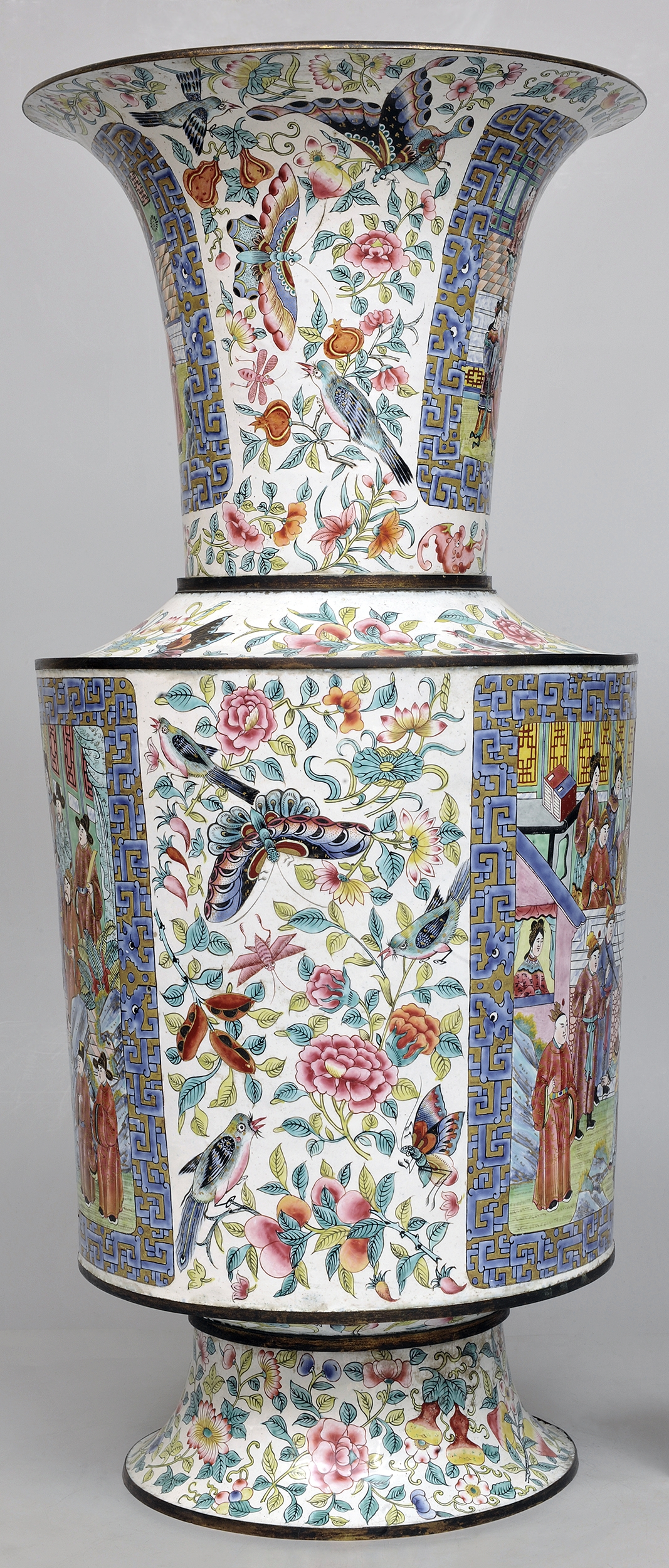 Duży wazon o cylindrycznym kształcie, na wysokiej, rozszerzającej się ku dołowi stopie, z długą cylindryczną szyją rozszerzającą się ku wylewowi. Cała powierzchnia naczynia ozdobiona jest pięknymi motywami zaczerpniętymi z fauny i flory – różnorodnymi kwiatami i owocami – m.in. peonii, lotosu, brzoskwini, oraz ptakami, motylami, nietoperzami i cykadami. Symetrycznie na brzuścu i szyi umieszczono po dwie rozległe prostokątne rezerwy – pola wyodrębnione krawędzią, wypełnione dekoracją – w tym przypadku z rozbudowanymi scenami figuralnymi, które obiegają pasy niebieskich ornamentów na złotym tle.
