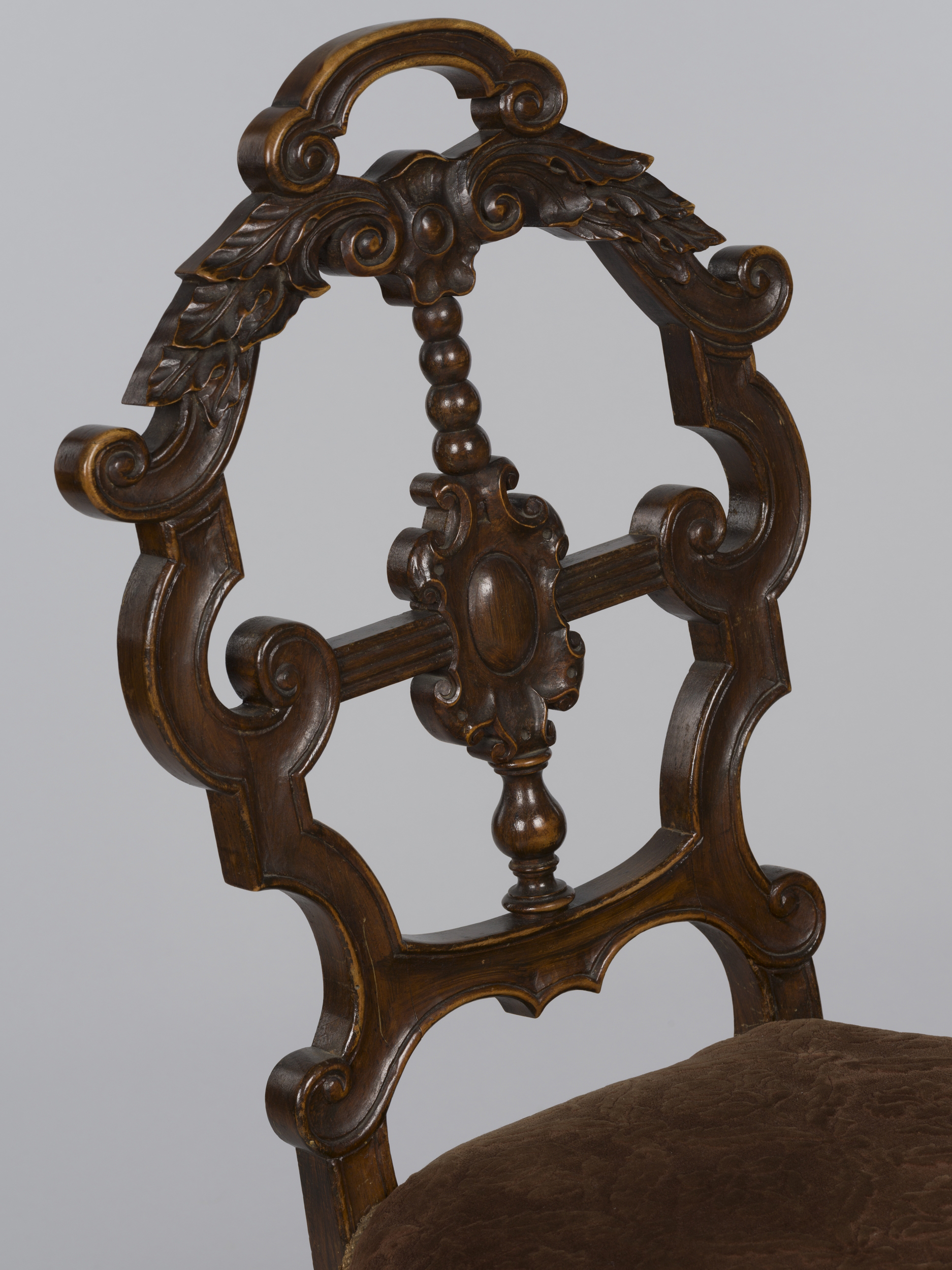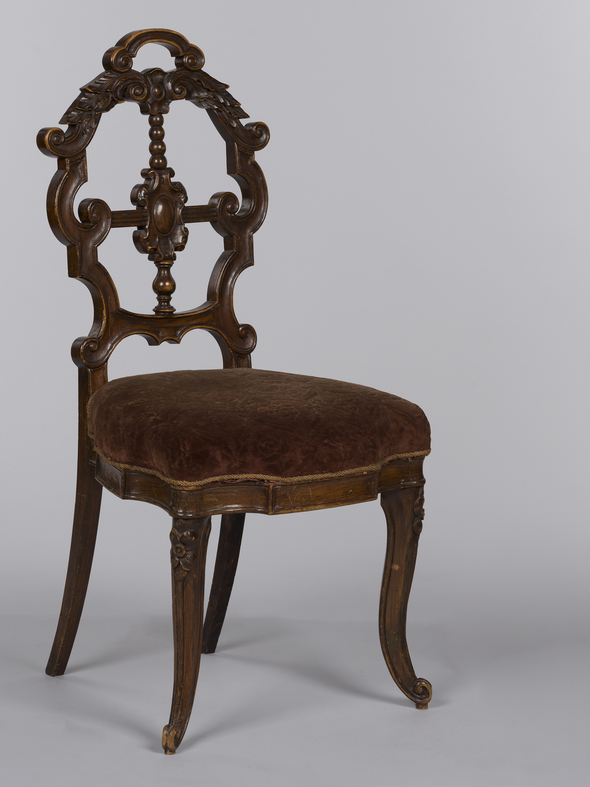 Krzesło o siedzisku w kształcie zbliżonym do trapezu, o faliście podkrojonych przednich narożnikach. Przednie nogi kabriolowe, francuskie, o wolutowych stopkach i kolanach ozdobionych płaskorzeźbionymi bukietami róż. Tylne nogi są szablaste, czworoboczne w przekroju, odgięte lekko do tyłu a powyżej siedziska przechodzące w krótkie ramiaki boczne oparcia. Oparcie jest ażurowe, rzeźbione, w formie wspartego na bocznych ramiakach owalnego medalionu uformowanego z ornamentu wstęgowego. Góra medalionu ma formę pary wolutowych spływów, ozdobionych dwiema girlandami z liści dębowych, spiętymi od góry łukowatą klamrą, stanowiącą uchwyt. Wypełnienie oparcia stanowi krzyżak złożony z poziomej poziomo żłobionej listwy, pionowego rzędu czterech kul od góry i małej tralki u dołu. Na zbiegu tych elementów znajduje się rollwerkowy kartusz z owalnym dużym kaboszonem pośrodku. Siedzisko jest tapicerowane, obite ciemnoczerwonym tłoczonym pluszem z kwiatowym deseniem.
