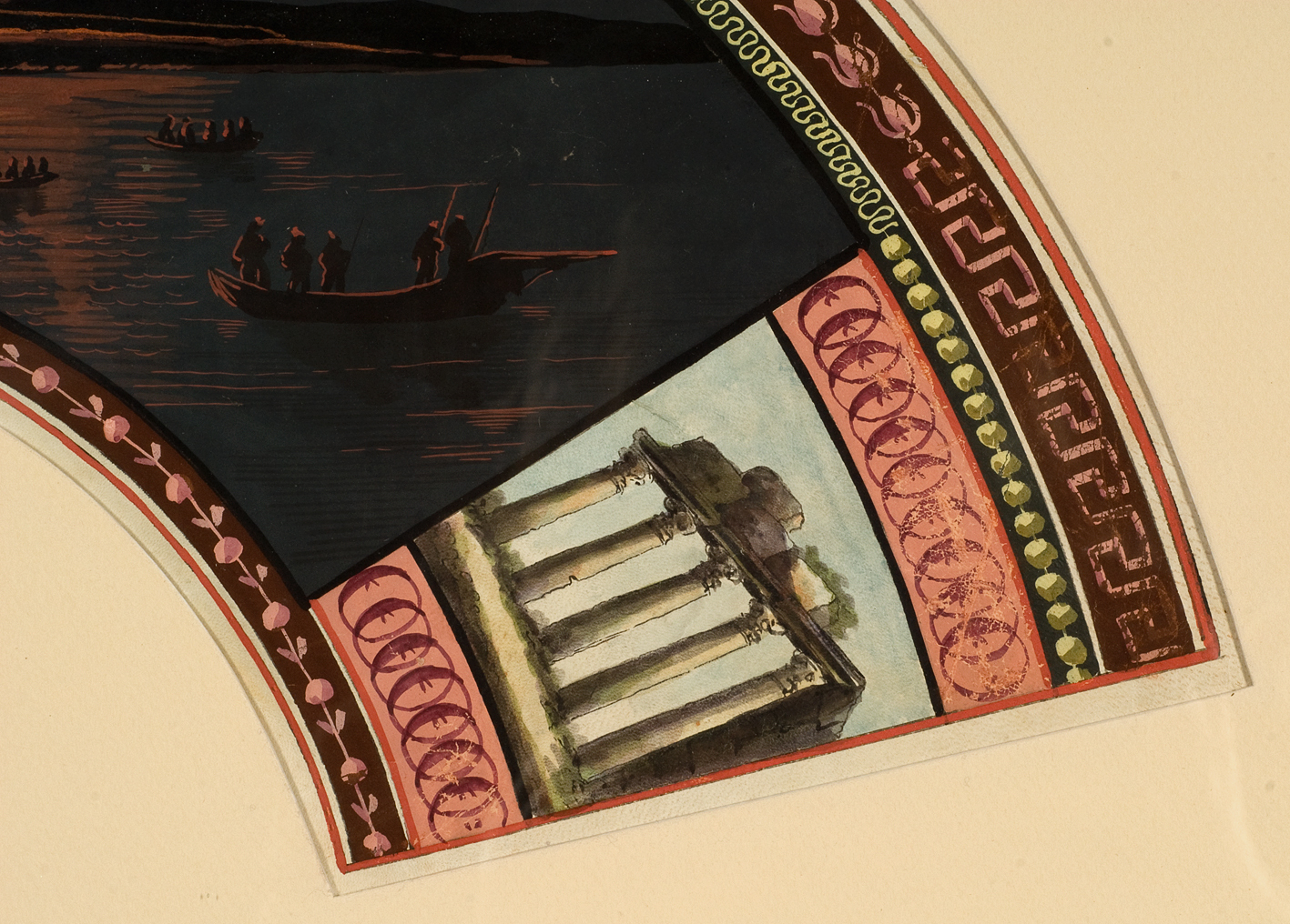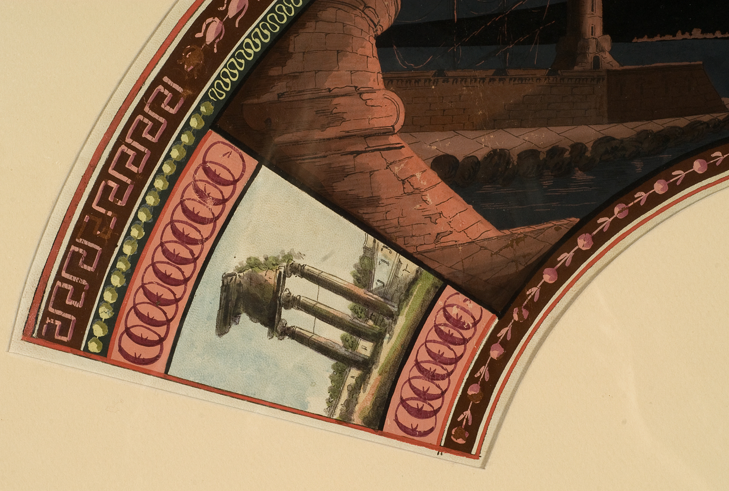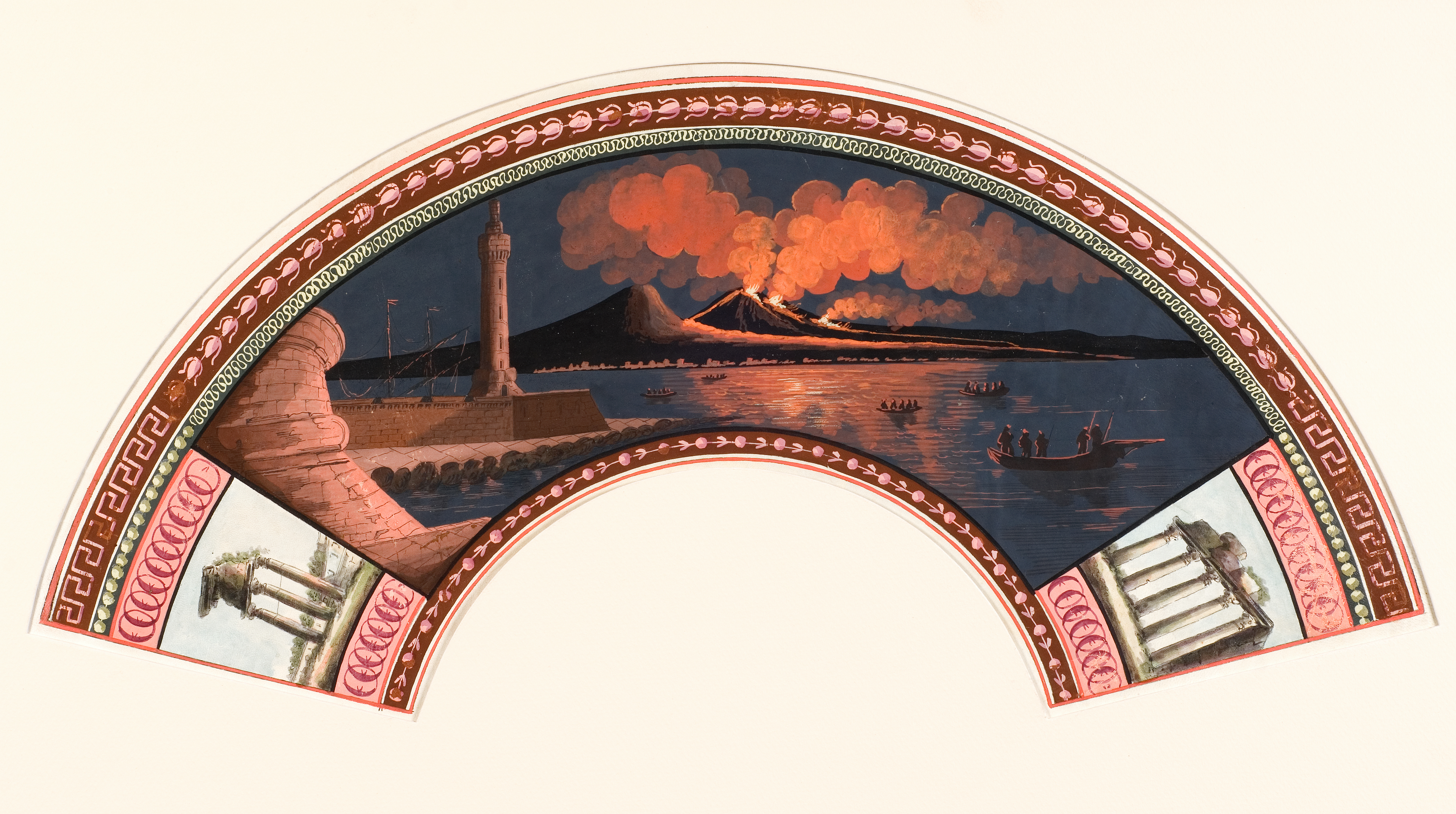 Opisane pokrycie wachlarza należy do kolekcji pokryć 16 wachlarzy zakupionych do zbiorów MZŁ; 11 z nich, w tym opisane, tworzy cykl dekorowany ruinami budowli starożytnych autorstwa tego samego malarza. Jako jedyne z nich centralnie umieszczony na nim widok nie przedstawia ruin a pejzaż nocny z wybuchającym wulkanem, flankowanym jednak jak pozostałe widokami ruin.