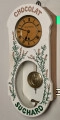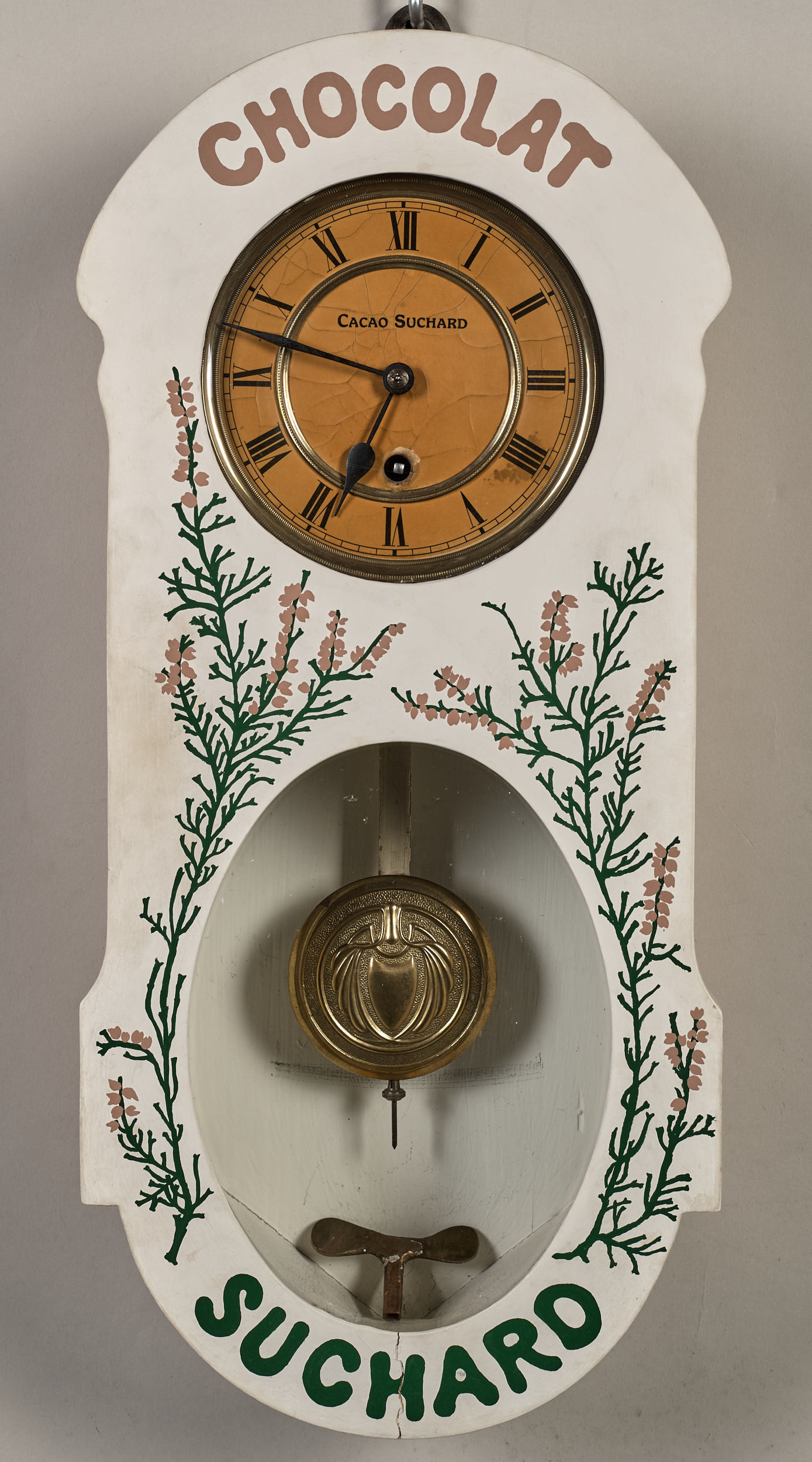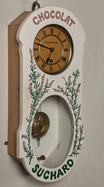 Bardzo oryginalny zegar reklamowy firmy Suchard. Ścianka frontowa skrzynki zegarowej zdobiona jest motywem lawendy i napisem CHOCOLAT SUCHARD. W ściance znajdują się dwa otwory, z których górny pozwala obserwować białą, emaliowaną tarczę zegara z wykonanymi w kolorze czarnym cyframi rzymskimi. Poniżej znajduje się owalny otwór, przez który widoczna jest praca wahadła. Przypuszcza się, że mechanizm zegara wykonała niemiecka firma Junghans na zamówienie Sucharda.