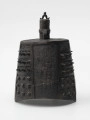 Choć na reliefowo zdobionym płaszczu omawianego dzwonu pojawia się motyw mei w formie kolców lub guzków, to taotie zastąpiono inskrypcją w chińskim piśmie małopieczęciowym oraz przedstawieniem wężowatych stworzeń – być może smoków – na tle meandrowego ornamentu. Na płaskim hełmie pojawiają się też rysunki ptaków. Korona w formie trzpienia zakończonego niewielkim pałąkiem na szczycie oraz drugim umocowanym z boku za pomocą okrągłej obejmy sugerują, że jest to zawieszany ukośnie yongzhong.