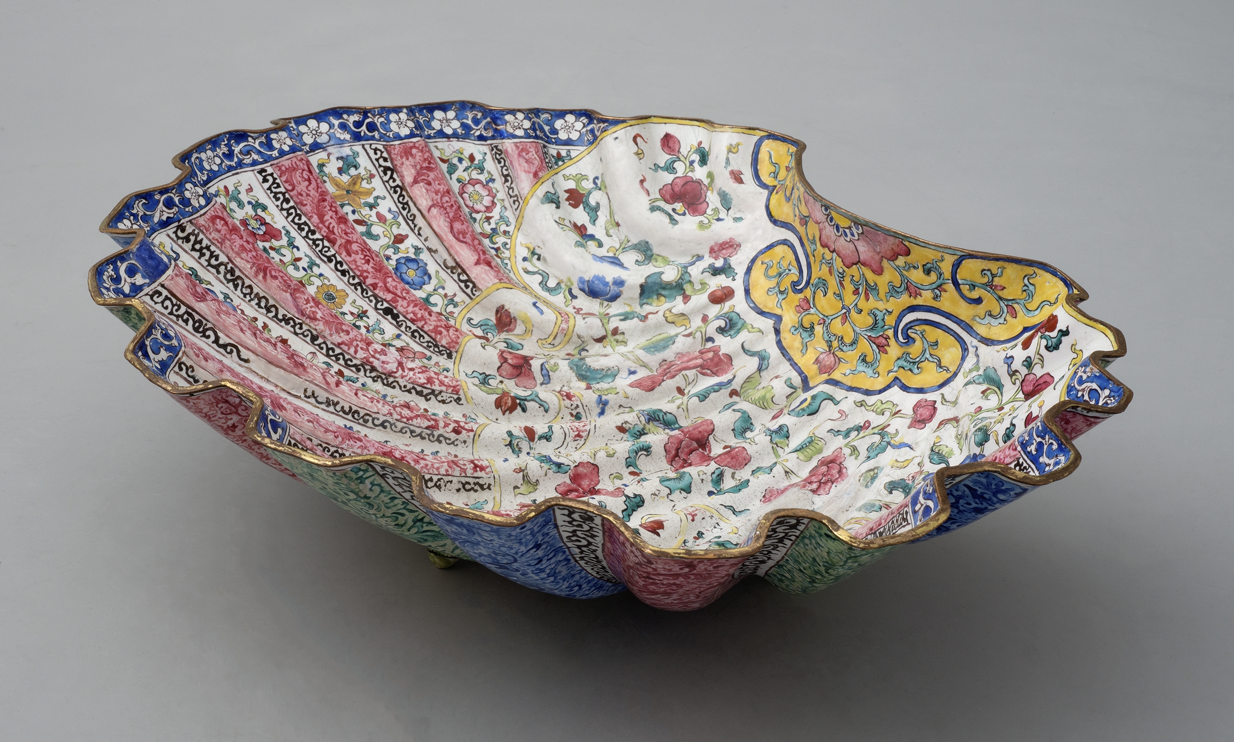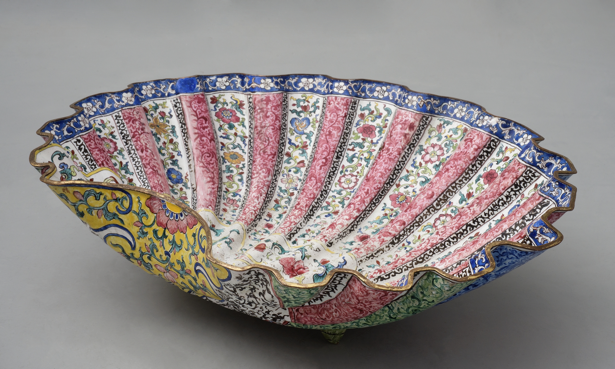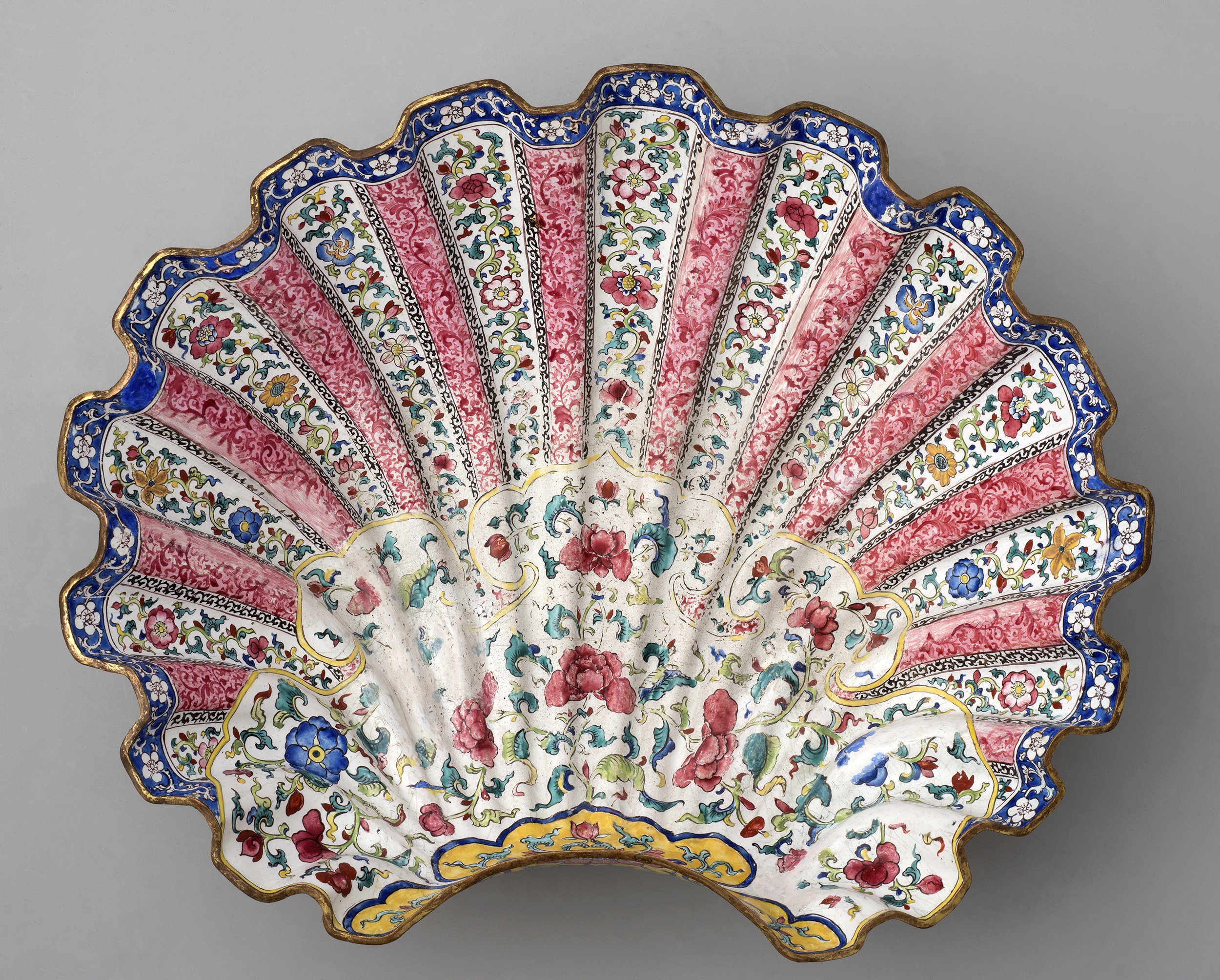 Miedziana misa w kształcie żeberkowanej muszli wsparta na trzech niewysokich nóżkach. Całe naczynie pokrywa dekoracyjna emalia. Pofalowana powierzchnia misy została ozdobiona naprzemiennie pasami ornamentów, których kolorystyka dodatkowo podkreśla kształt naczynia. W dolnej części umieszczono dwie rezerwy, czyli pola z wyodrębnioną krawędzią, wypełnione dekoracją. Kształt rezerw nawiązuje do ruyi, chińskiego berła. Pierwszą, większą, zdobi stylizowany ornament floralny z bujnie kwitnącymi kwiatami peonii. Drugą, mniejszą, na żółtym tle, wić floralna o bardziej uporządkowanej strukturze. Rewers naczynia, czyli jego spodnią część, również pokrywa dekoracja.