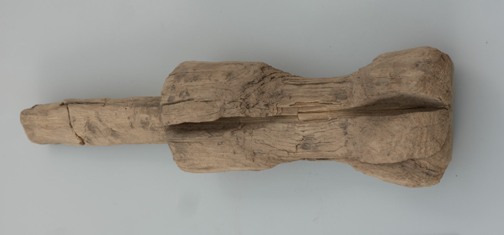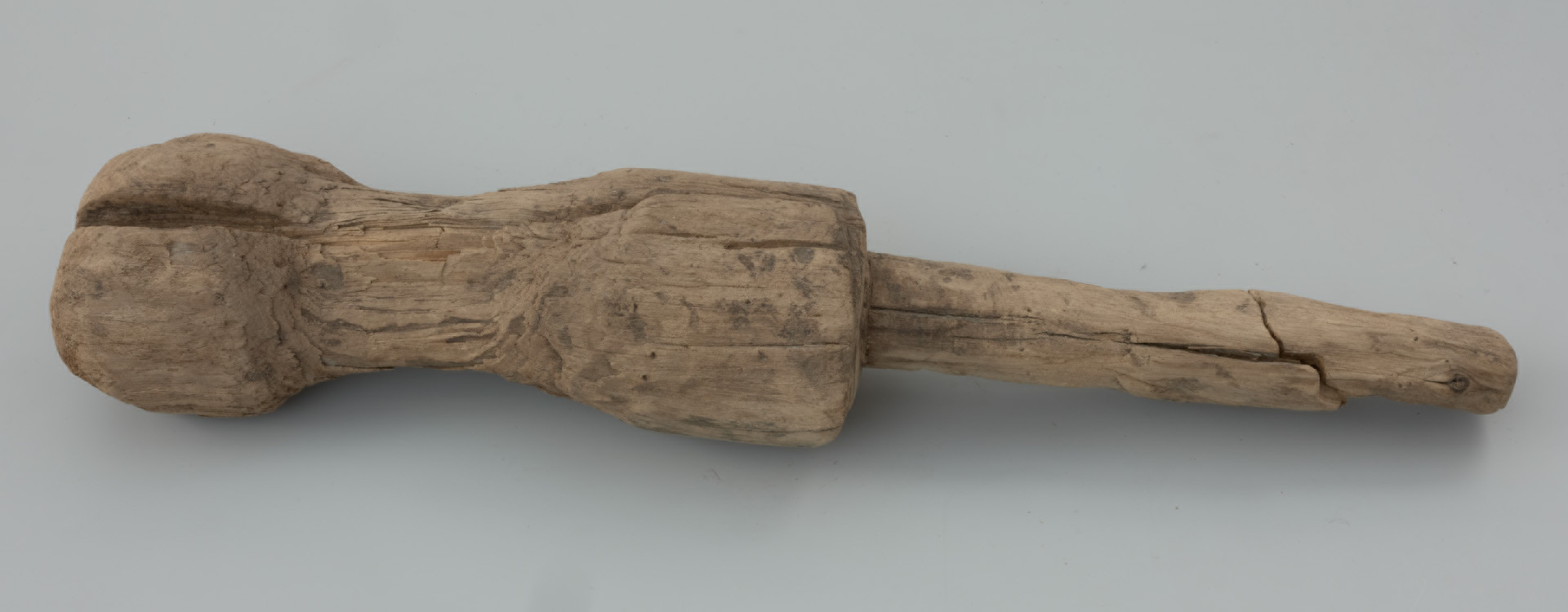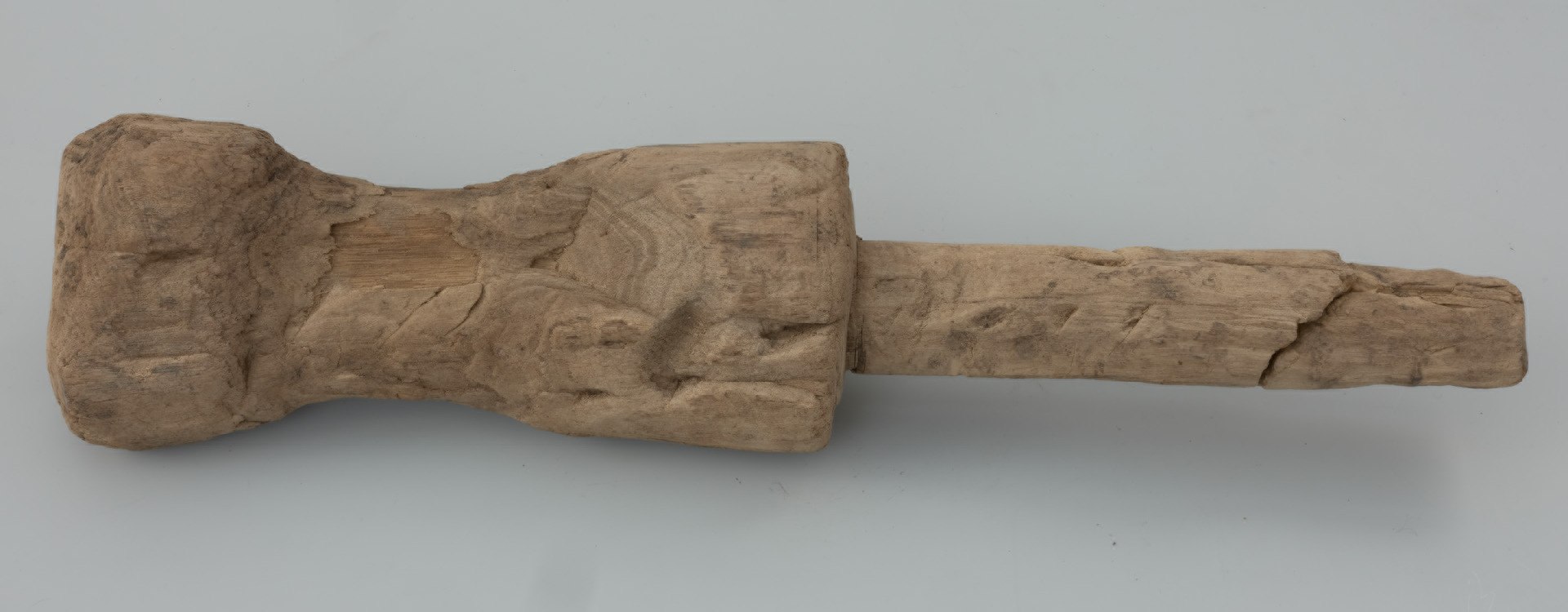 Pałkę ciesielską odkryto podczas badań wykopaliskowych w 1992 roku na szczecińskim Podzamczu, w obrębie kwartału pomiędzy ulicami Panieńską, Rybaki, Środową i Rynkiem Warzywnym. Spoczywała w warstwie kulturowej datowanej na XII wiek. Tak zwane pałki ciesielskie, drewniane narzędzia wycinane z jednego kawałka drewna, z wyraźnie wyodrębnionym trzonkiem, miały szerokie zastosowanie. Posługiwano się nimi przy budowie domostw, łodzi, pomostów i umocnień obronnych. Za ich pomocą możliwe było wbijanie drewnianych pali, kołków oraz różnej wielkości klinów służących to darcia pnia drzewa na mniejsze części, tzw. dranice, które wykorzystywane były do budowy nawierzchni ulic i innych obiektów drewnianych. Mogły być również wykorzystywane do pobijania innych narzędzi – dłut, przecinaków, rylców. W zależności od rodzaju wykonywanych prac używano pałek ciesielskich różnej wielkości, najczęściej z twardego, odpornego na uszkodzenia drewna dębowego lub jesionowego. Znaleziona w Szczecinie pałka ciesielska ma owalny w przekroju trzonek oraz pobijak – część „pracującą”. Na powierzchni wciąż widoczne są podłużne ślady precyzyjnego strugania wykonane najpewniej ostrym nożem, a także niewielkie, także podłużne wgłębienia, świadczące o użyciu żelaznej ciosły.