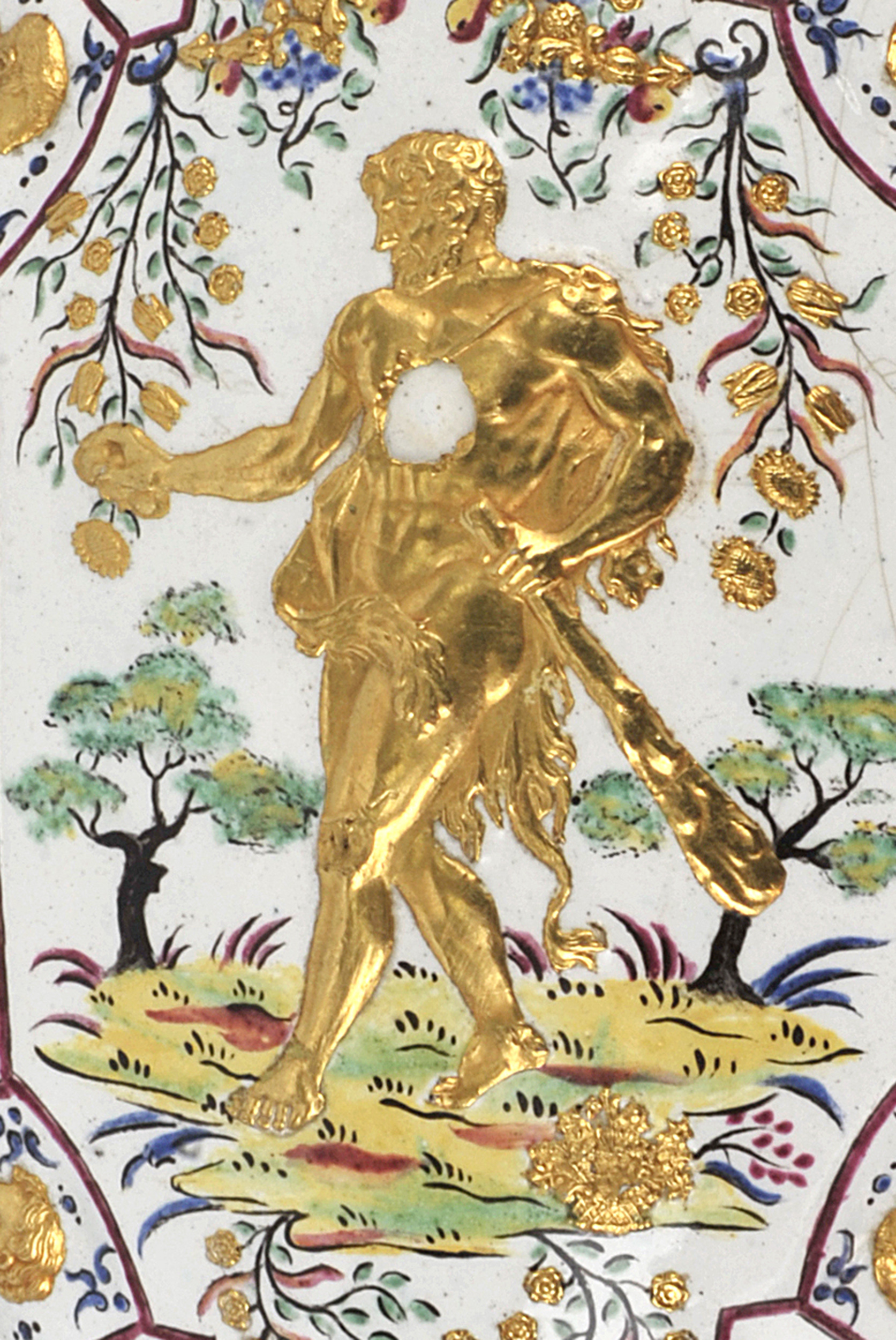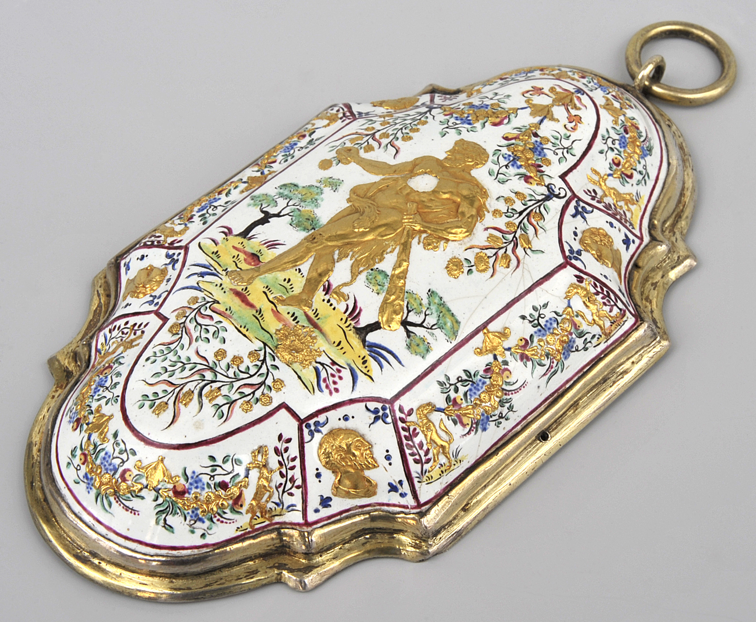 Oprawa do szczotki powtarza w kształcie formę pokryw prostokątnych szkatułek o zaokrąglonych węższych bokach, z czterema półokrągłymi wcięciami na szerszych. Wypukły wierzch pokrywa całkowicie emalia z nałożonymi misternie cyzelowanymi złotymi ornamentami. Pośrodku widoczna postać Herkulesa z maczugą, niosącego jabłka z ogrodu Hesperyd dla króla Myken Eurysteusza. Skośne brzegi pokrywy zdobią nałożone na powierzchnię emalii misternie cyzelowane złote nakładki z główkami oraz girlandki i zwierzęta.