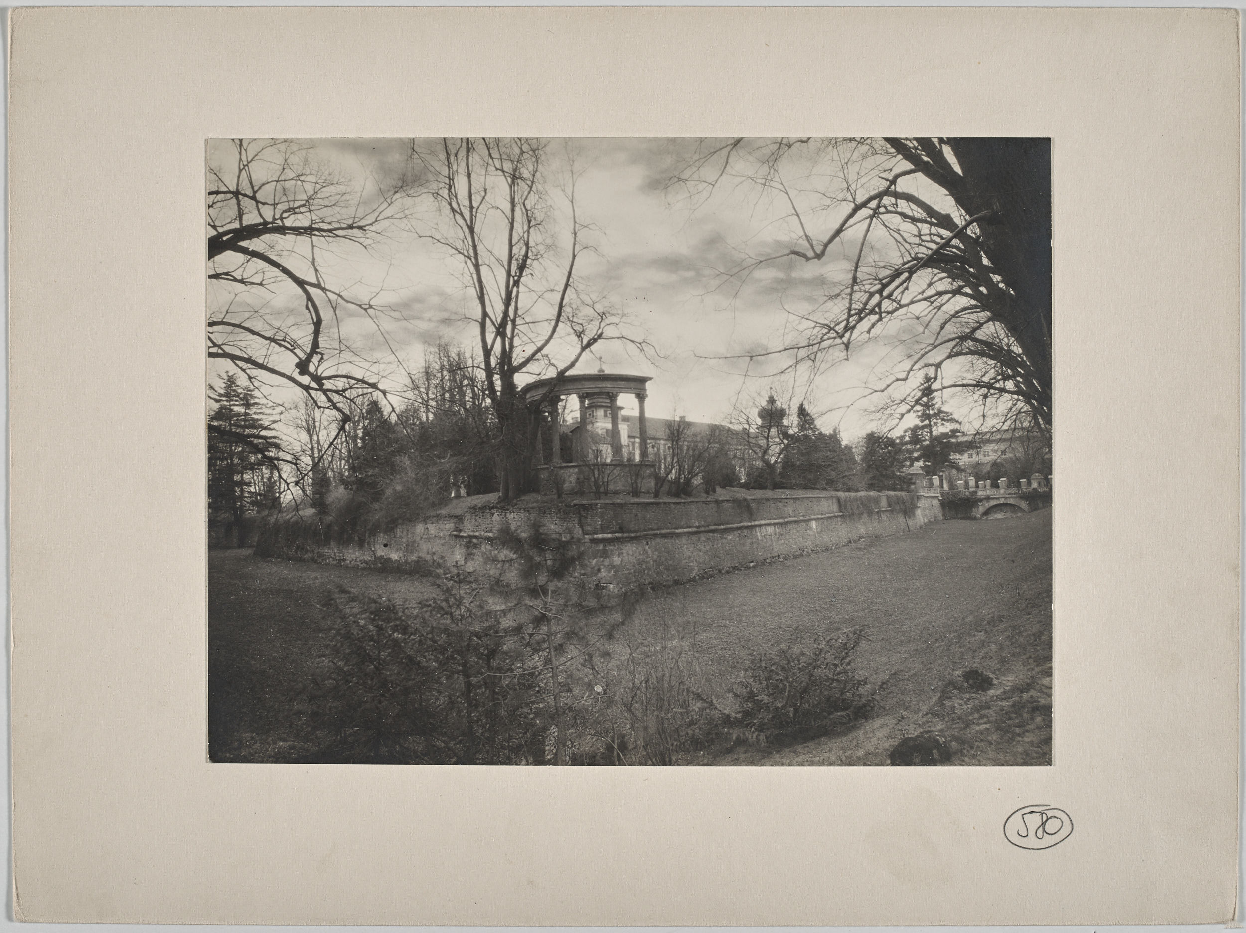Fotografia przedstawia fragment fosy z murami od strony północno - zachodniej z gloriettą oraz w dalszym planie most główny od strony zachodniej a także fragment zachodniej elewacji zamku i oranżerii. Fosa wraz z murami i wałami ziemnymi tworzyły wzniesione w XVII wieku fortyfikacje łańcuckie. W końcu XVIII wieku system ten był już nieużyteczny - założono więc wewnątrz fosy, w bezpośrednim otoczeniu zamku pierwszy ogród a wokoło fosy zasadzono po rozsunięciu wałów, obiegające fosę aleje lipowe. Klasycystyczna glorietta, usytuowana w narożu północno - zachodnim wewnątrz murów, podobnie jak w tym samym stylu oranżeria usytuowana od południa zostały zaprojektowane dla ks. Izabelli Lubomirskiej (zm. w 1816 r), przez Chrystiana Piotra Aignera. Podczas modernizacyjnych prac w rezydencji łańcuckiej, na przełomie XIX i XX wieku prowadzonych przez III ordynata Romana Potockiego i jego żonę Elżbietę z Radziwiłłów, wzniesiono w miejscu poprzedniego, nowy, kamienny most główny z balustradą ozdobioną rzeźbami puttów i orłów oraz wazami, w których od wiosny do jesieni, sadzono rośliny ozdobne.