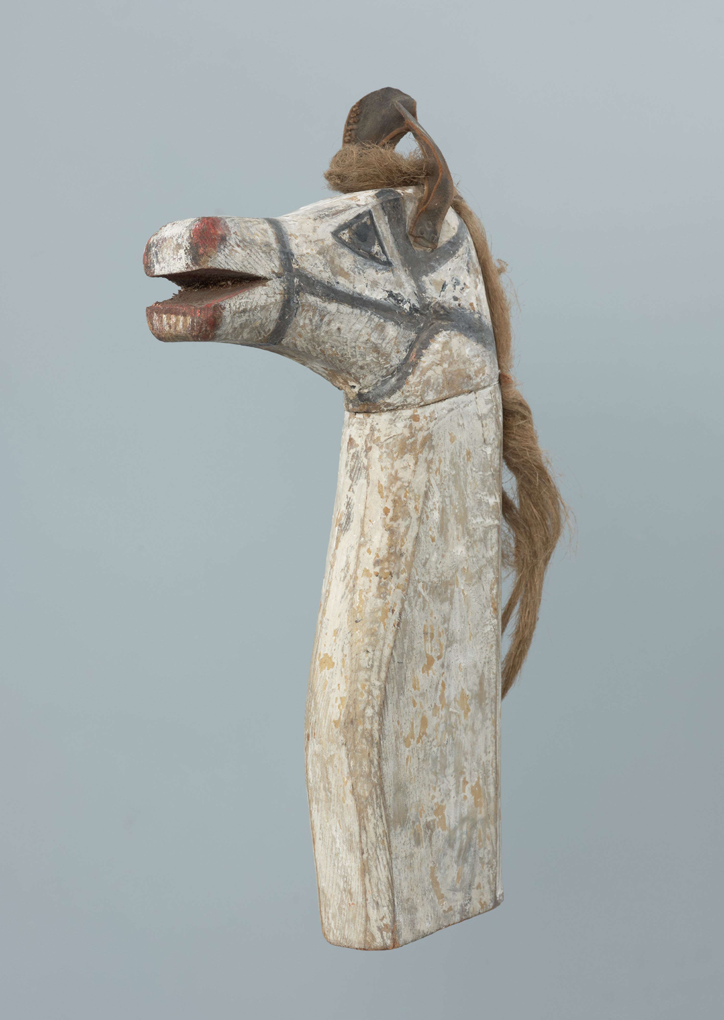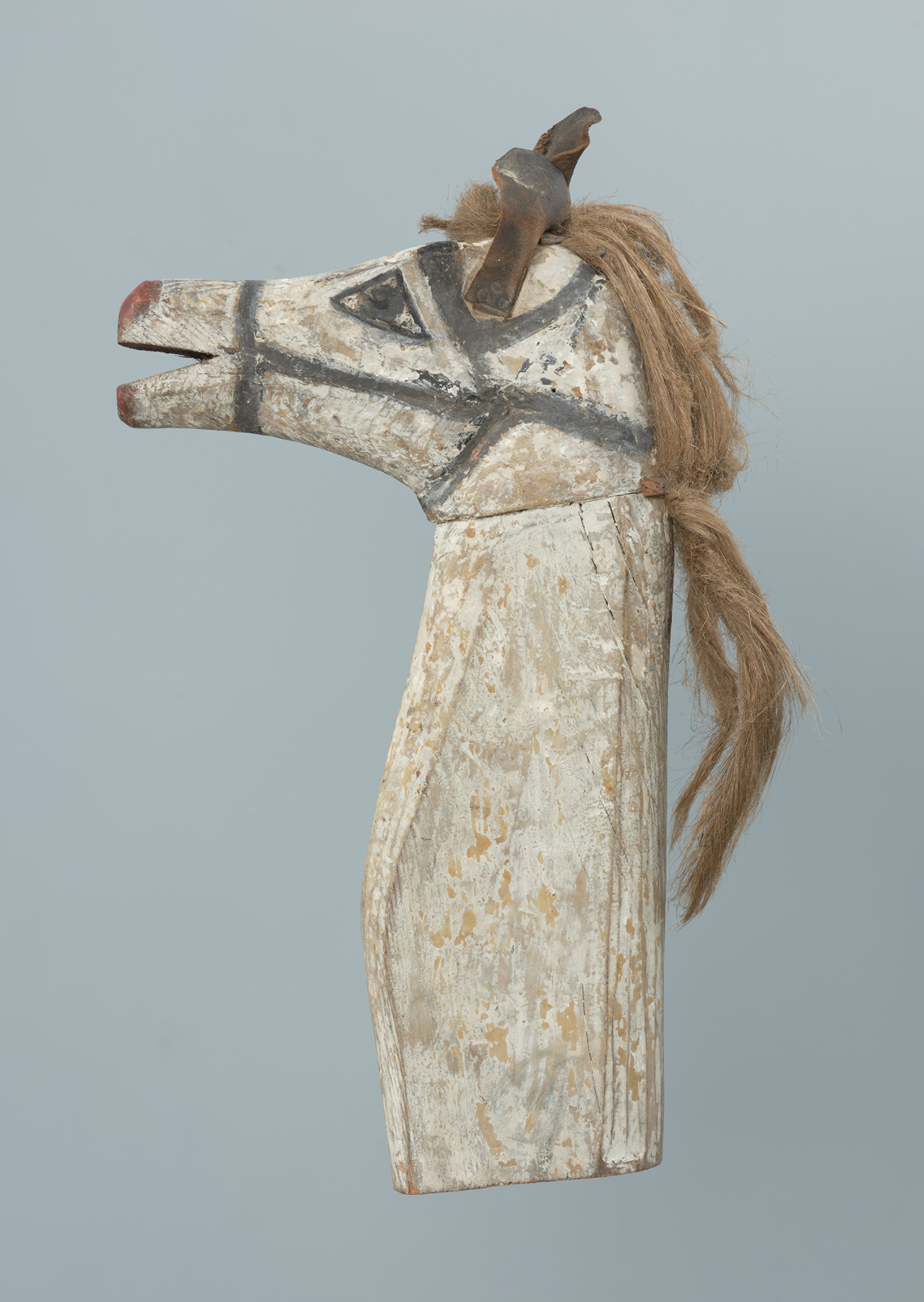 Zwierzęce maszkary, wśród nich koniki, to rekwizyty obrzędowe, wykorzystywane przez grupy kolędnicze, które w okresie bożonarodzeniowym i zapustnym odwiedzały domostwa i składały ich mieszkańcom życzenia pomyślności i bogatych plonów. Zwyczaj ten, którego korzeni możemy dopatrywać się w wierzeniach słowiańskich, praktykowany był jeszcze w 1. połowie XX wieku. Prezentowany konik obrzędowy jest wyrobem amatorskim, jednostkowym. Pochodzi ze wsi Daminca (pow. słupski). Wykonana z drewna, realistycznie przedstawiona głowa konia pomalowana jest na biało, co jest charakterystyczną cechą koników obrzędowych, biały koń jest bowiem symbolem życia. W wierzeniach ludowych wielu kultur koń jest zwierzęciem, któremu przypisuje się związek z płodnością, zdrowiem, siłą, męstwem i dumą. Z symboliki tej wynikała obecność konika w grupie kolędników – wesoło harcujący po izbie i składający razem z pozostałymi postaciami życzenia konik, miał przekazywać mieszkańcom te właśnie cechy. W niektórych regionach znany był zwyczaj kolędowania z przystrojonym wstążkami i kwiatami z papieru żywym zwierzęciem.